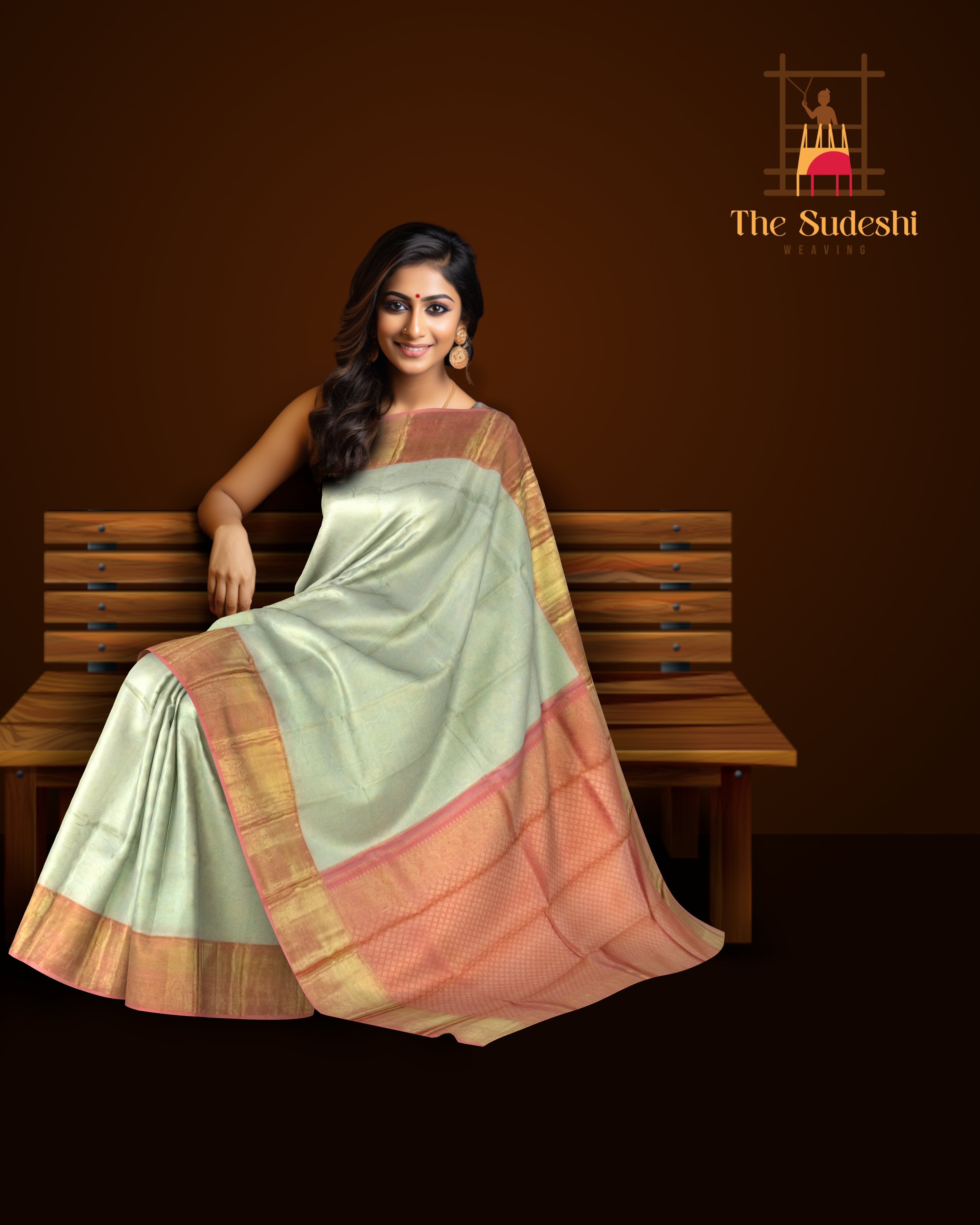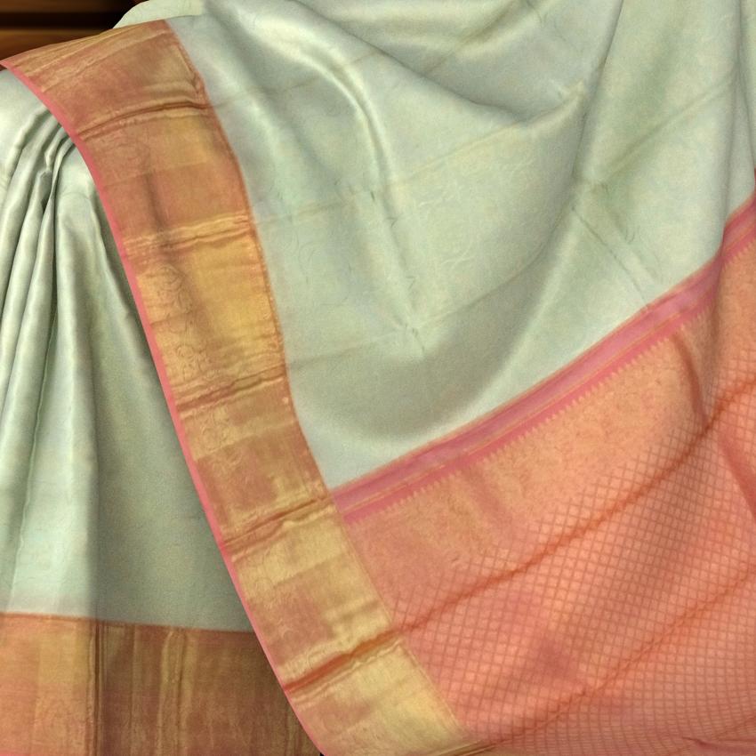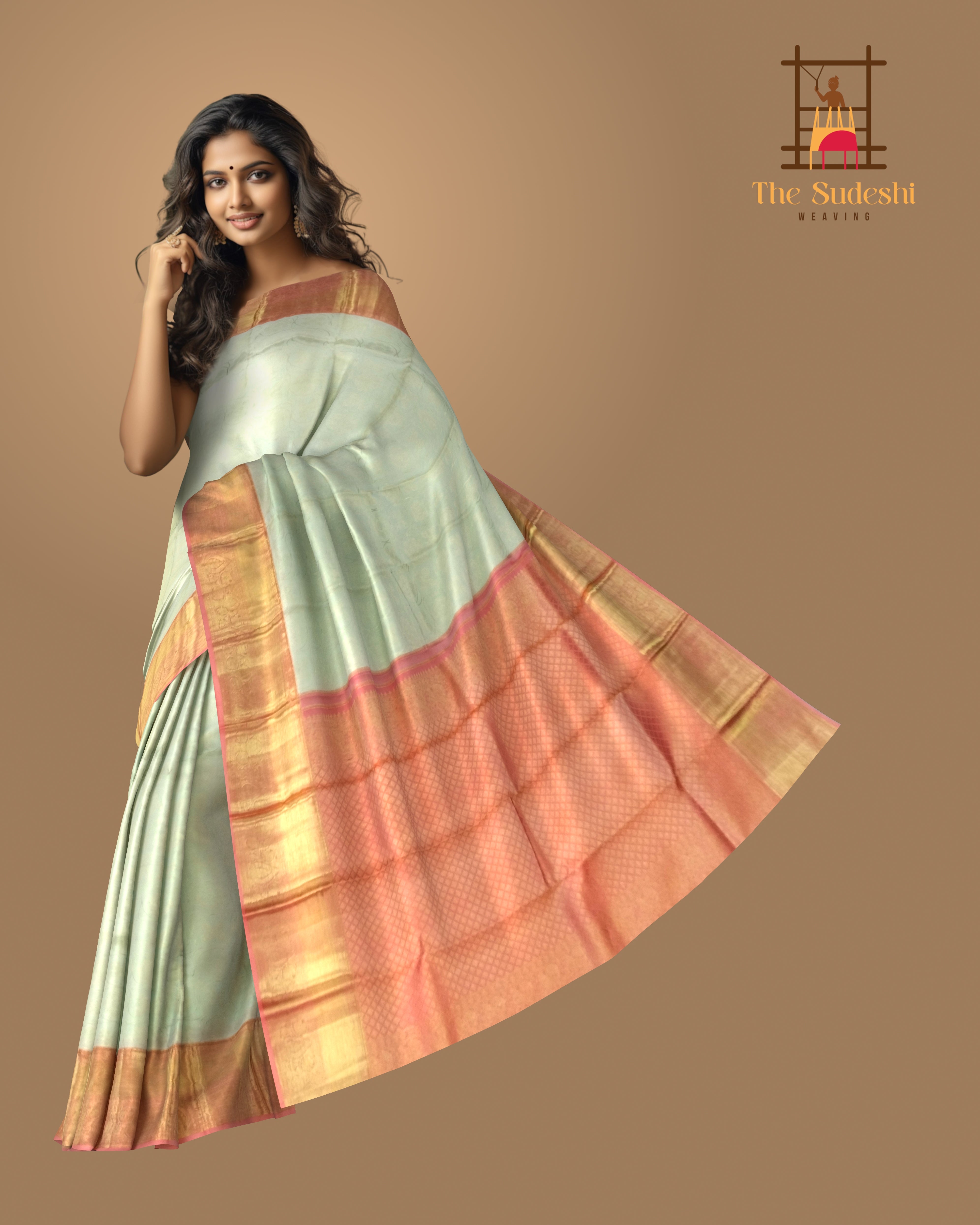 Floral designs in Indian textiles have long been associated with beauty, femininity, and prosperity. The detailed jaquard weaving technique used in this saree showcases the skill of Kanchipuram weavers, who meticulously craft each thread into a masterpiece of elegance. The subtle yet intricate patterns lend an ethereal charm, making this saree a timeless heirloom.