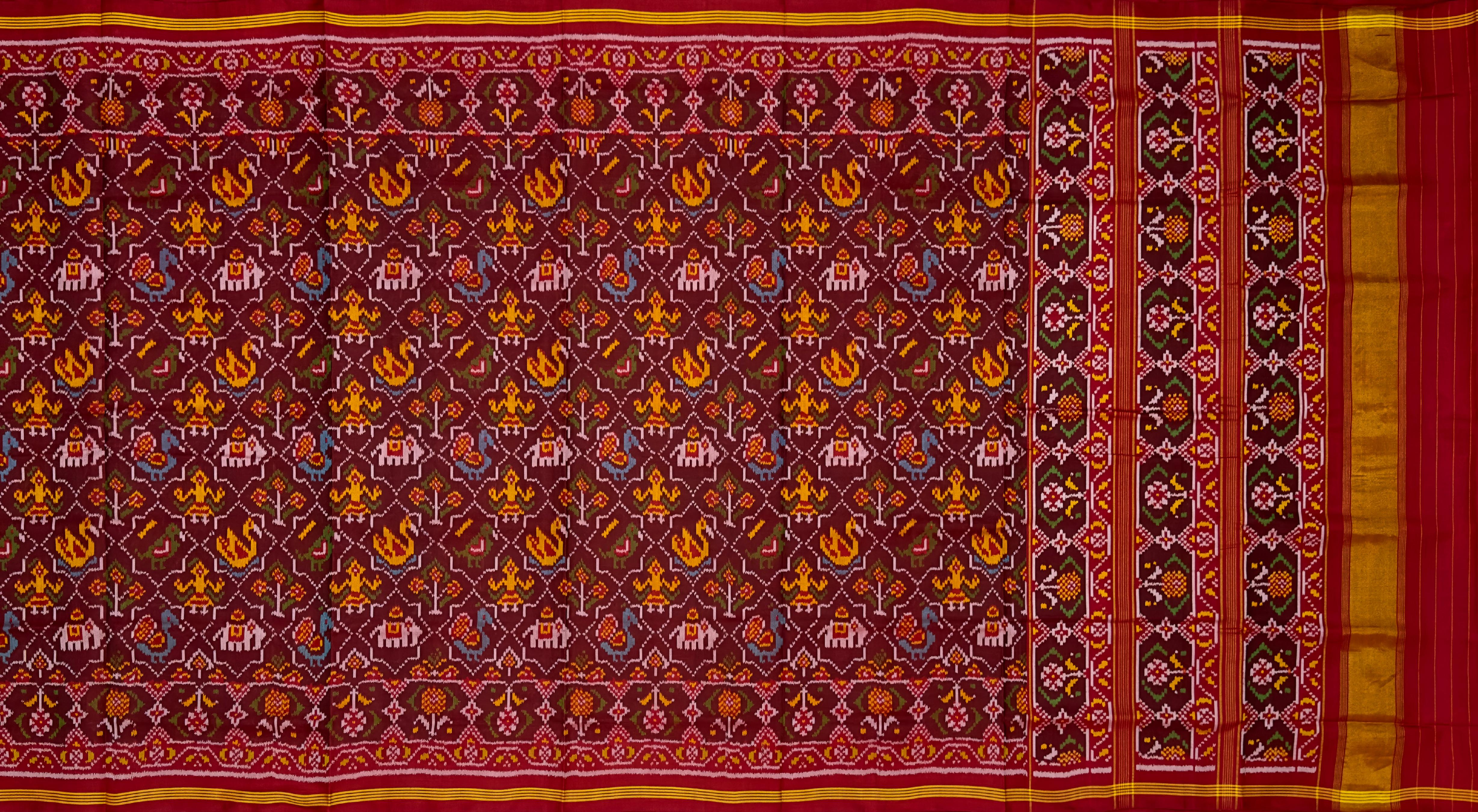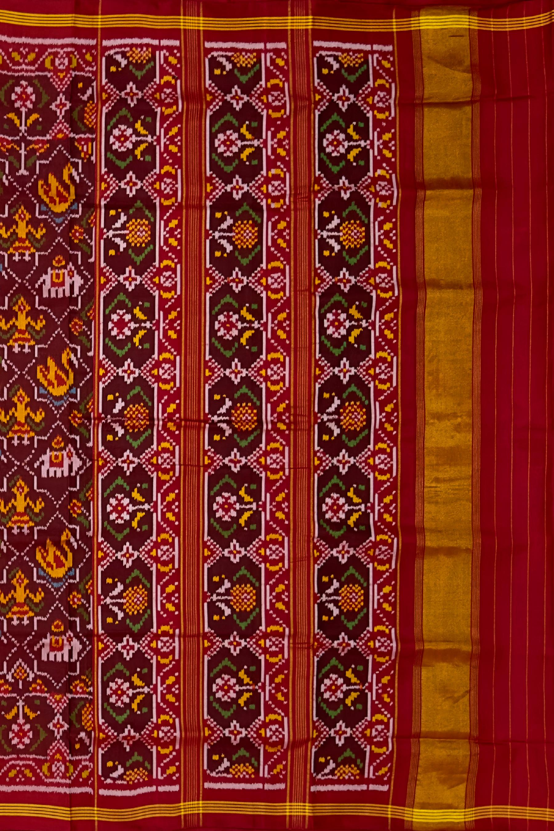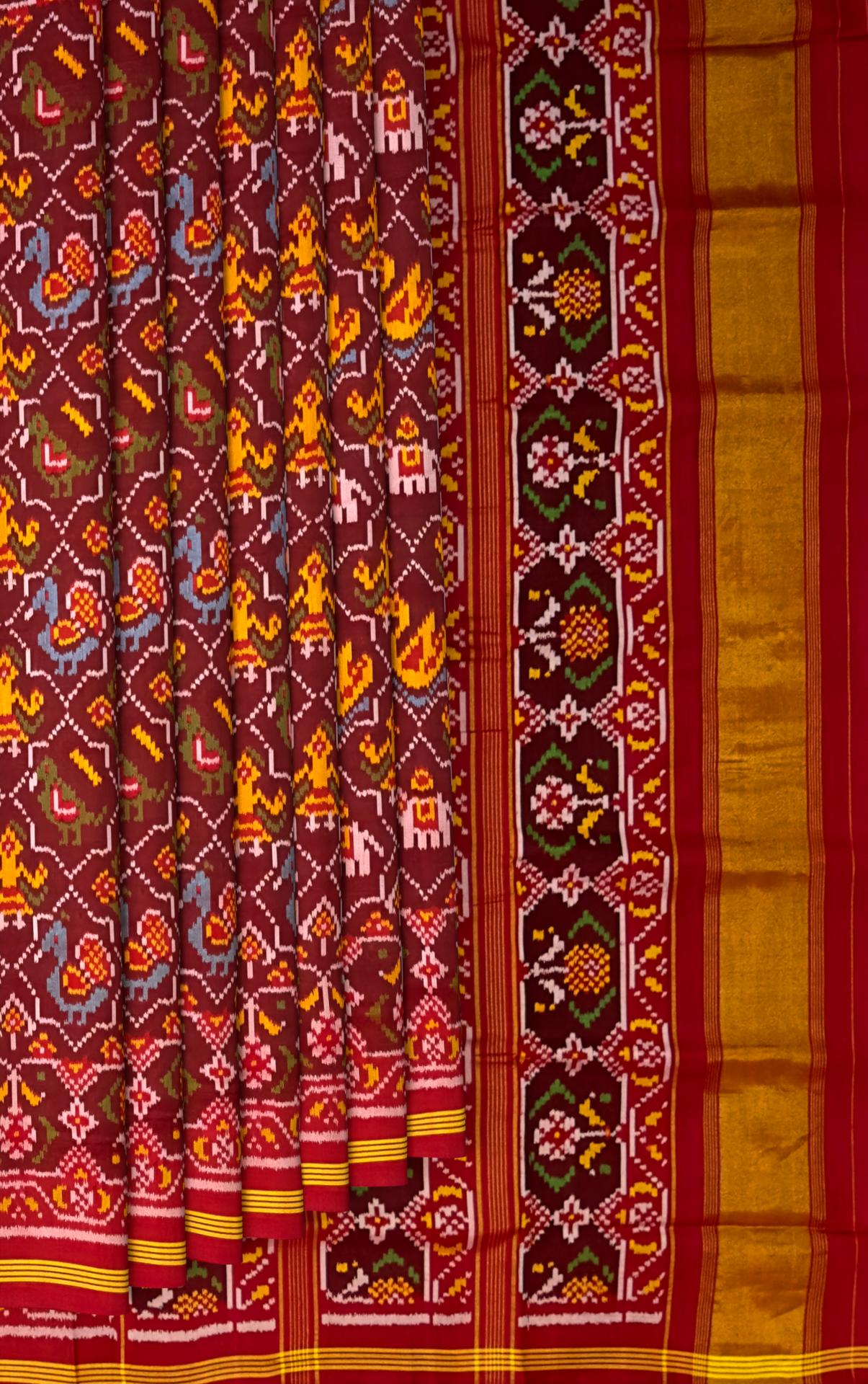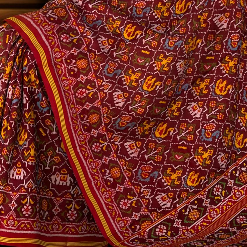 Discover the sophisticated charm of the Coffee Maroon Diamond Hathipoat Patola Saree, a masterpiece of traditional Indian artistry. Crafted using the single ikat technique, this saree features the intricate Diamond Hathipoat design, showcasing luxurious patterns. The unique combination of coffee and maroon provides a captivating backdrop for the detailed motifs that flow seamlessly from the body to the pallu. The semi-lustrous finish adds a touch of elegance, making it a versatile choice for various occasions. Perfect for grand weddings, cultural celebrations, and social gatherings, this saree is designed for the modern NRI woman who values her Indian heritage. It symbolizes centuries of artisan tradition, making each piece a unique work of art. Celebrate your heritage with the Coffee Maroon Diamond Hathipoat Patola Saree, a timeless piece that exudes tradition and sophistication.