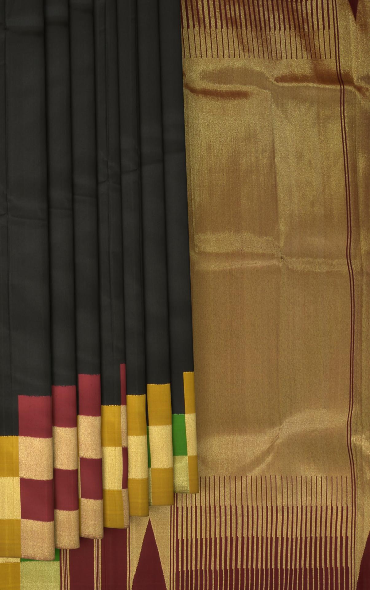 The body of the saree is a plain weave, a canvas of sophisticated black that serves as the backdrop for a powerful play of color and design. Its simplicity is its strength, allowing the purity of the silk and the richness of the color to shine through without competition.