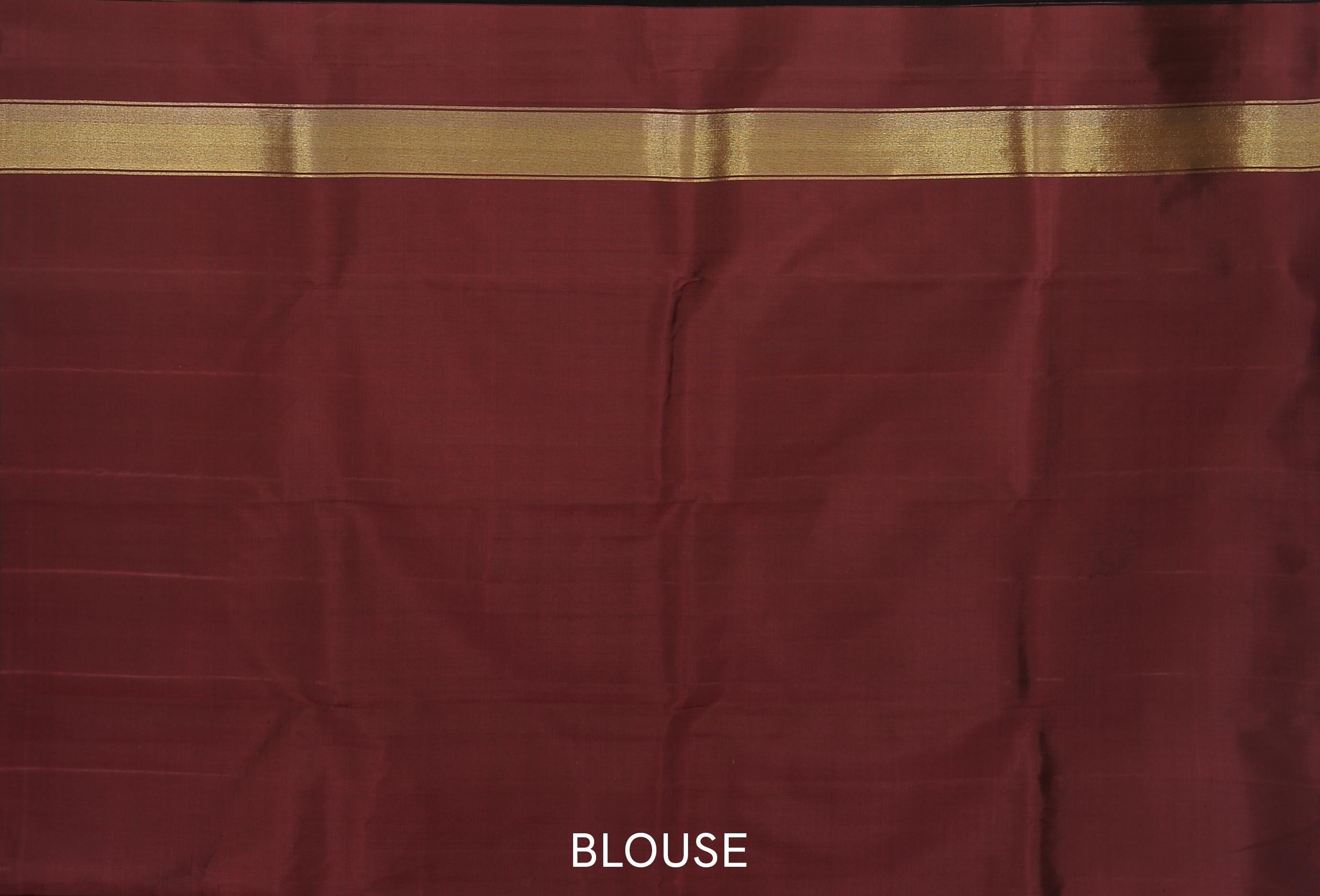 This saree is paired with a Maroon blouse, echoing the colors and patterns of the pallu and border, ready to be tailored to the wearer's personal style, be it with a traditional cut or a more modern silhouette.