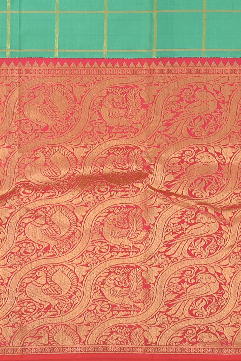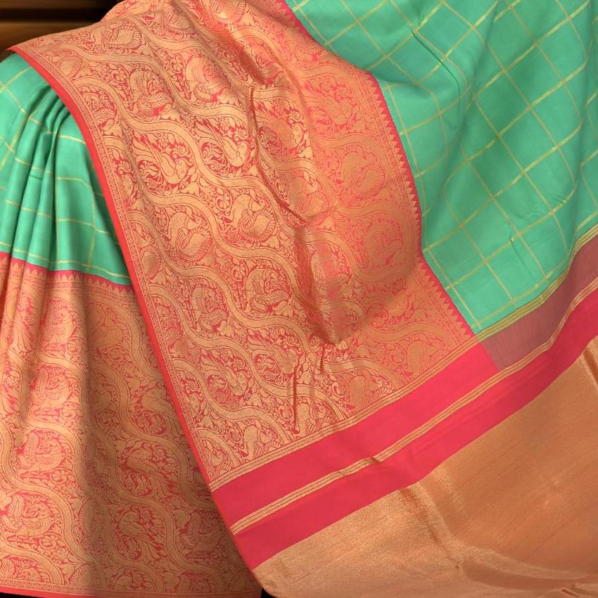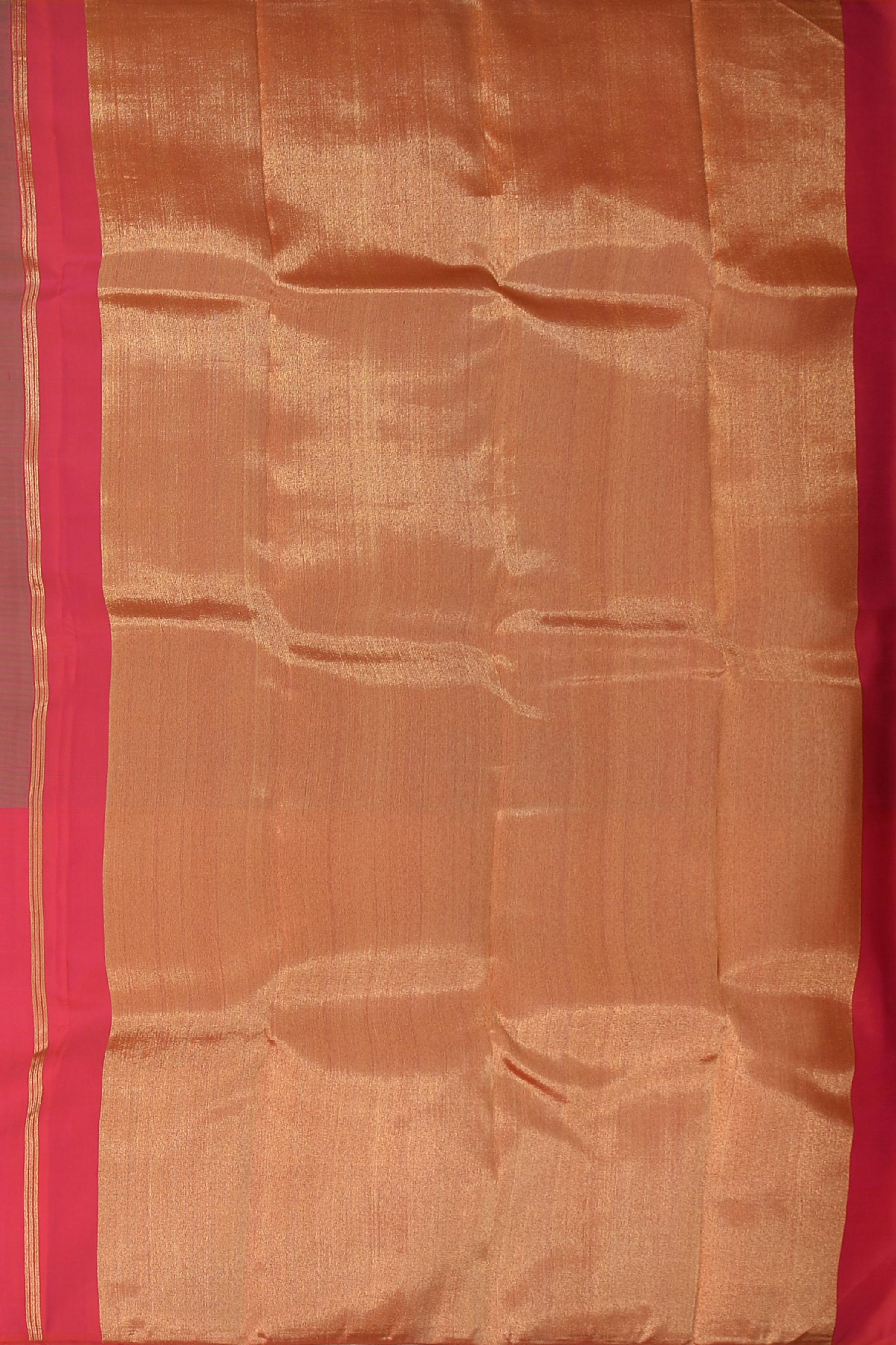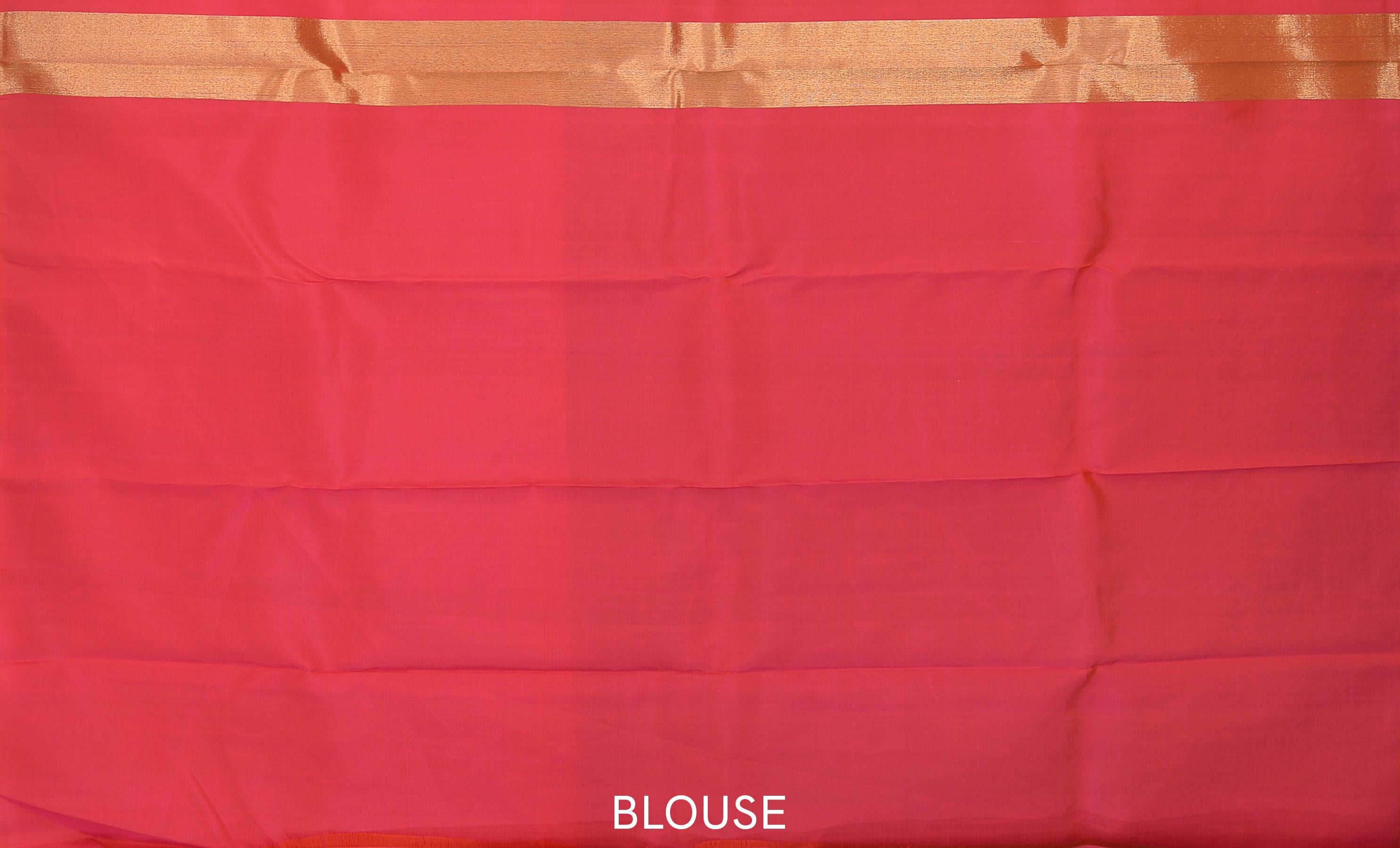 This coral pink Kanchipuram silk saree is a confluence of heritage and charm, woven with blue floral buttas that stand out like blooms on a sunlit reef. The self-color Benaraspet border with annapakshi motifs is a testament to the timeless weaving traditions of Kanchipuram, while the intricately woven peacock, rudraksham benaraspet in the pallu reflects a legacy of beauty and elegance.
