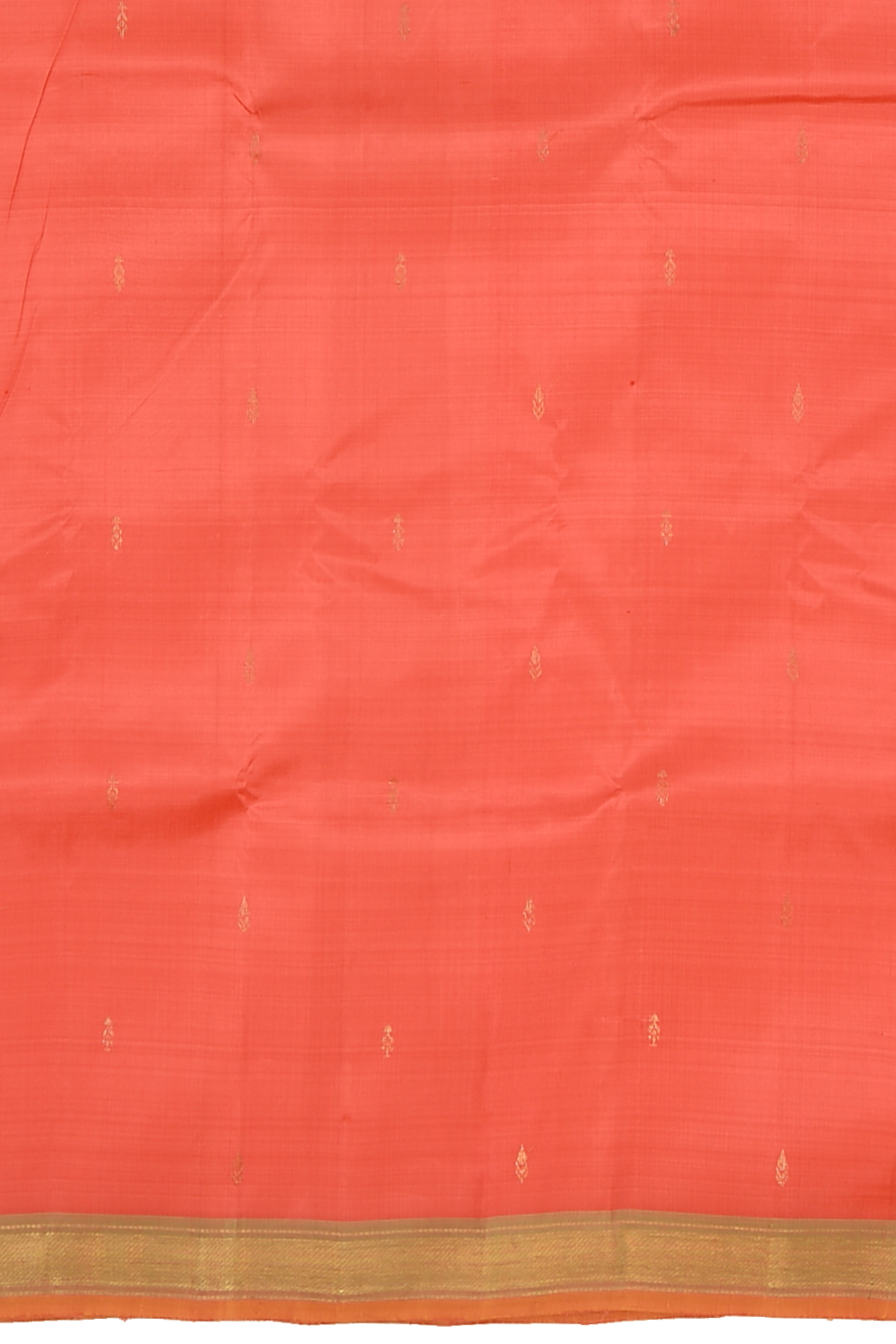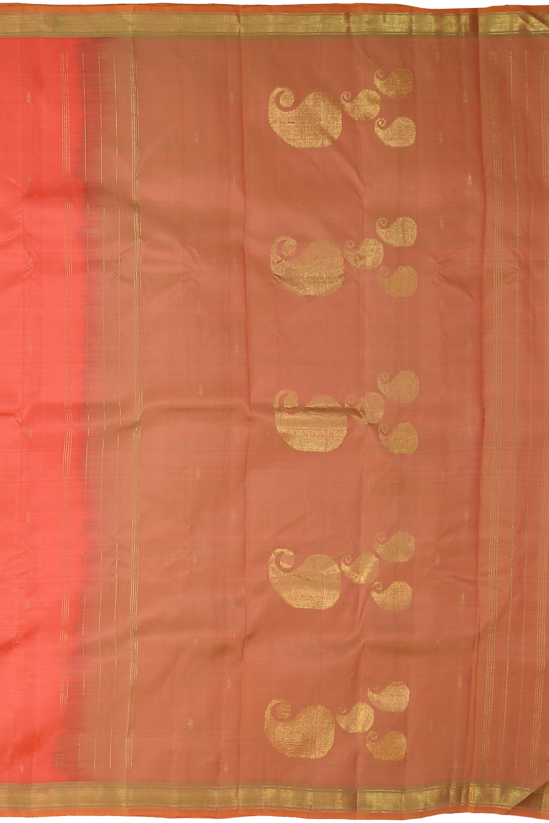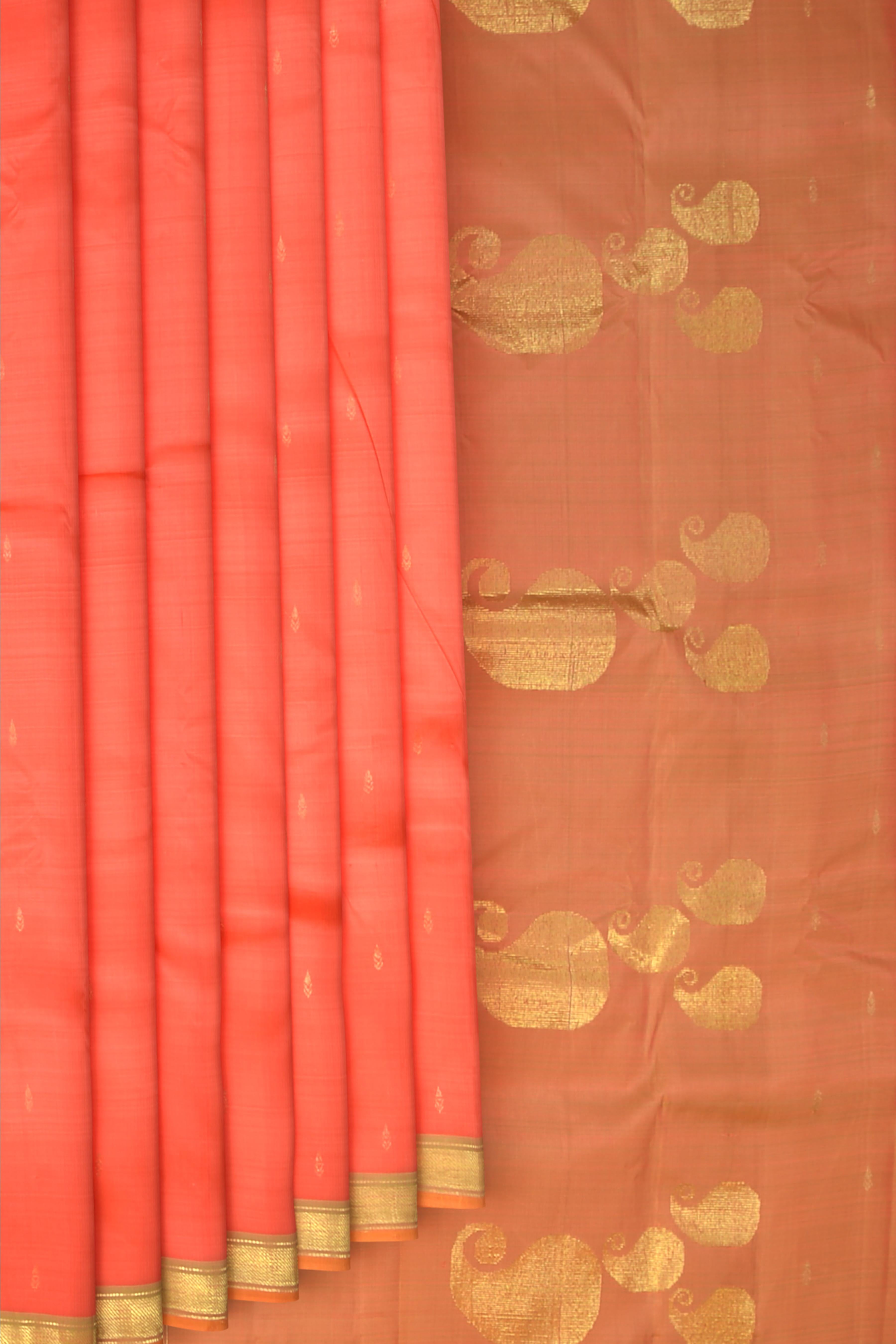 Dive into a realm of elegance and tradition with this Coral Pink saree. The plain body, adorned with small gold patterns, whispers tales of ancient India. The Cross Lines border in Light Orange offers a delightful contrast, while the Dual Tone Dull Greenish Peach pallu, adorned with big mango motifs, completes the tale of grandeur.