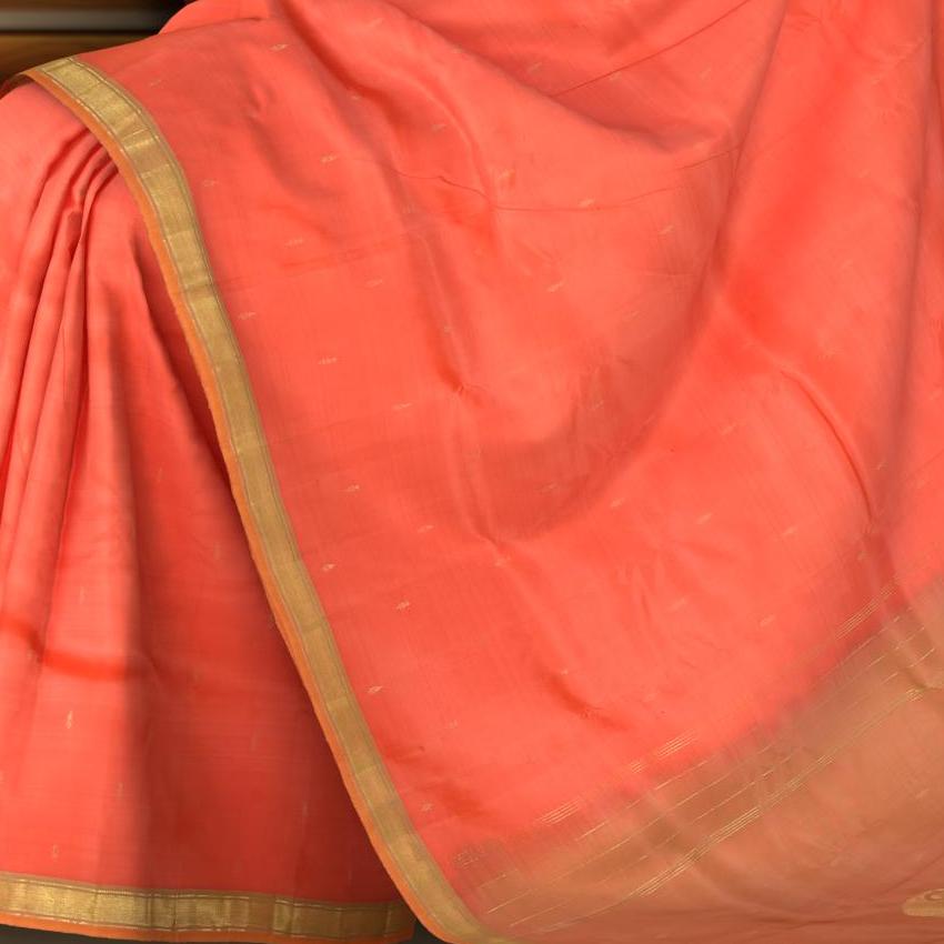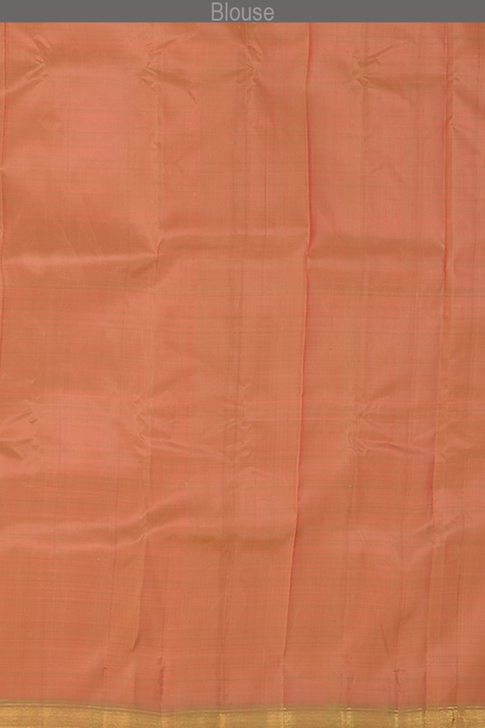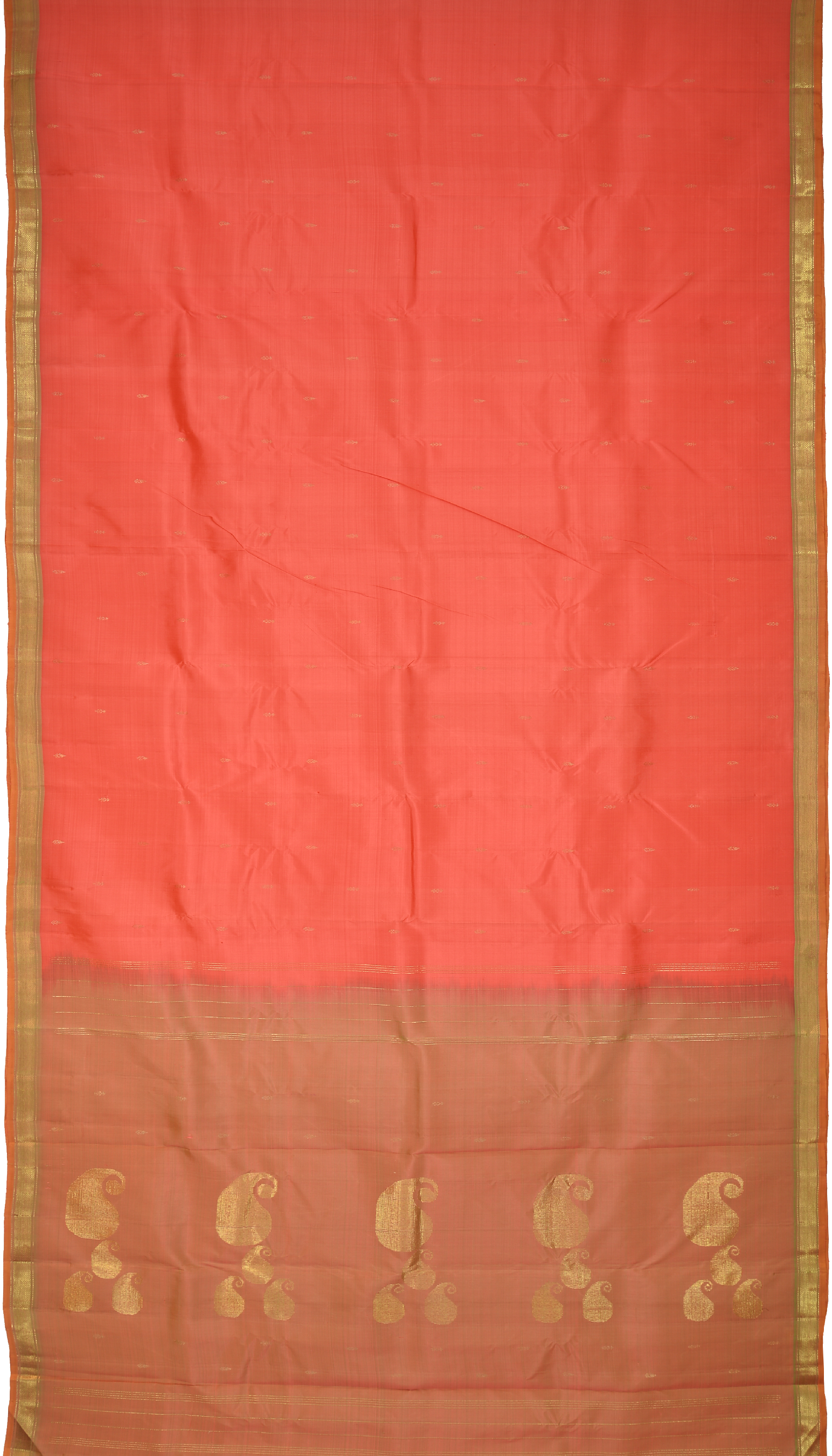 Dive into a realm of elegance and tradition with this Coral Pink saree. The plain body, adorned with small gold patterns, whispers tales of ancient India. The Cross Lines border in Light Orange offers a delightful contrast, while the Dual Tone Dull Greenish Peach pallu, adorned with big mango motifs, completes the tale of grandeur.
