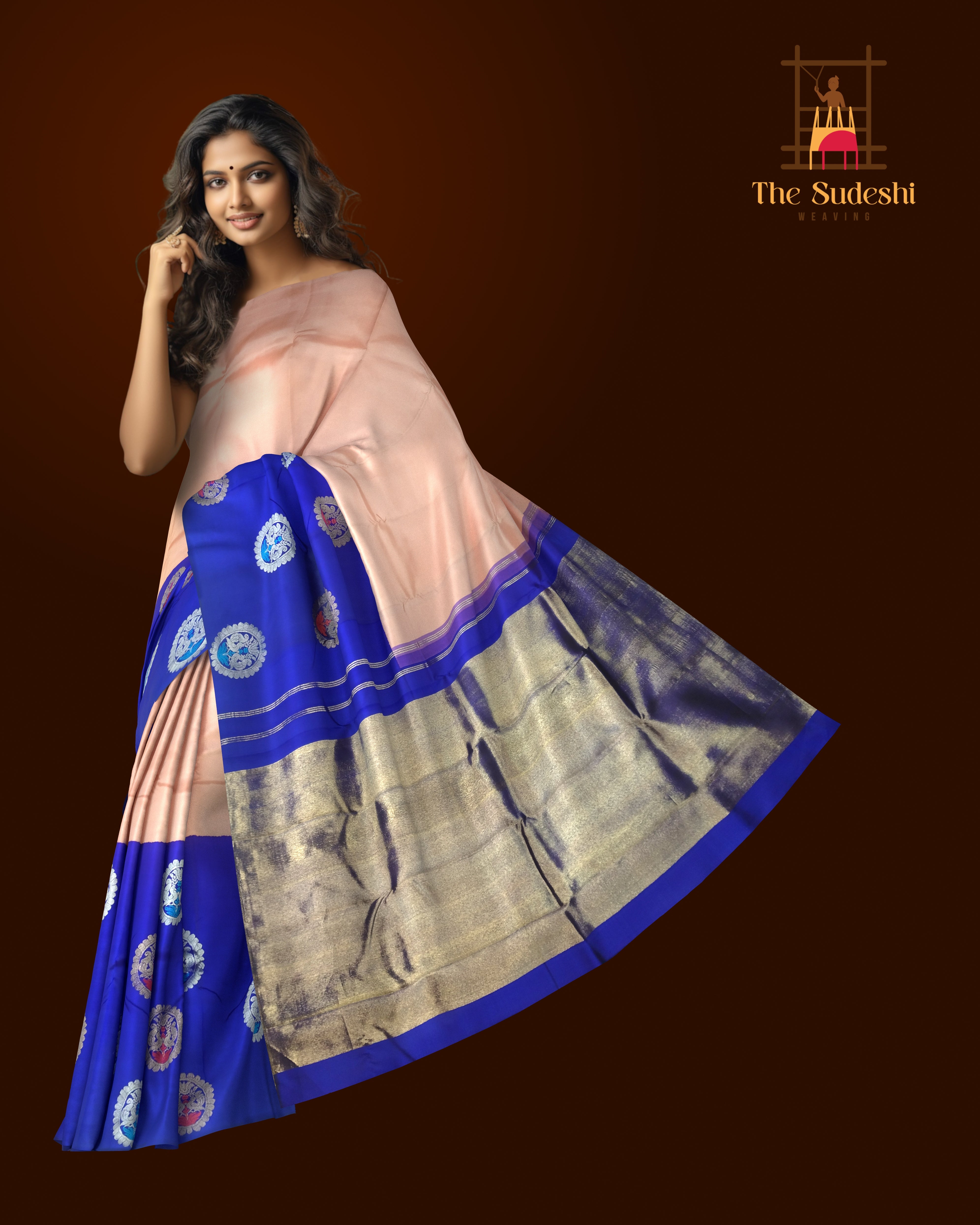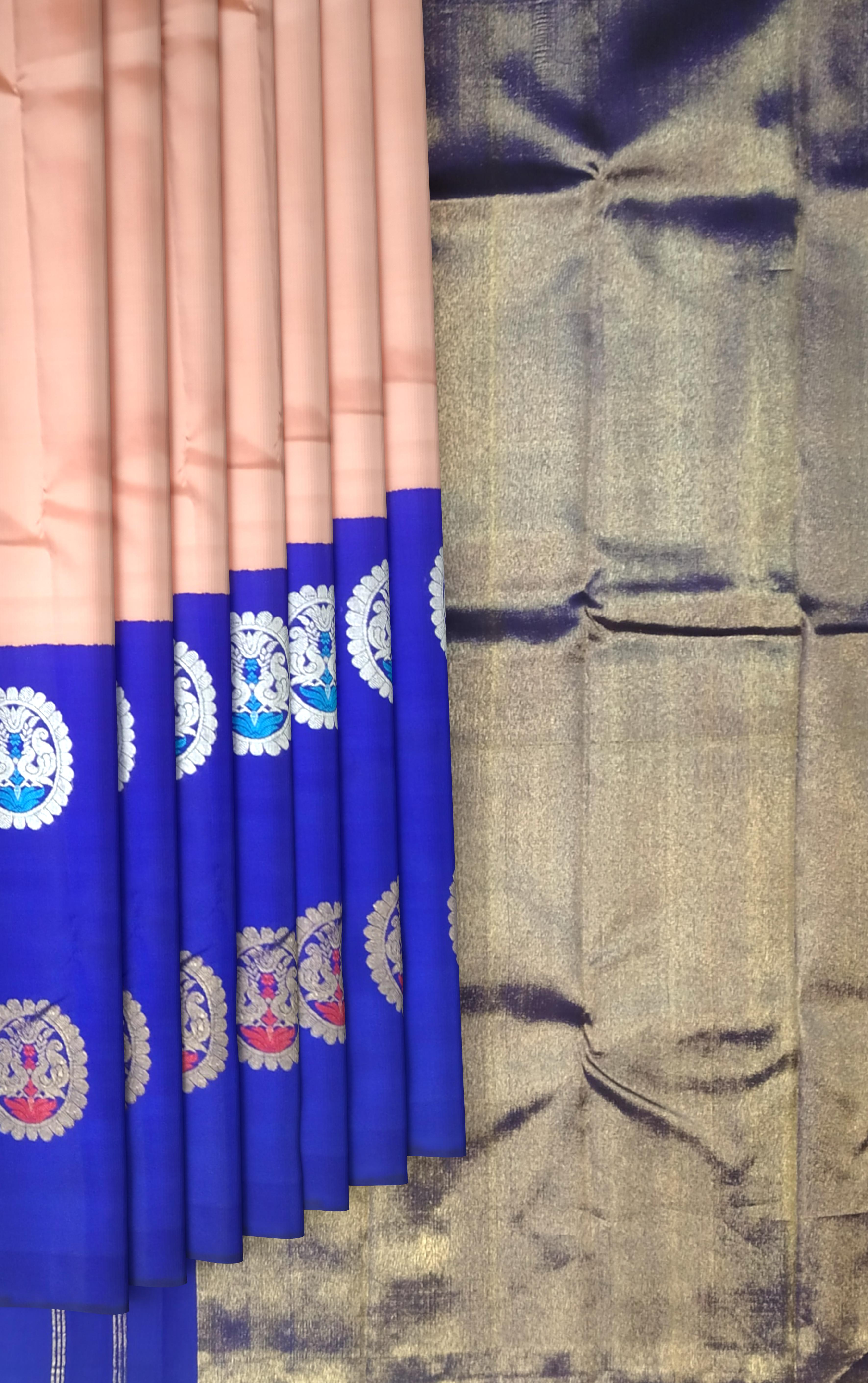 Delicate yet distinctive, this Light Pink Kanchi Pure Silk Saree is a graceful blend of softness and grandeur. The body is kept elegantly plain to highlight the intricate silver and gold circular bhuttas that adorn the royal blue border—creating a striking visual frame against the pastel pink silk. The pallu echoes the body’s softness, while the matching royal blue blouse lends depth and balance to the ensemble. The thoughtful contrast between the tender pink and the opulent border makes this saree effortlessly captivating.