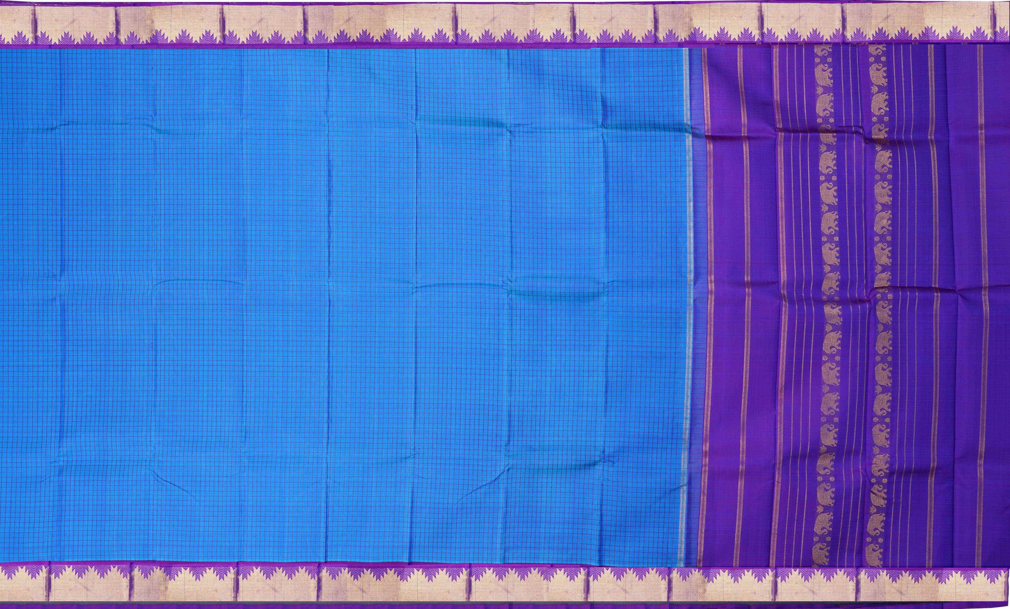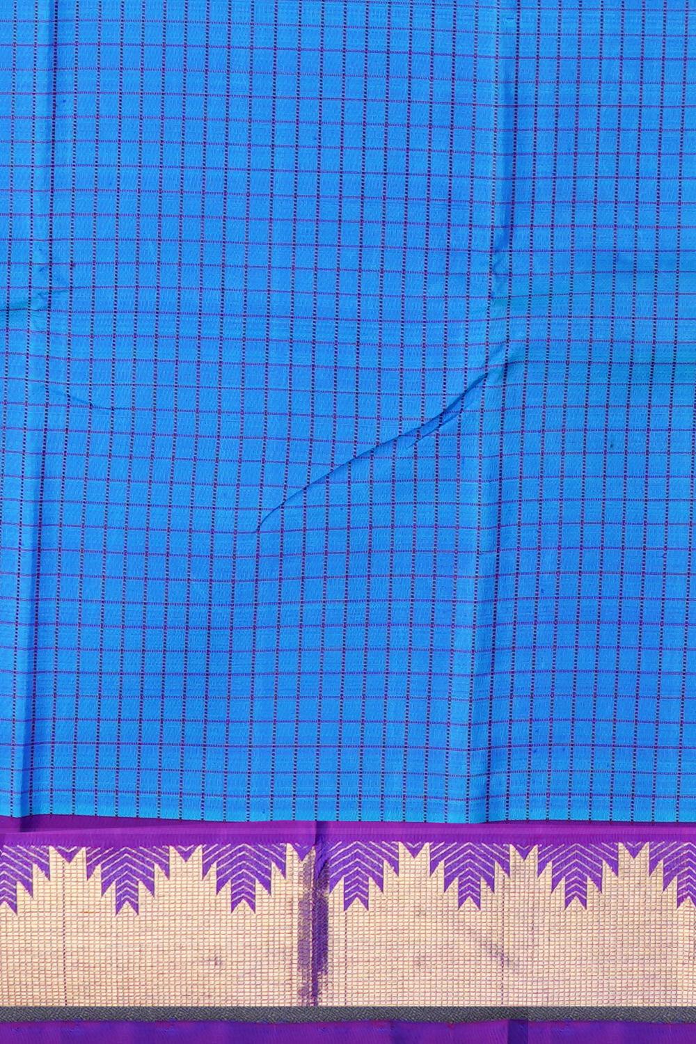 Indulge in the beauty of this stunning Cyan Blue and Purple Kanchipuram Pure Zari Saree. The checks pattern with a Zari border, a hallmark of Kanchipuram Pure Zari, is a testament to the artisan's skill and dedication. The bold cyan blue and purple colors, symbolizing tranquility and luxury, are perfectly complemented by the delicate checks design. The dual tone of cyan blue and purple adds a touch of elegance and sophistication to this saree, making it perfect for formal events and weddings.
