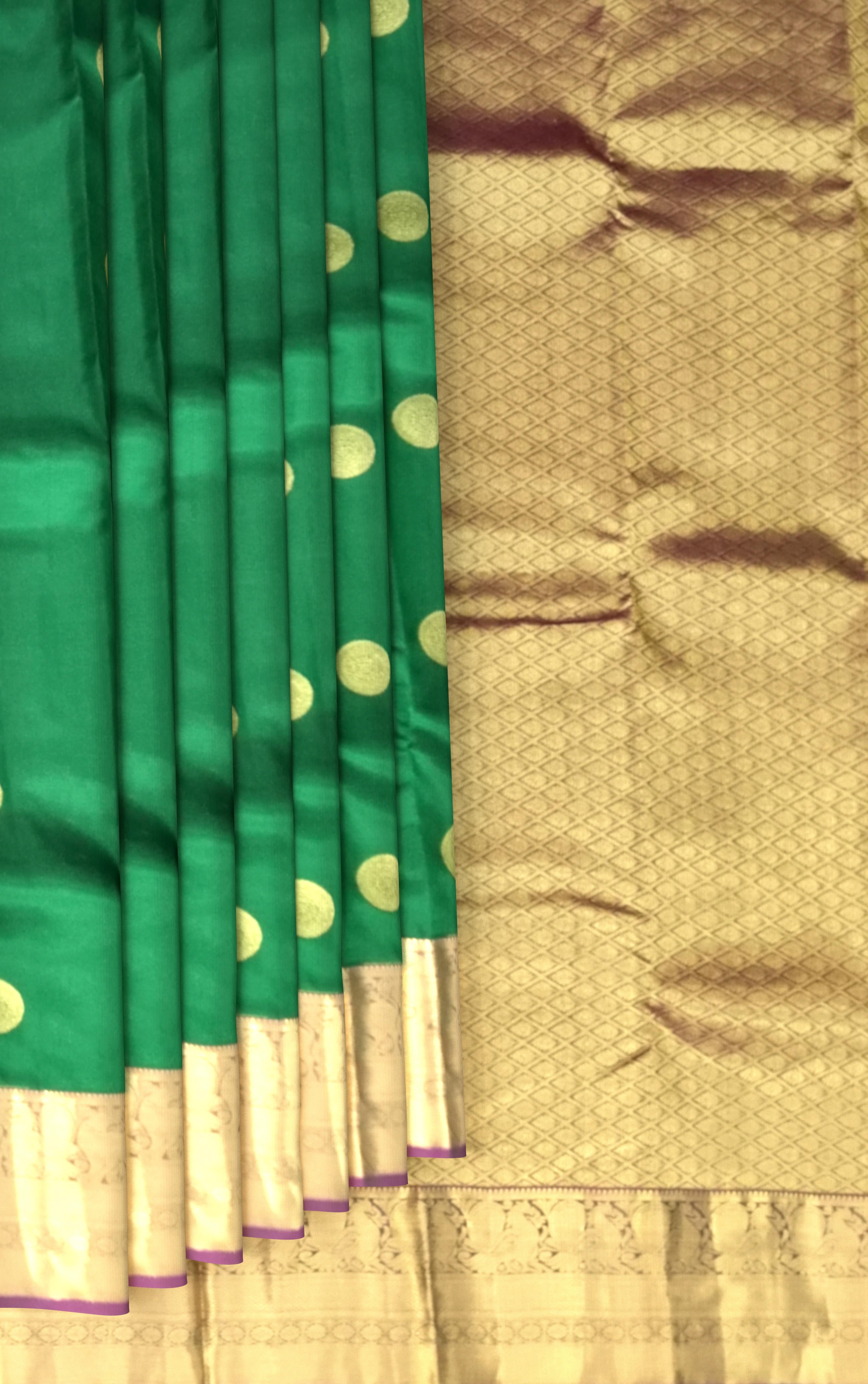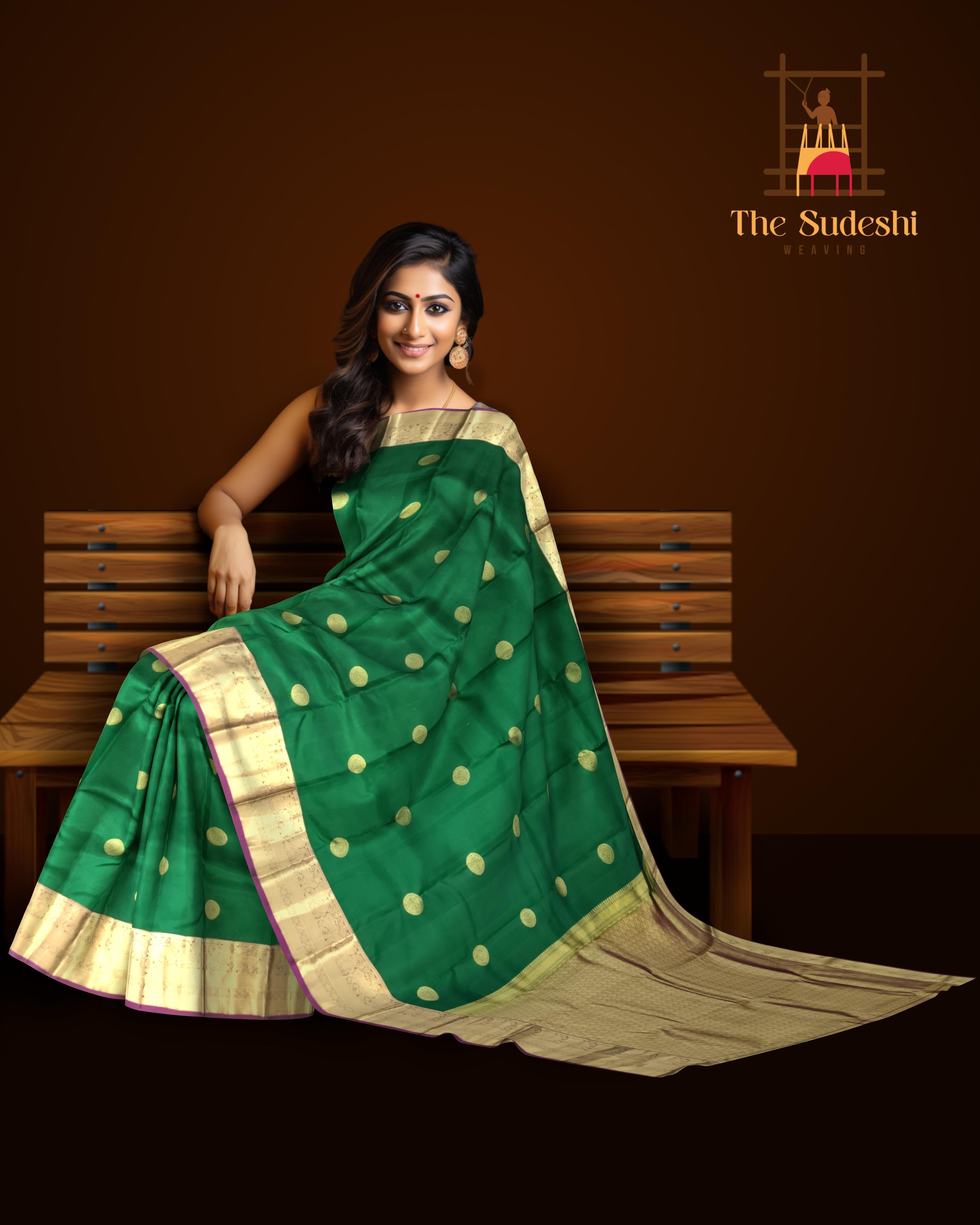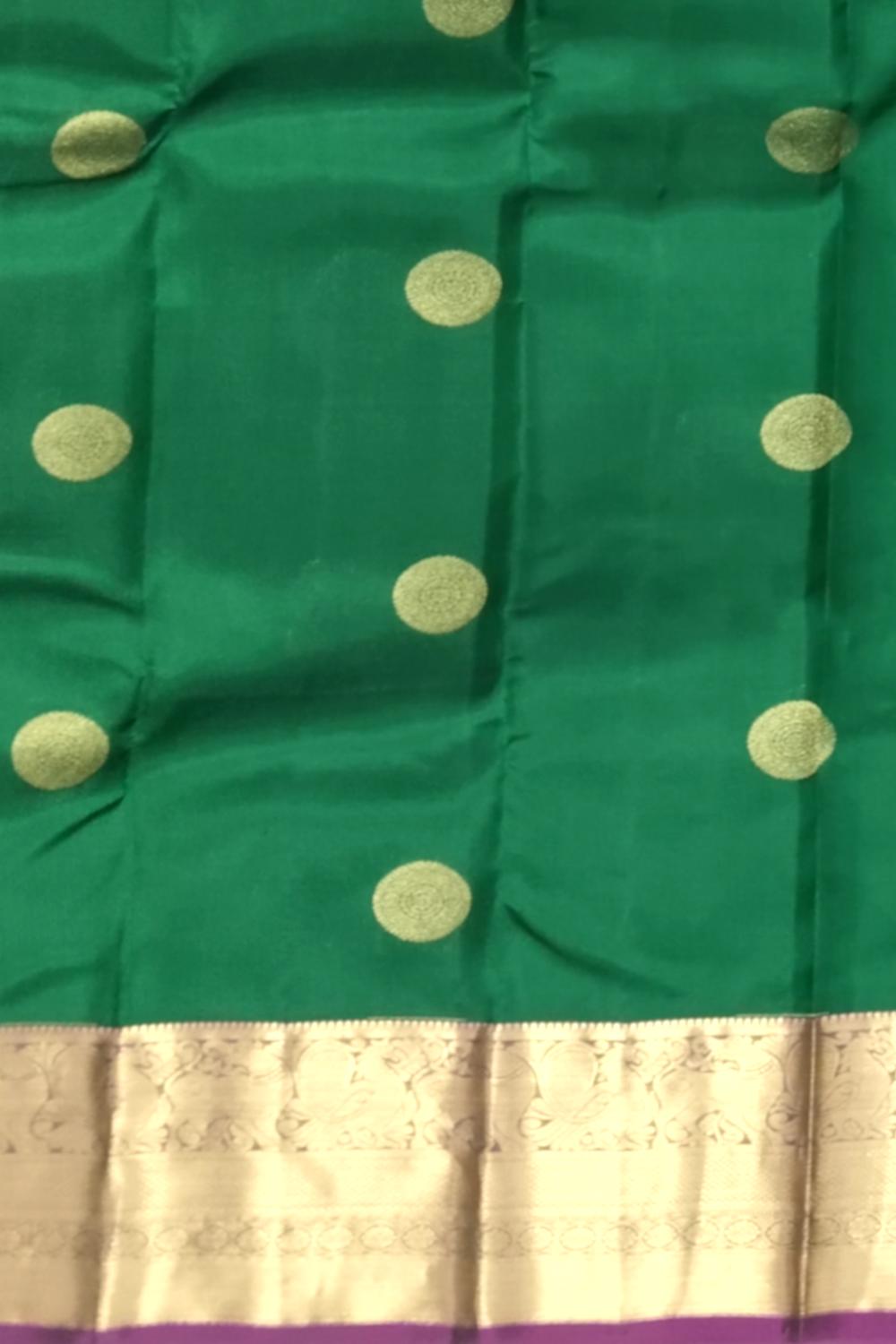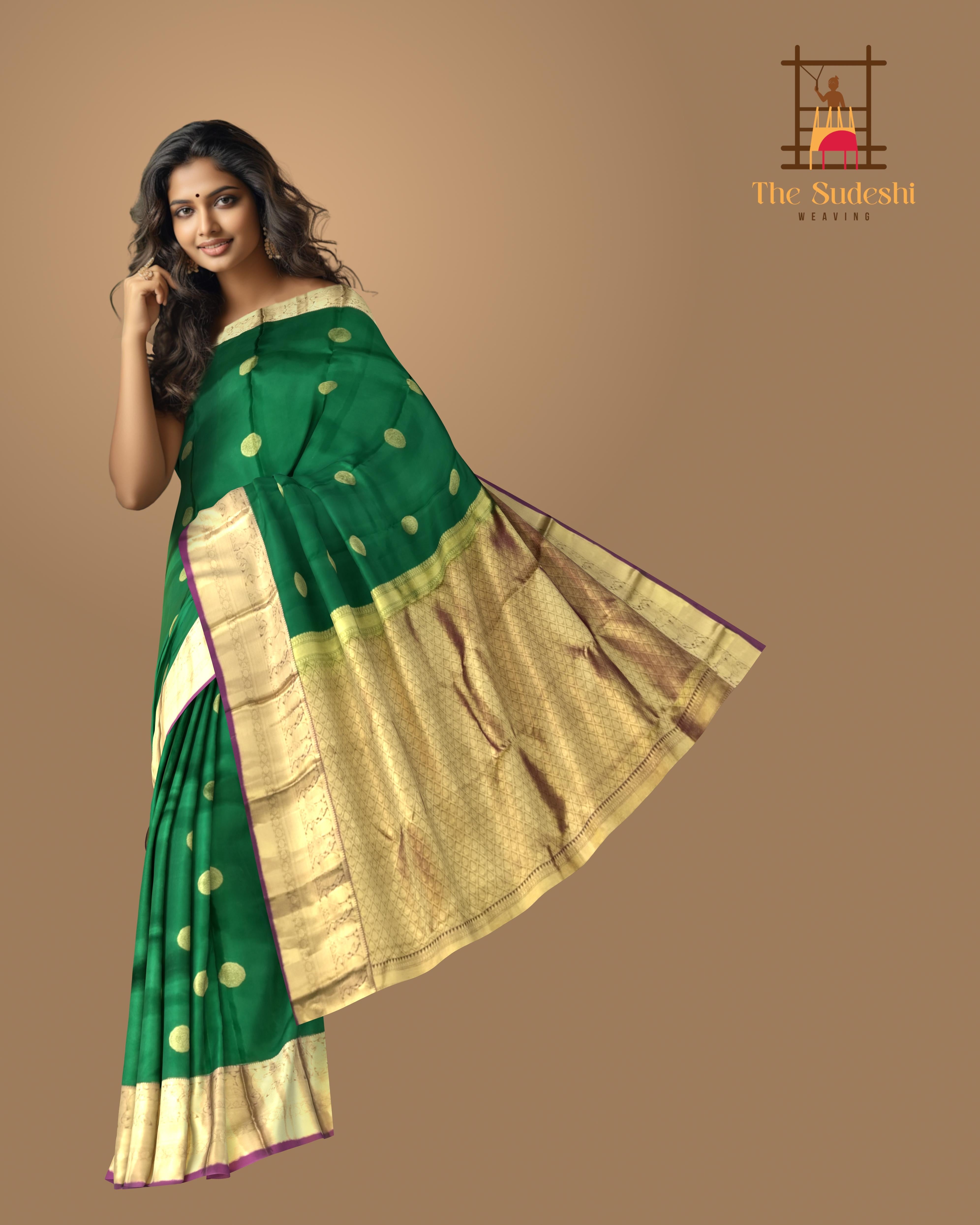 Step into regal elegance with this exquisite Dark Green Kanchipuram Silk Saree adorned with traditional Chakram Butta motifs. The rich dark green body symbolizes prosperity and grace, while the contrasting purple border and pallu enhance its grandeur. Each butta gleams with zari artistry, reflecting the time-honored weaving traditions of Tamil Nadu that make every Kanchi saree an heirloom. Kanchipuram Pure Silk Sarees are woven using fine mulberry silk and real zari, renowned for their durability and lustrous finish. Originating from the temple town of Kanchipuram, these sarees are a testament to South India’s unmatched craftsmanship — where mythological tales, temple architecture, and nature-inspired motifs come alive in golden threads. Perfect for weddings, festive occasions, or cultural gatherings, this saree pairs beautifully with a contrast purple blouse and antique gold jewelry. Add a temple necklace or chandbalis for a royal finish. Note: The appearance of the product’s colors may vary due to lighting conditions or your device’s screen calibration. For further assistance or additional images/videos, feel free to contact us at +91 97897 60367 or email at wecare@thesudeshiweaving.com.