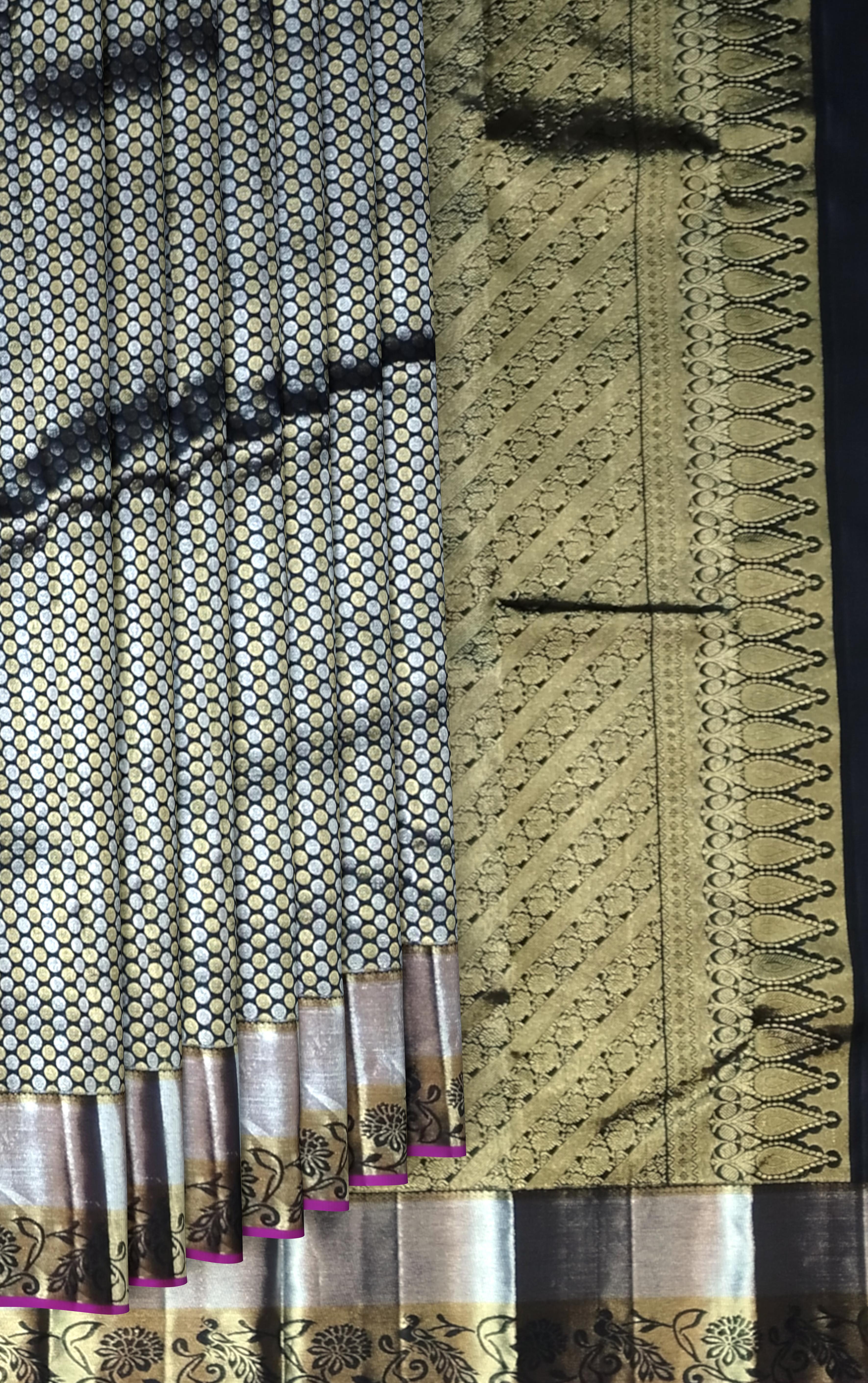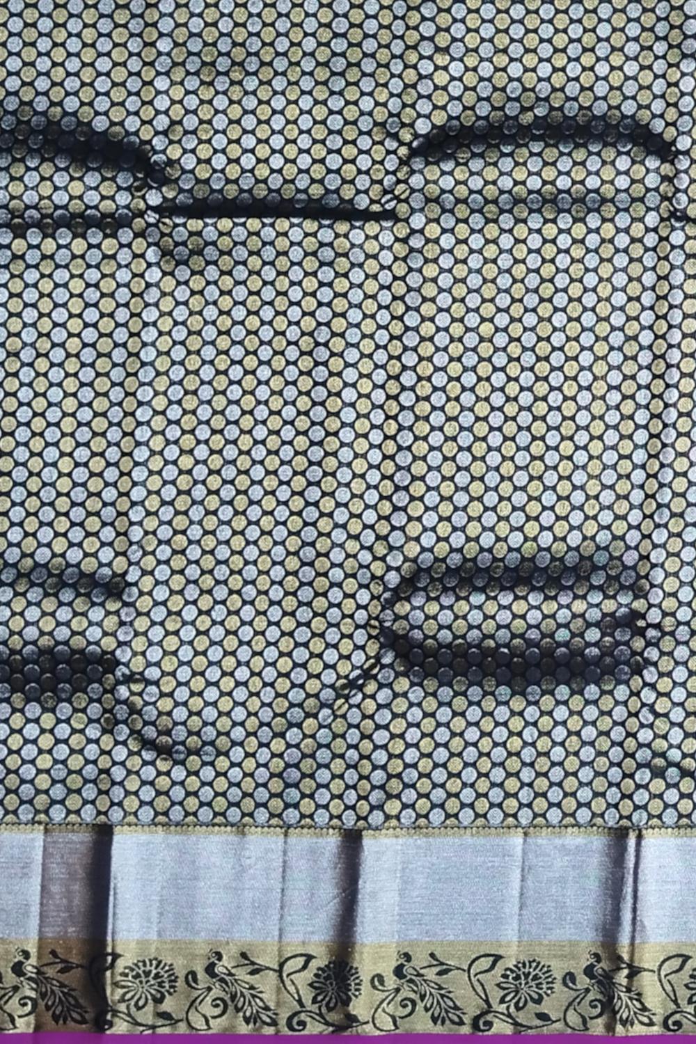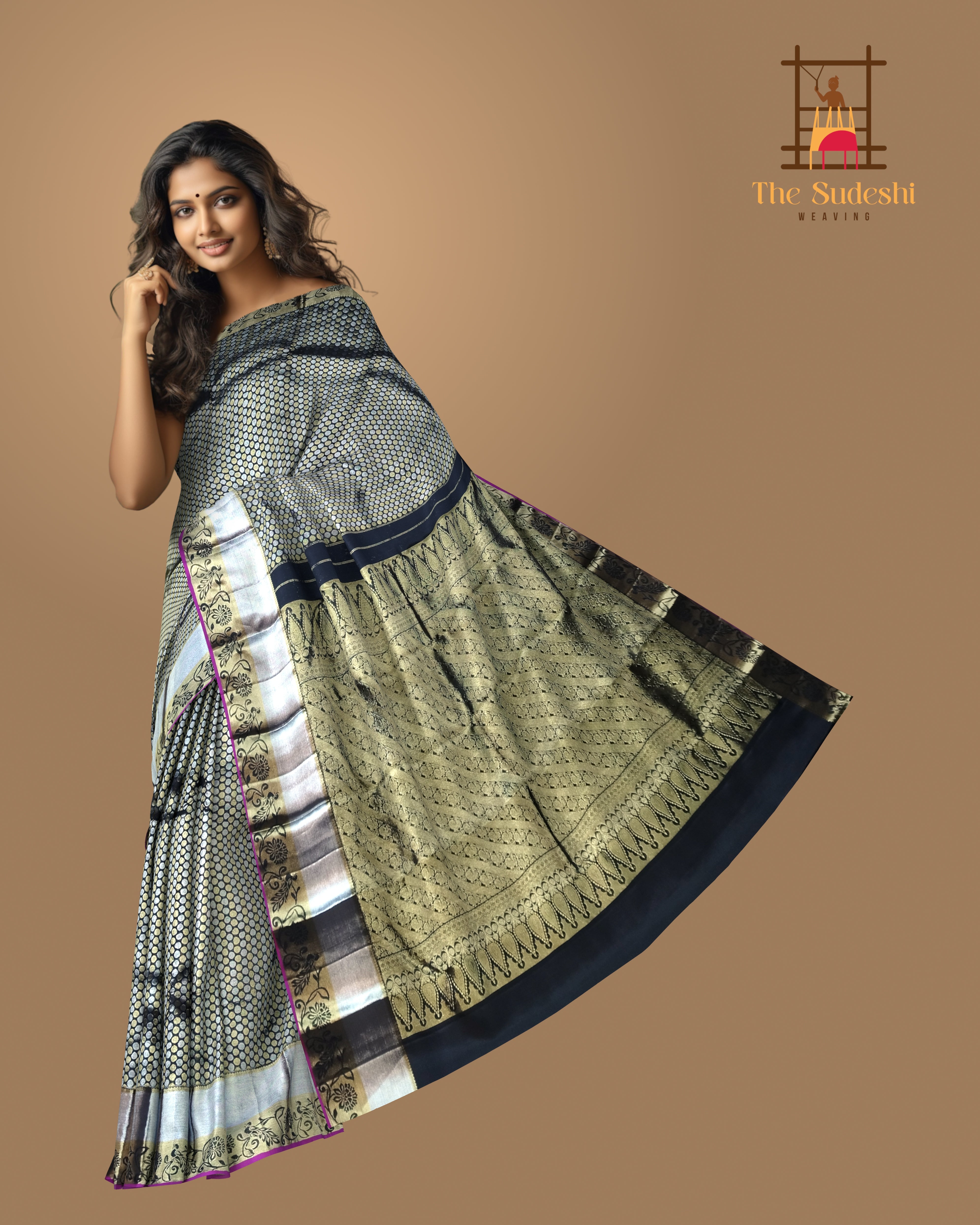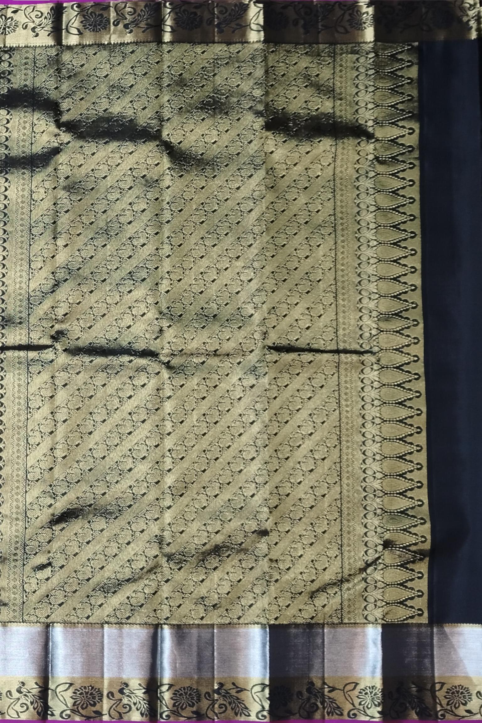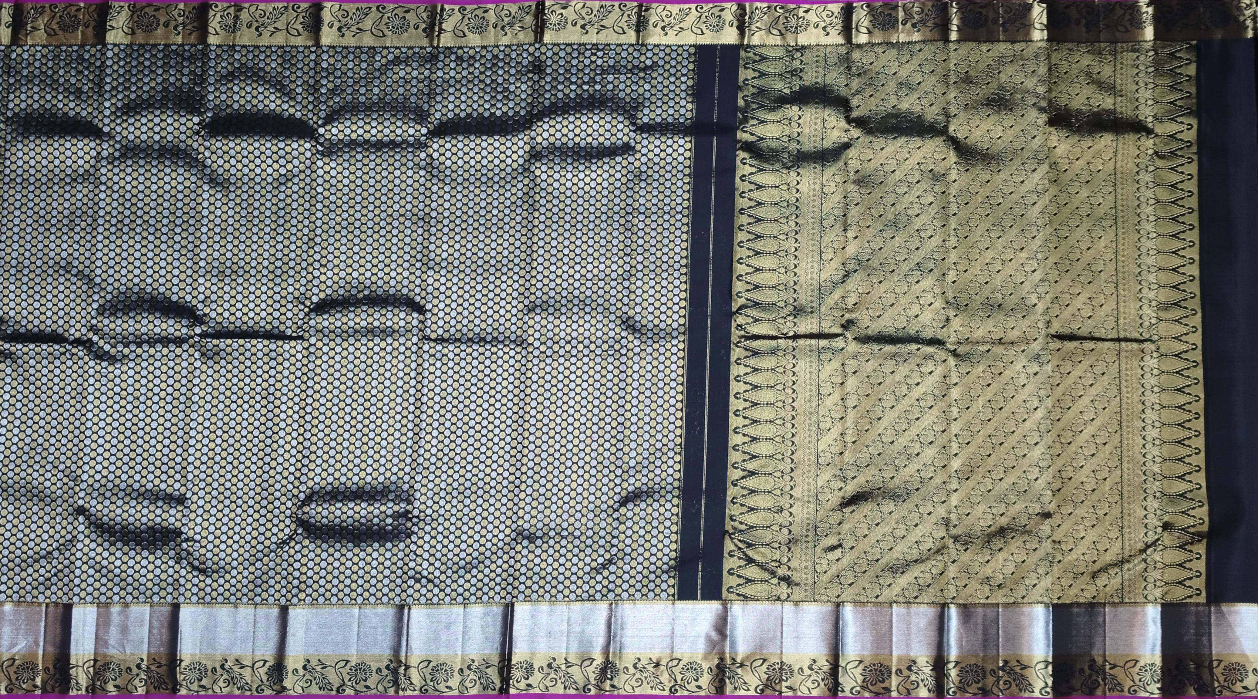 Unveil a dramatic yet regal charm with this exquisite Black Kanchi Pure Silk Saree, adorned with resplendent silver and gold jacquard patterns across its entire body. The interplay of metallic tones against the deep black silk creates a mesmerizing texture, catching the light with every movement. The single-side border and the rich silver pallu elevate the grandeur, while the contrasting black blouse completes this sophisticated silhouette with finesse.