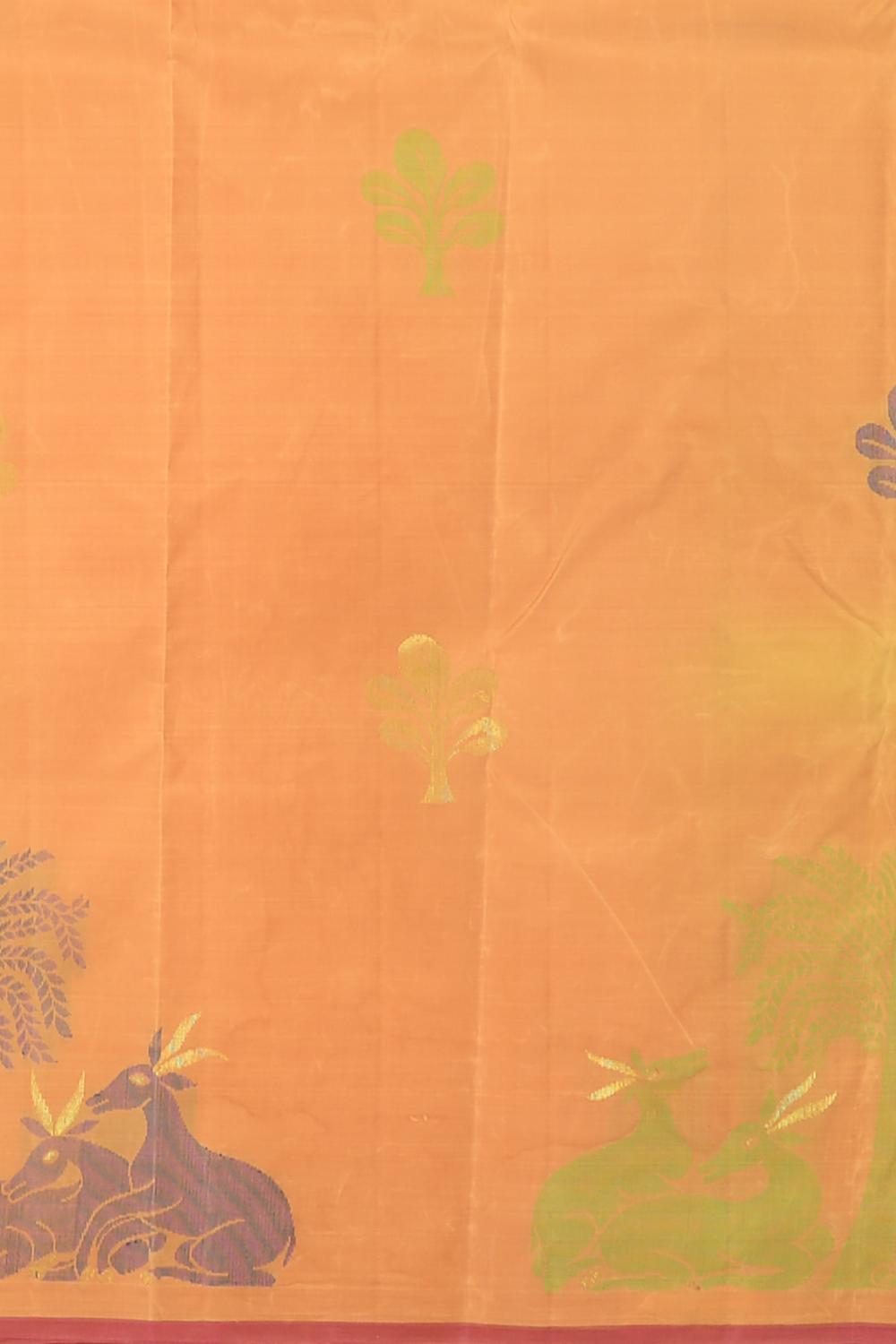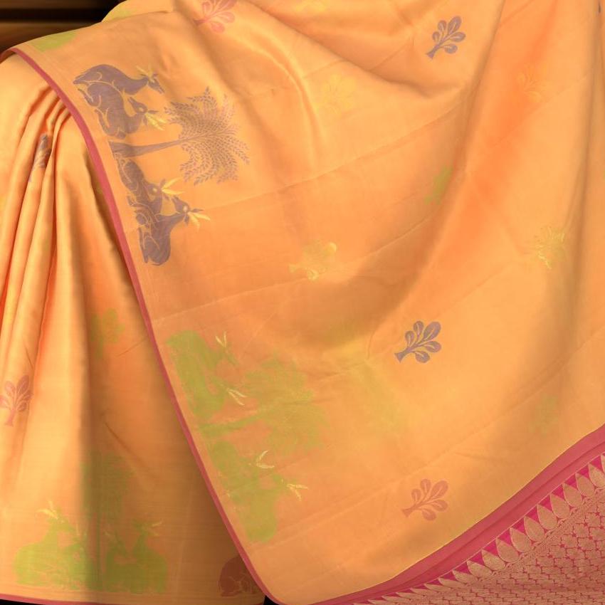 Welcome the first light of dawn with this Pure Silk Saree, a blend of Light Orange and Pink that captures the gentle warmth of the morning sun. The body is adorned with Butta featuring blue and green deer, a homage to the awakening of life at dawn. The Pink borders, intricately woven with a floral motif, whisper tales of blooming flowers kissed by the morning dew. This saree is a canvas of nature's awakening, perfect for occasions that call for a subtle yet striking expression of beauty and elegance.