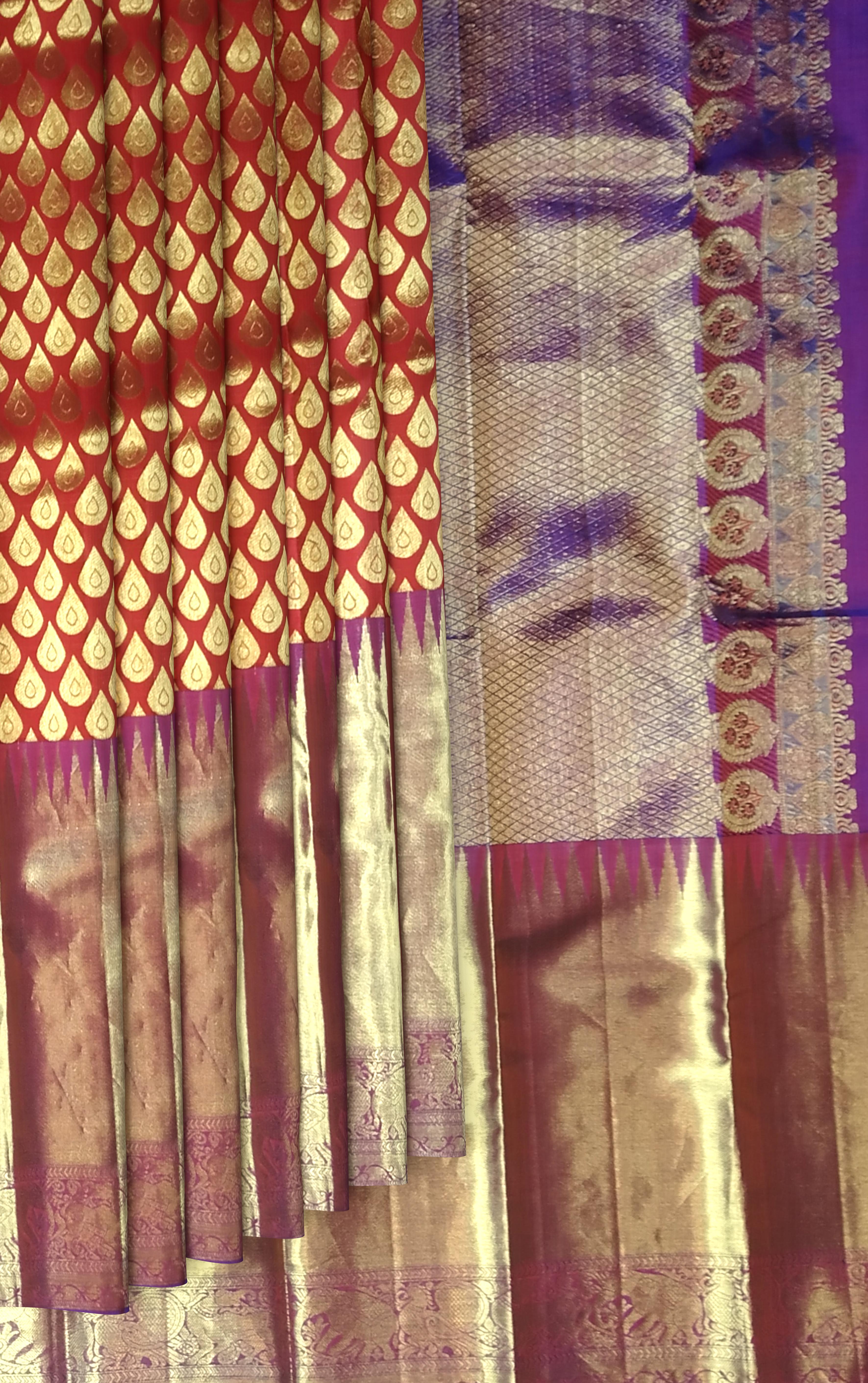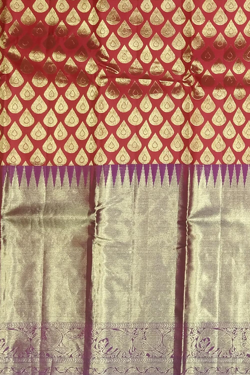 This deep maroon silk saree is intricately woven with mango jaquard motifs and bordered with golden zari. A timeless color with classic motifs — perfect for traditional occasions.