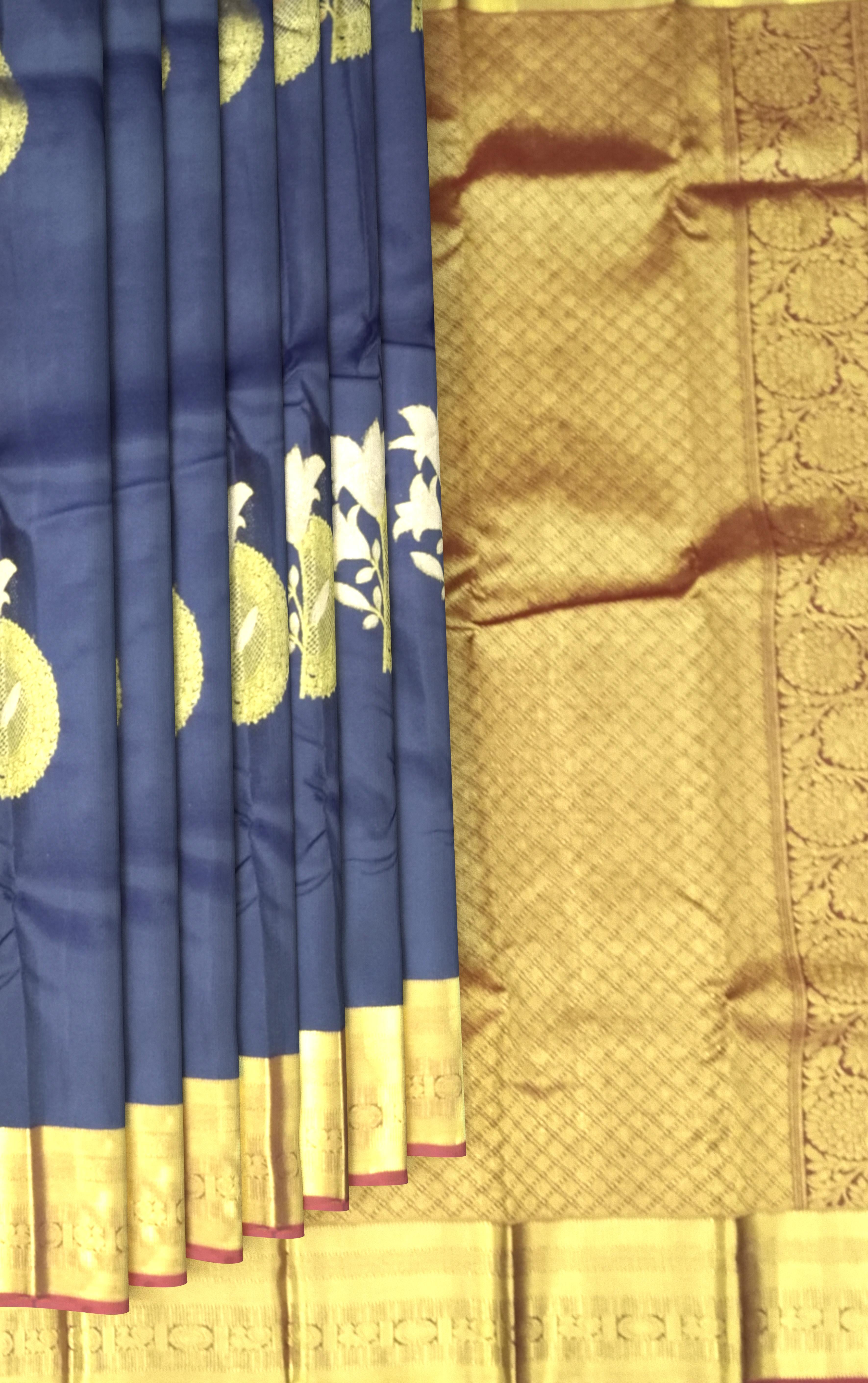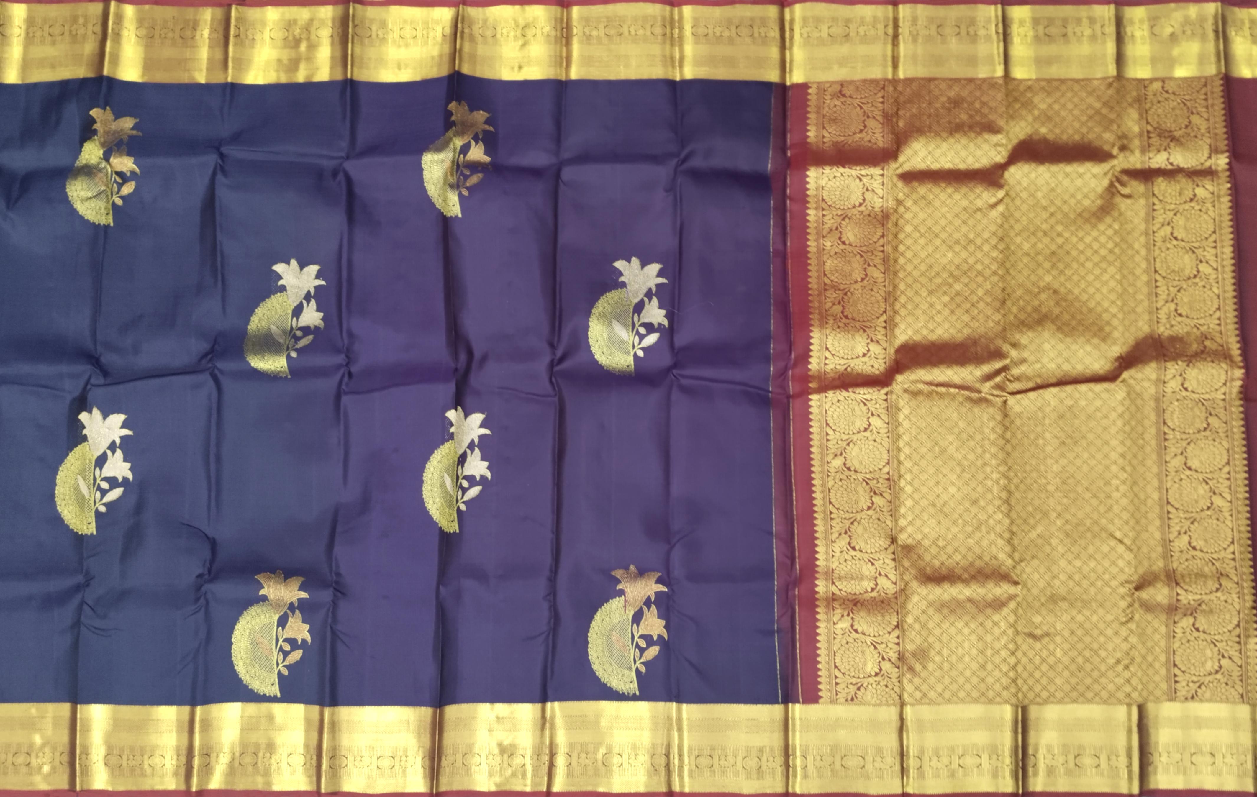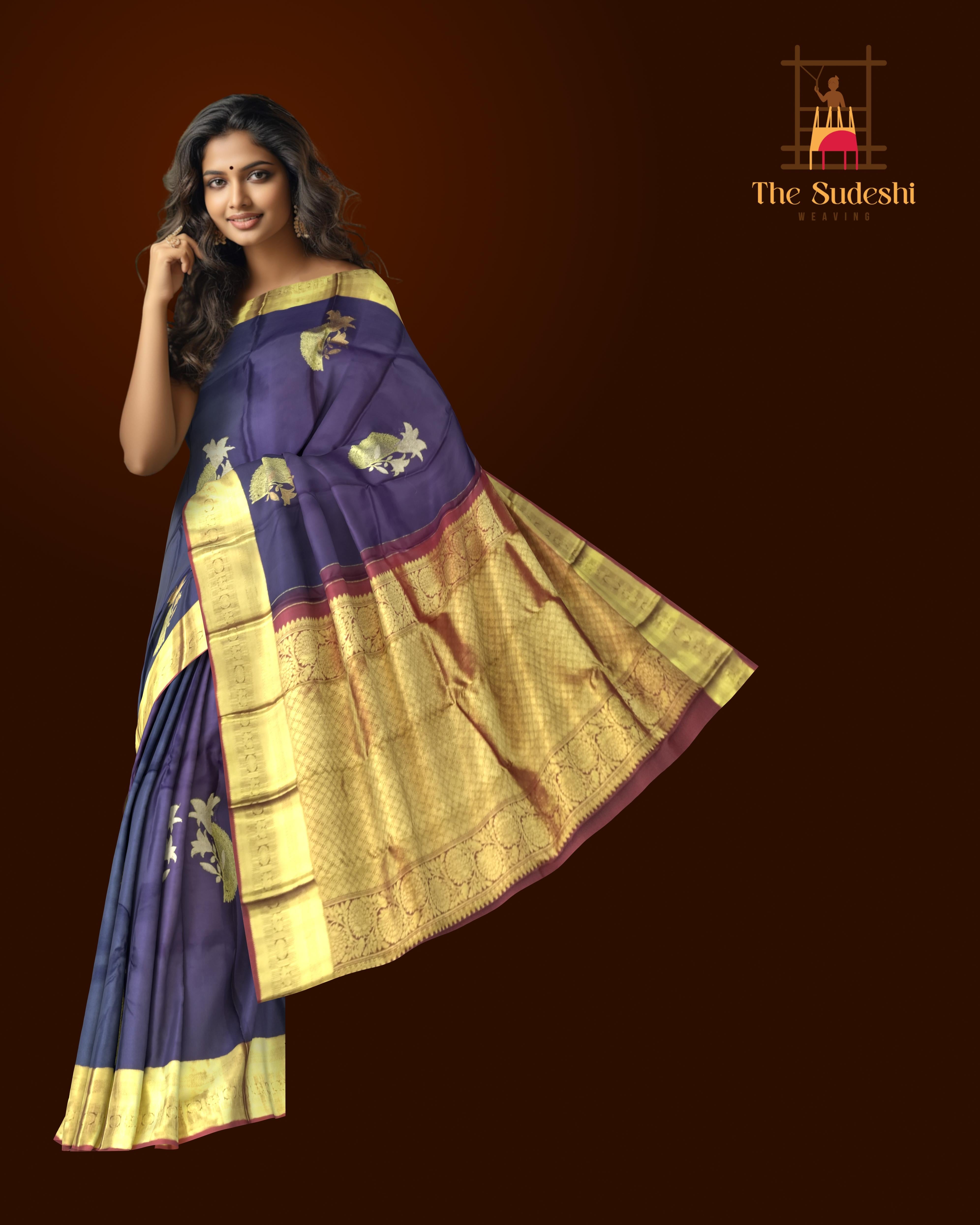 Immerse yourself in regal allure with this Deep Plum Kanchipuram Silk Saree adorned with Large Floral Motifs. The maroon border and pallu lend a traditional richness that perfectly complements the deep tones of the body. Each woven flower tells a tale of prosperity and timeless beauty — motifs that have graced Kanchi looms for generations. Kanchipuram Pure Silk Sarees are an ode to India’s sacred weaving legacy. Originating from Tamil Nadu’s heritage town, they are crafted from pure mulberry silk and zari, combining strength, sheen, and elegance. The floral patterns, often inspired by temple sculptures and garden motifs, symbolize fertility, joy, and divine abundance. Perfect for weddings, receptions, and grand festivities, this saree pairs gracefully with a maroon blouse and antique gold jewelry. Complete your look with a traditional bun and temple bangles for an effortlessly royal statement. Note: The appearance of the product’s colors may vary due to lighting conditions or your device’s screen calibration. For further assistance or additional images/videos, feel free to contact us at +91 97897 60367 or email at wecare@thesudeshiweaving.com.