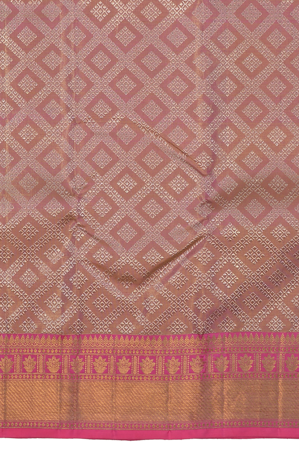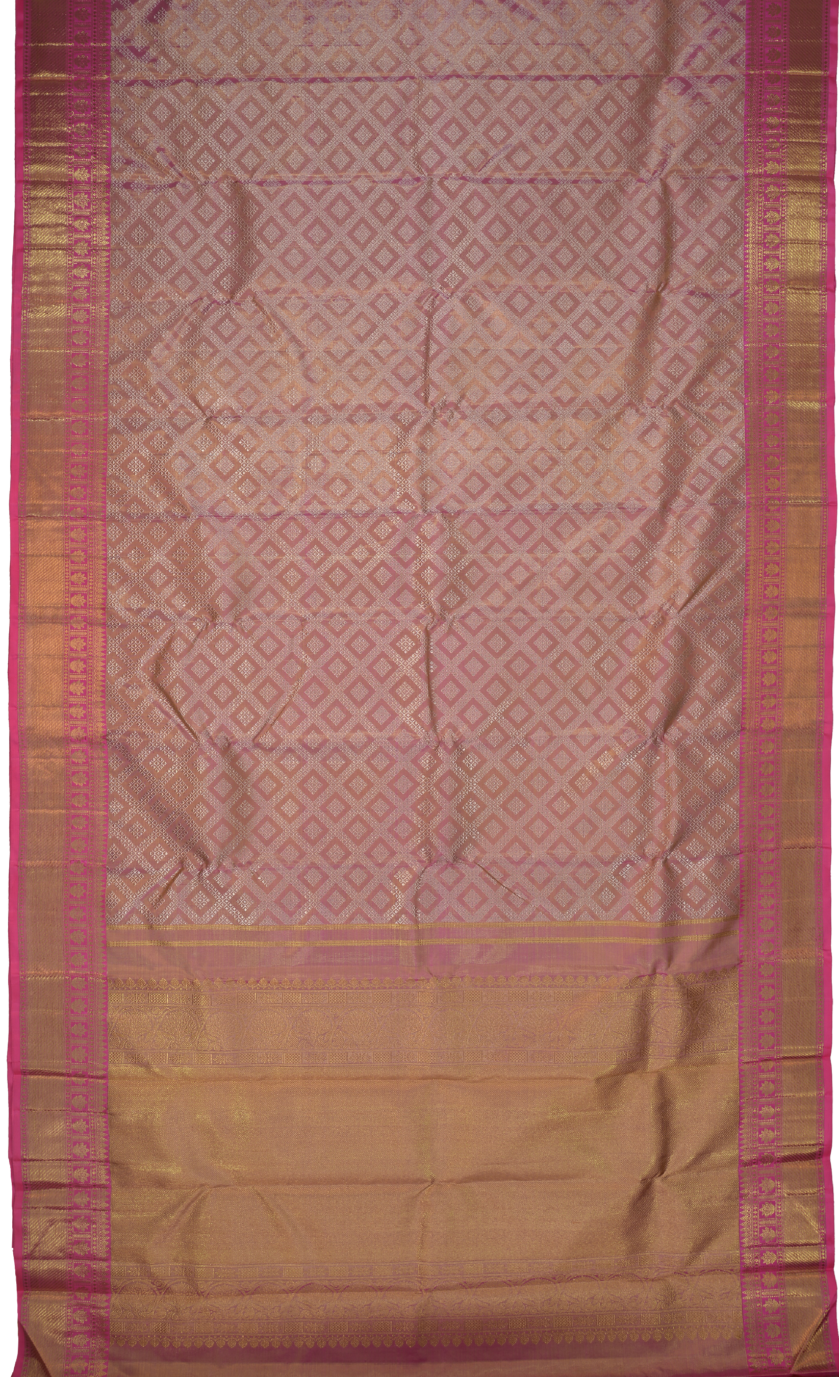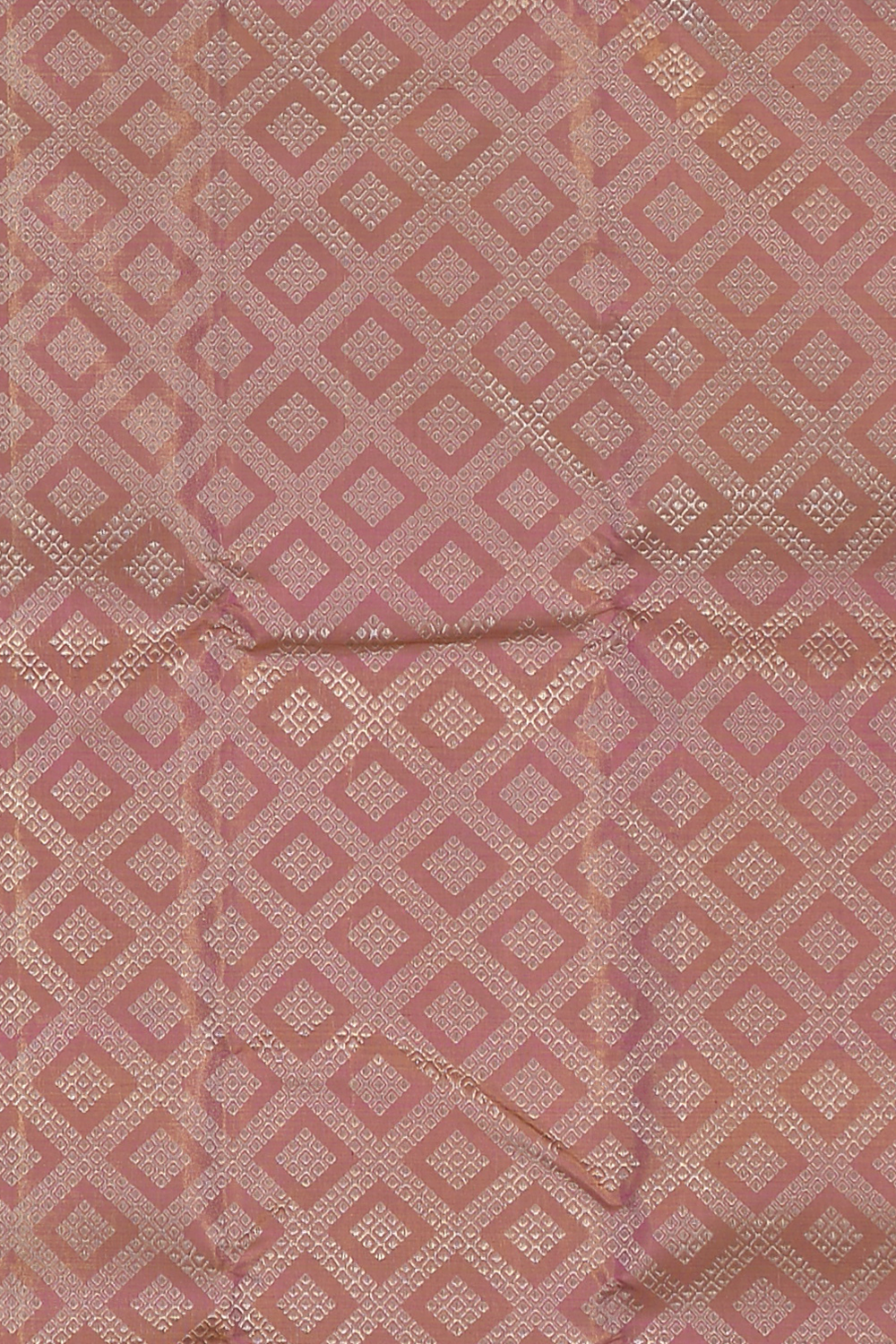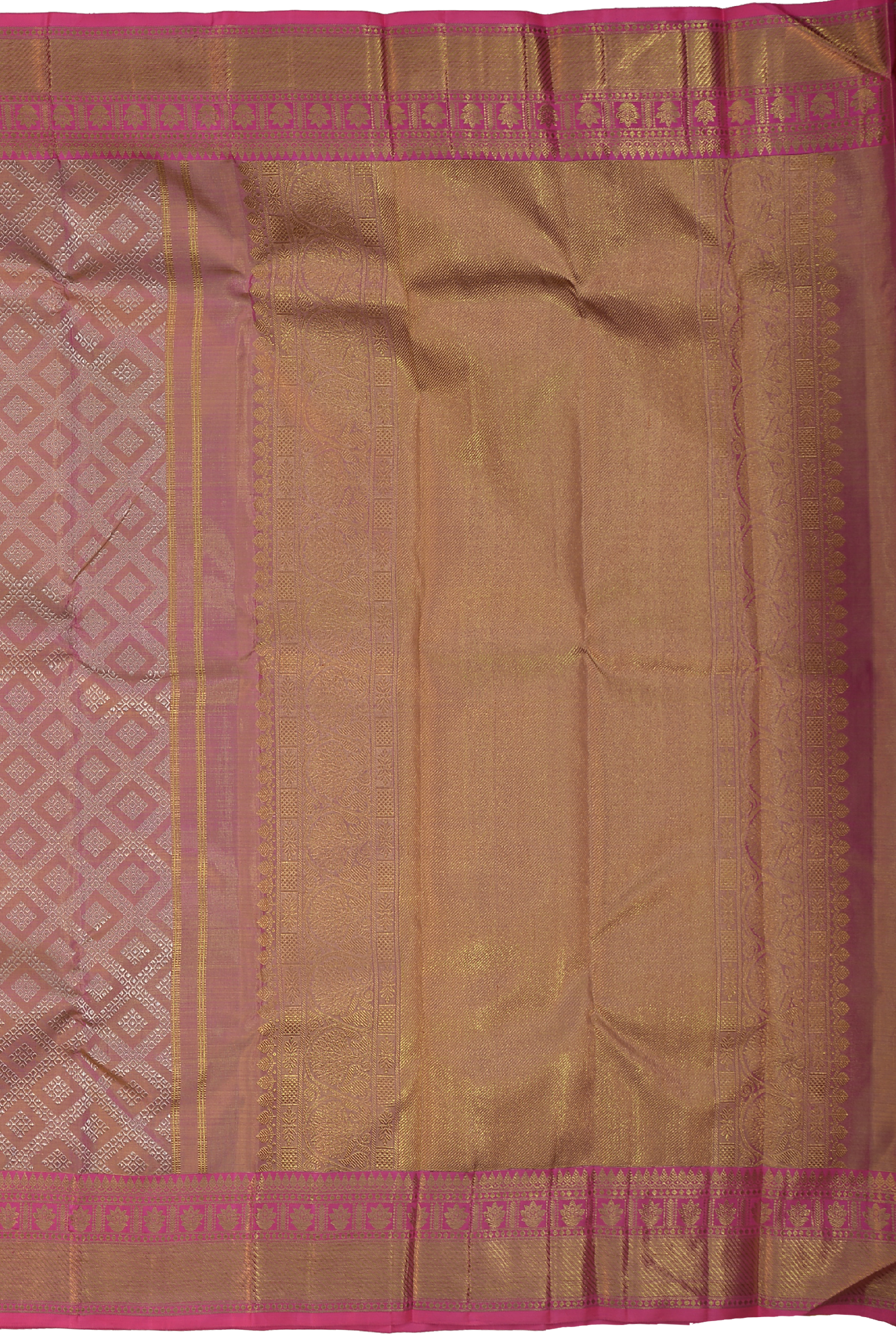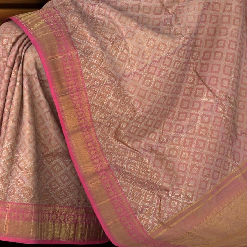 The jacquard body, adorned with diamond motifs, sings an ode to the skilled hands that breathe life into art. The contrasting dark candy pink pallu, embellished with Benarspet floral motifs, is a burst of richness, adding depth and drama to the ensemble.