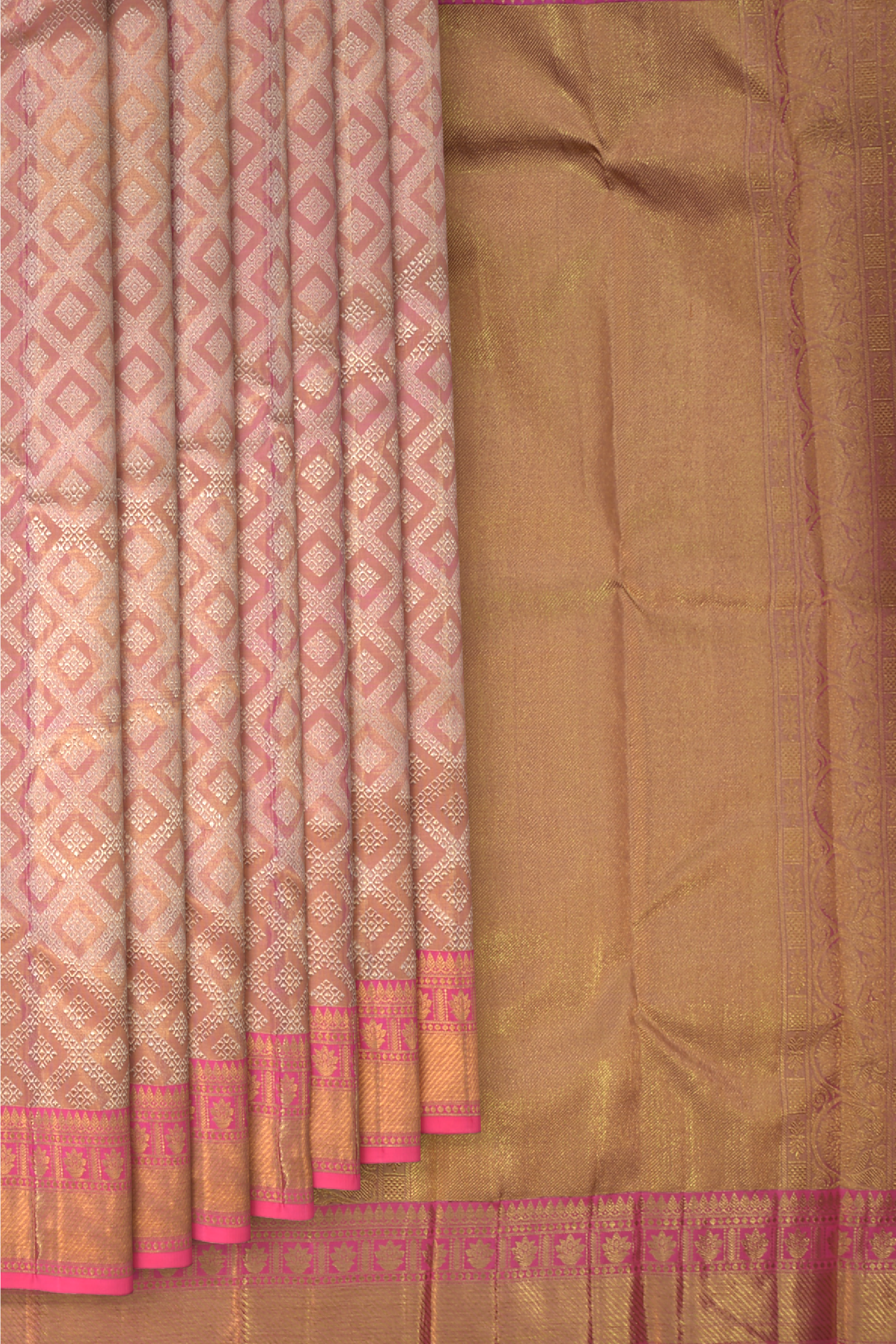 Waltz through a world where dreams are painted in soft pastels with this baby pink Kanchipuram silk saree. As gentle as a lullaby, it weaves tales of moonlit nights and starry skies.