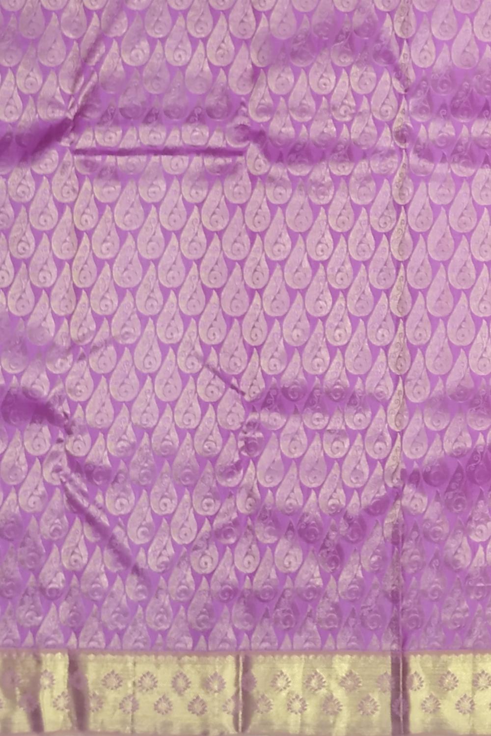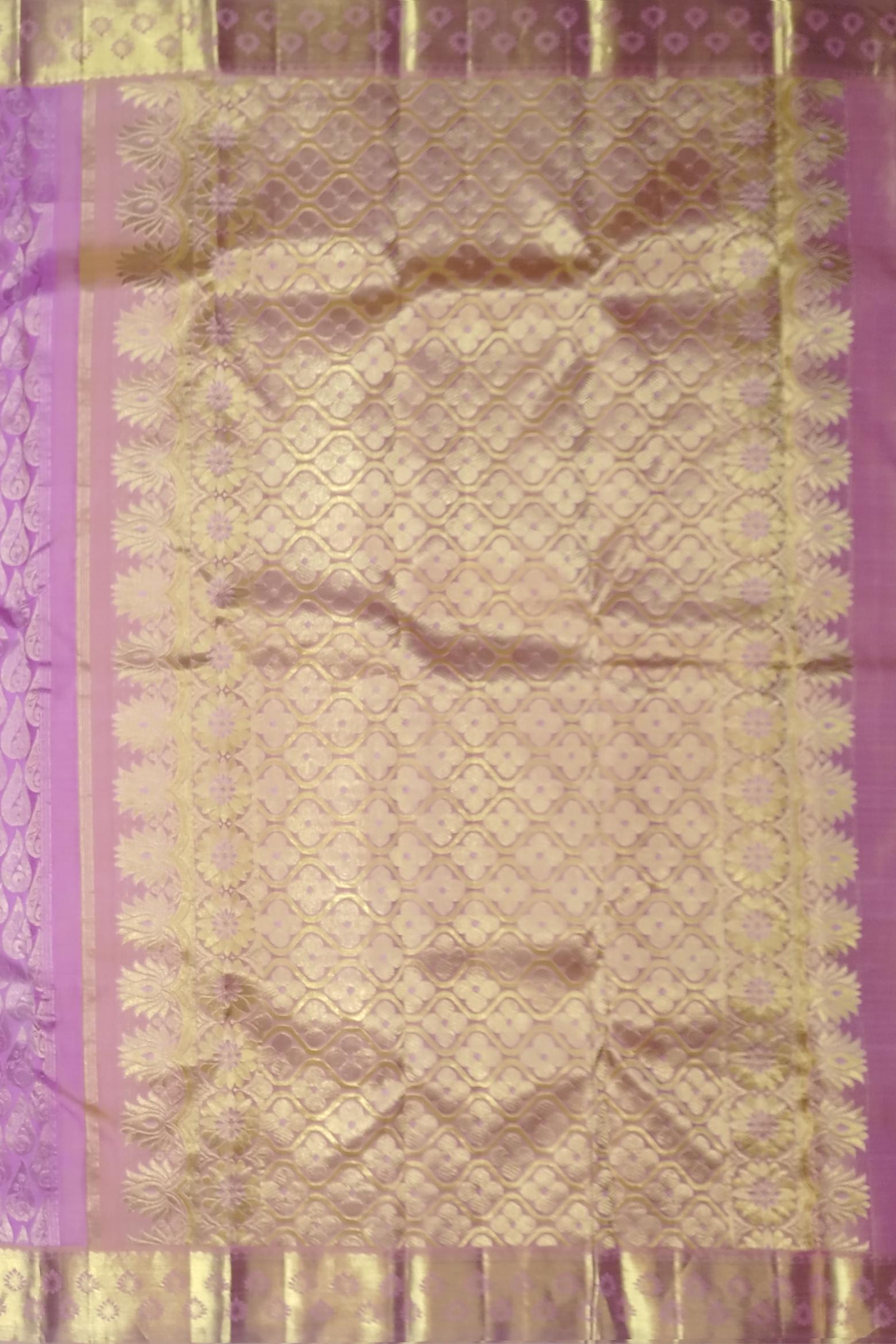 This dusty rose Kanchipuram silk saree features vertical bhuttas and is elevated with a contrast teal blue pallu. A subtle yet chic piece that blends tradition with a contemporary palette.