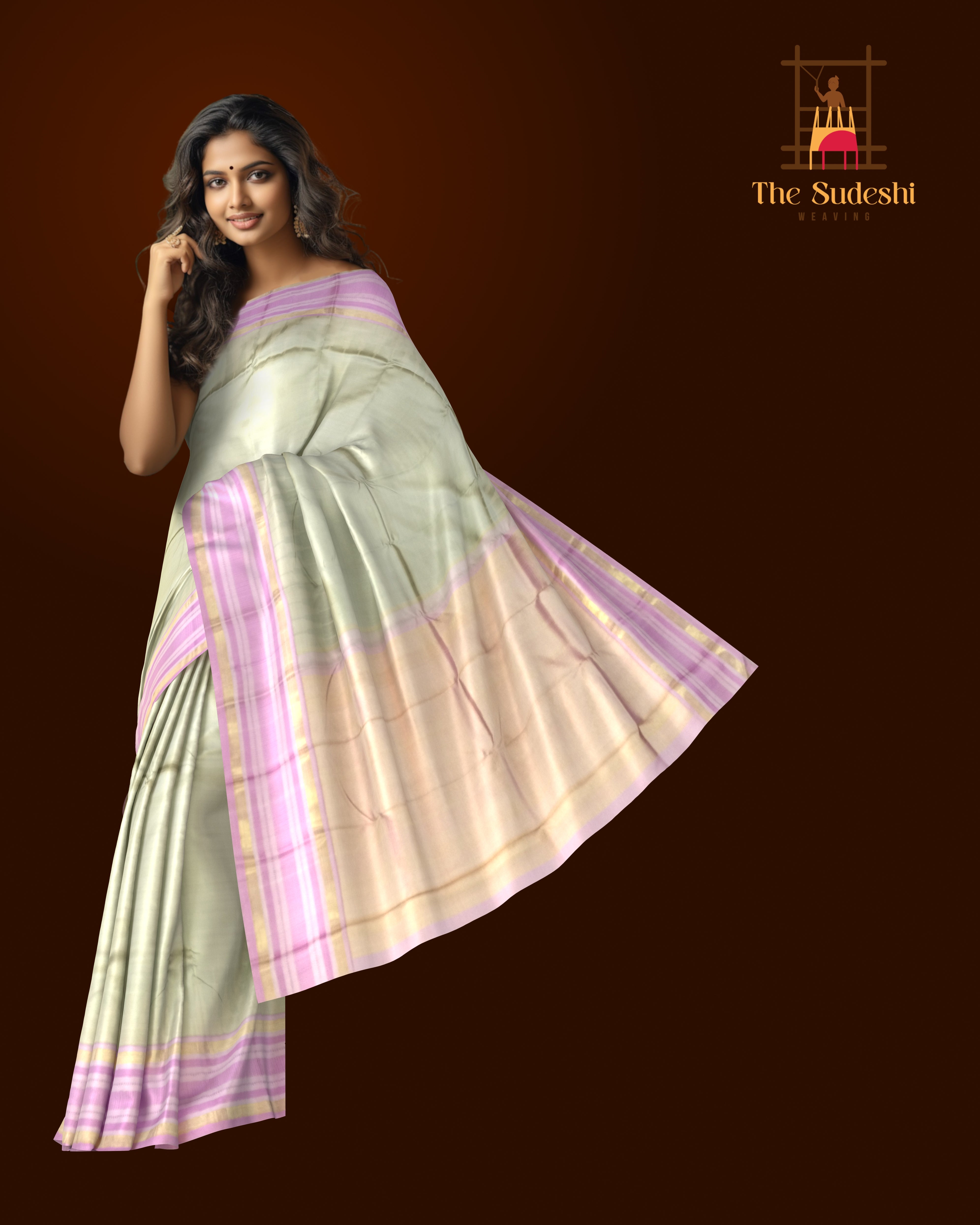 Hailing from the temple town of Kanchipuram, this saree carries with it a legacy of divine craftsmanship. The temple border, inspired by the towering gopurams of South Indian temples, signifies divinity and spiritual power. Woven from pure mulberry silk, it is a timeless representation of devotion, elegance, and superior handloom artistry.