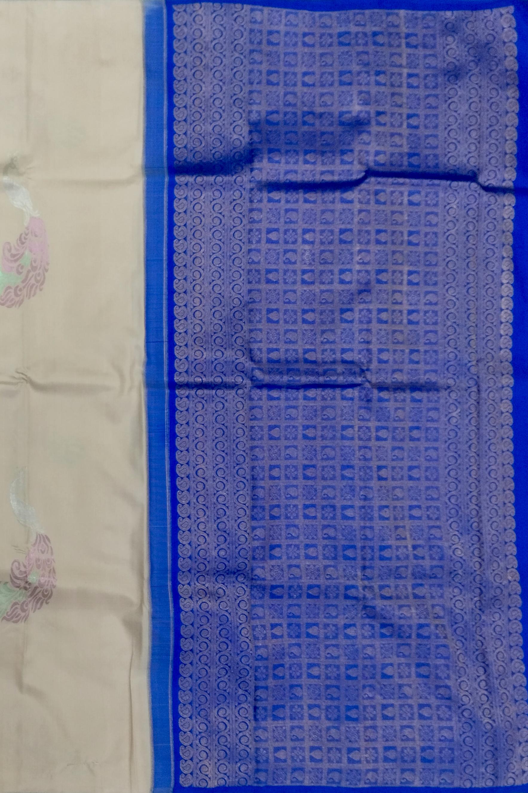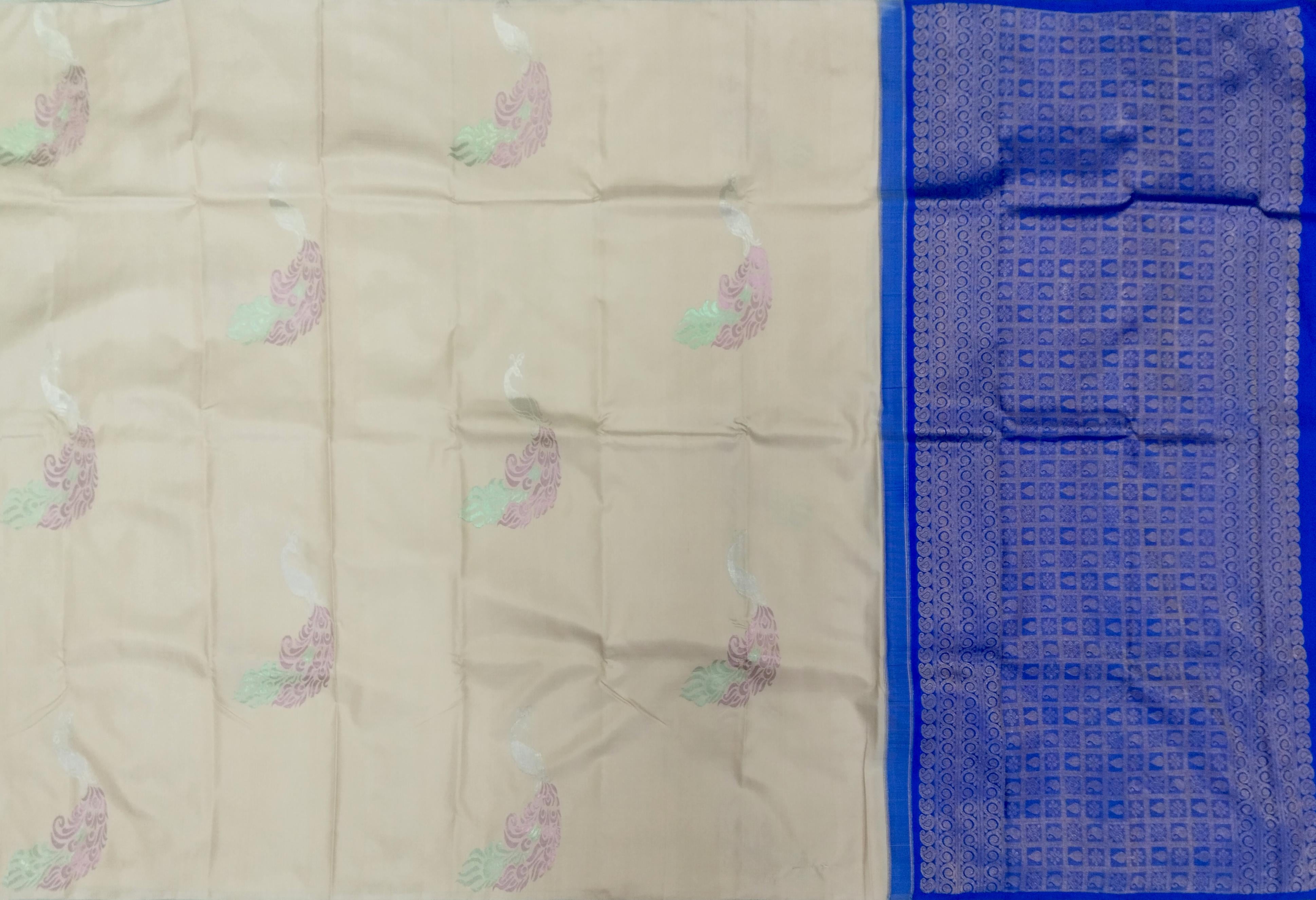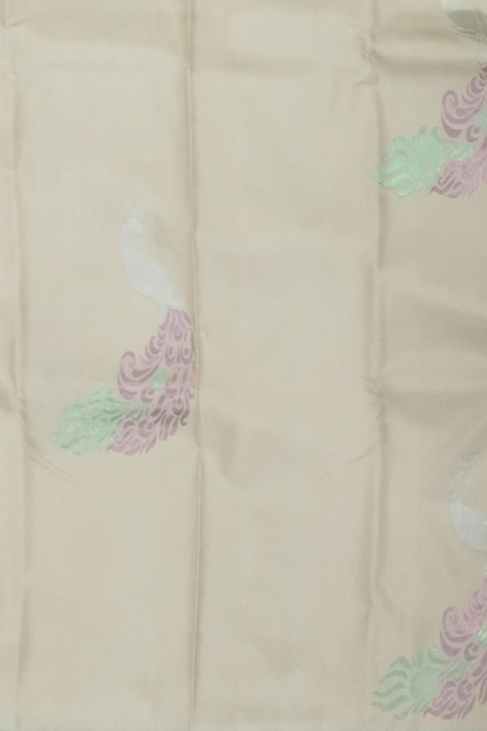 A symbol of grace and tradition, this beige Kanchipuram silk saree is adorned with mesmerizing peacock threadwork, making it a timeless masterpiece. The intricate peacock motifs, representing beauty and prosperity, are woven with precision, creating a regal look. With its borderless design, the saree showcases an uninterrupted flow of artistry, complemented by a striking royal blue pallu and blouse.