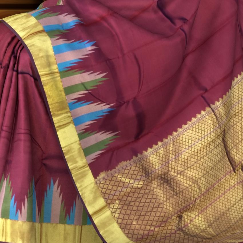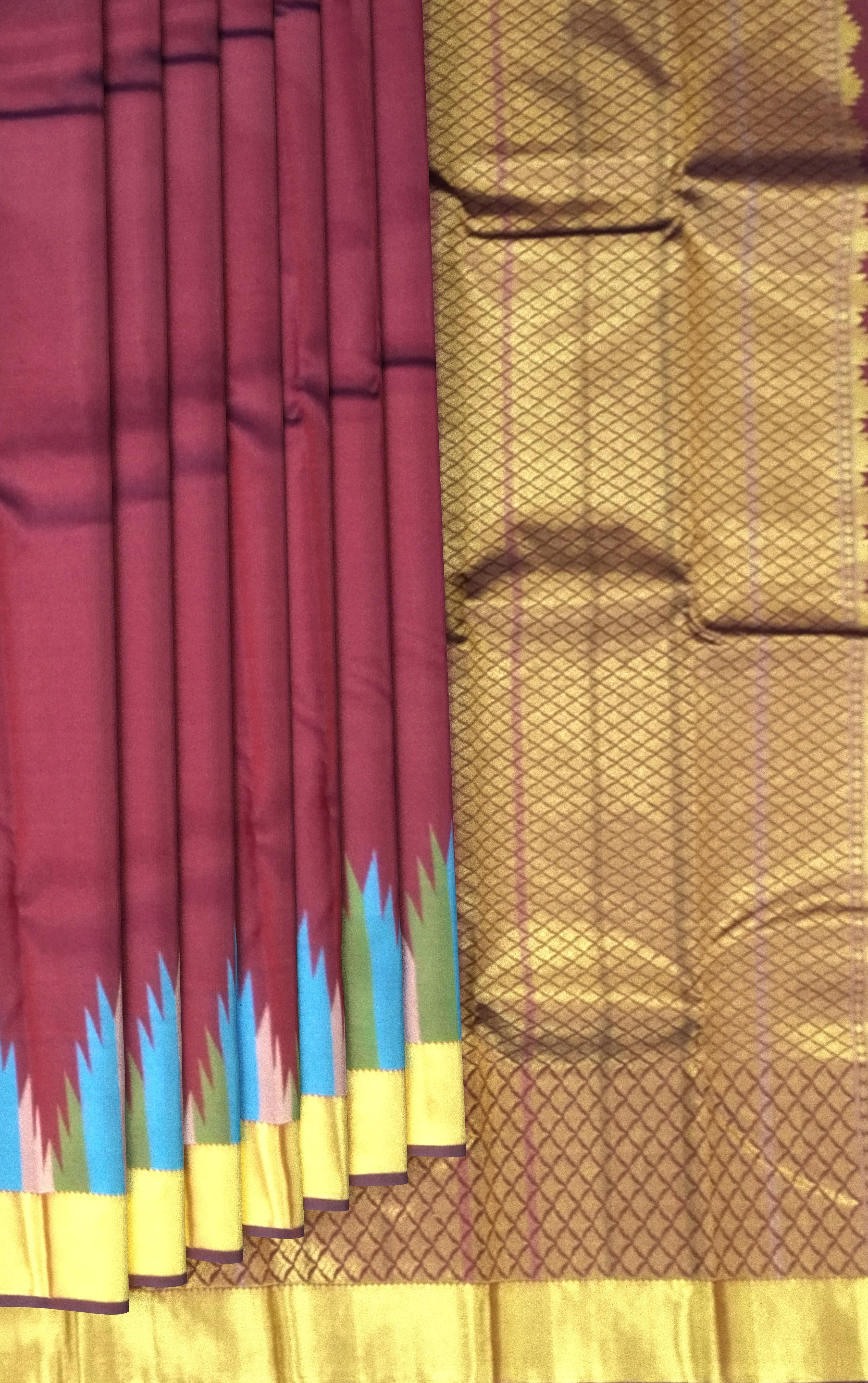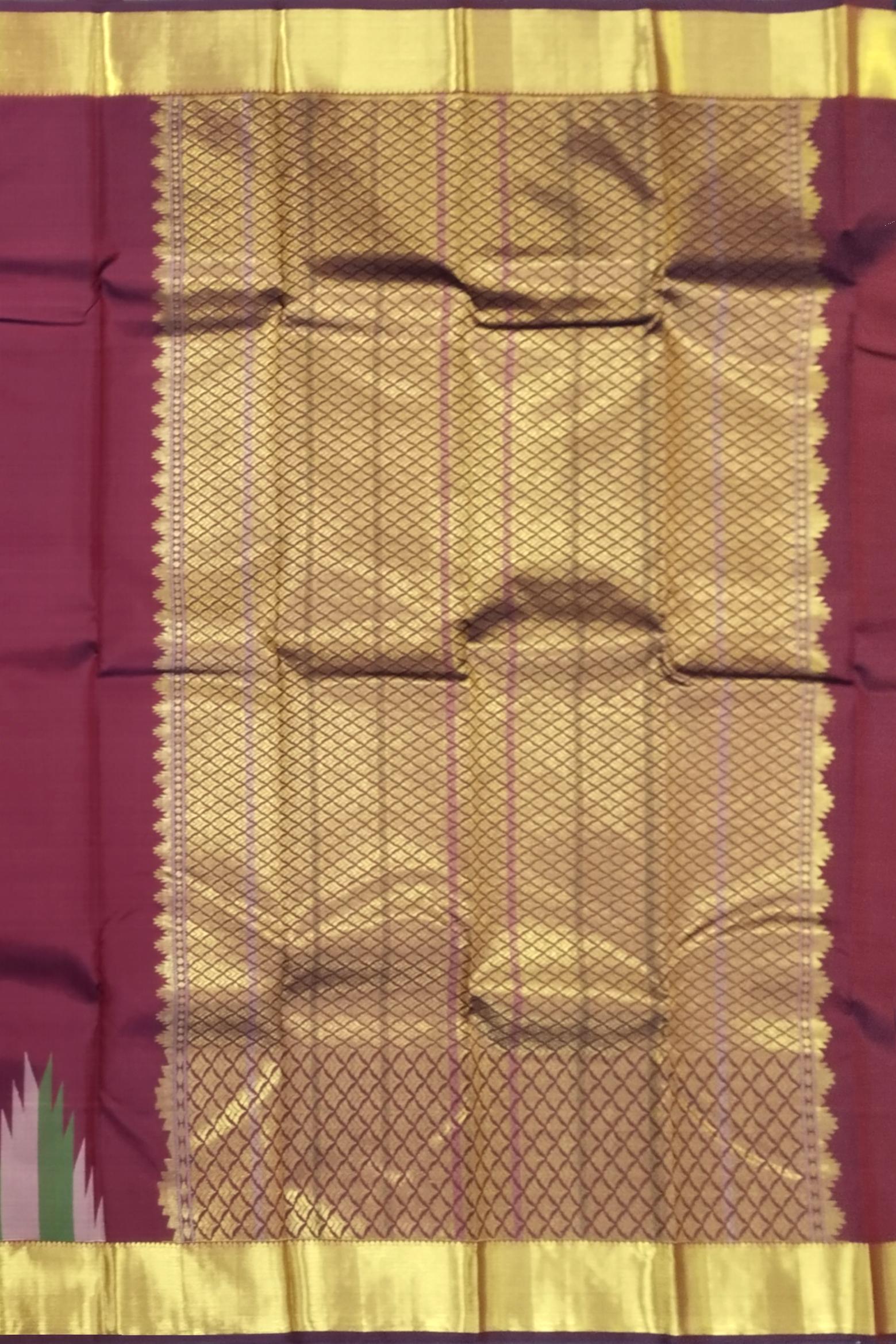 Temple borders in Kanchipuram sarees symbolize divine blessings and prosperity, making them an auspicious choice for religious and cultural celebrations. The fine thread work woven into the fabric showcases the meticulous craftsmanship of skilled artisans, preserving the heritage of South Indian textile artistry.