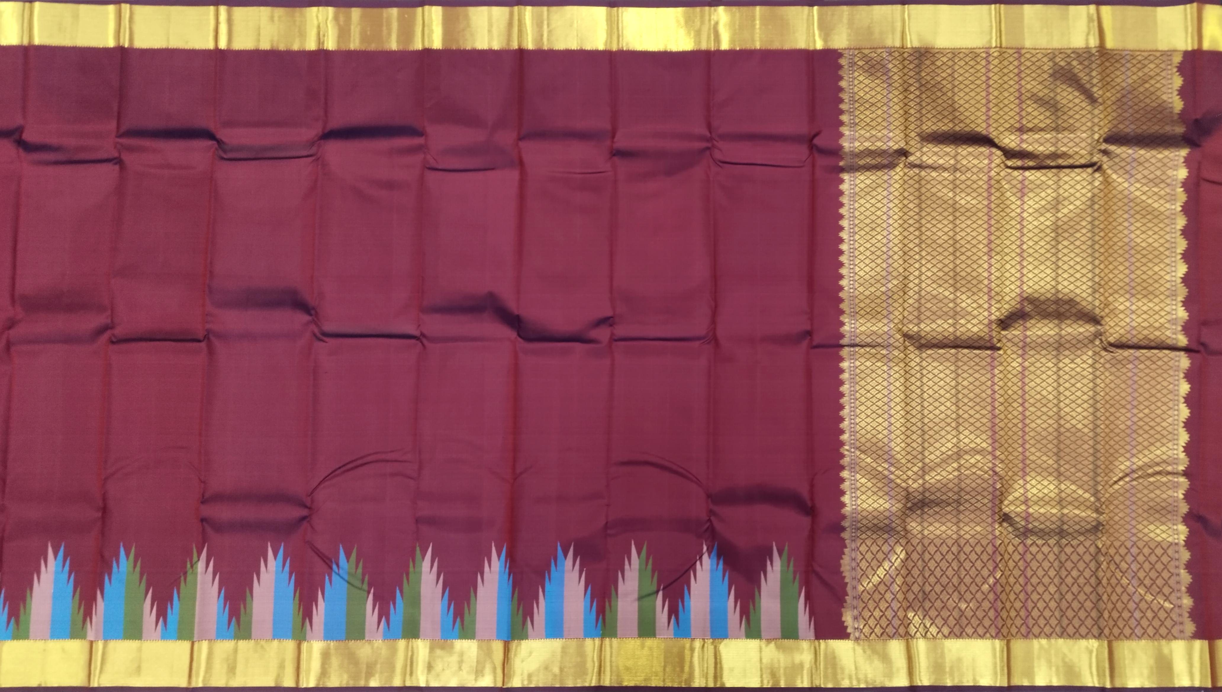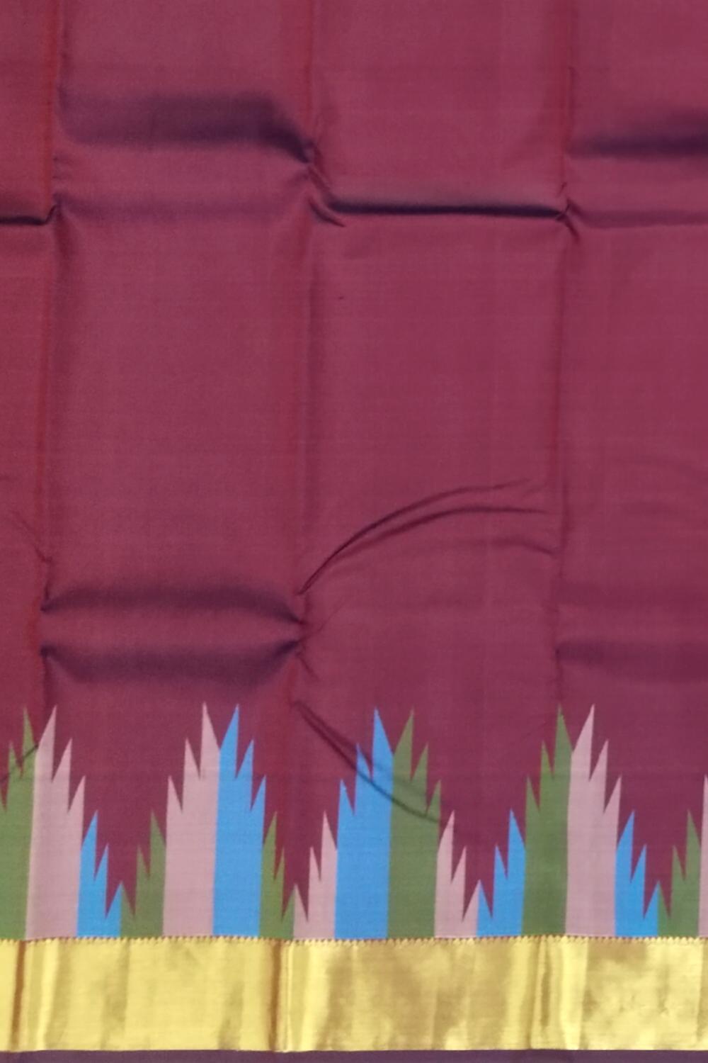 Make a striking impression with this maroon Kanchipuram silk saree, gracefully designed with a temple border and intricate blue and green thread work. The rich maroon body lends a deep and luxurious charm, while the detailed thread work along the border adds a touch of artistic brilliance. This saree is a classic choice for those who cherish traditional handloom weaves.