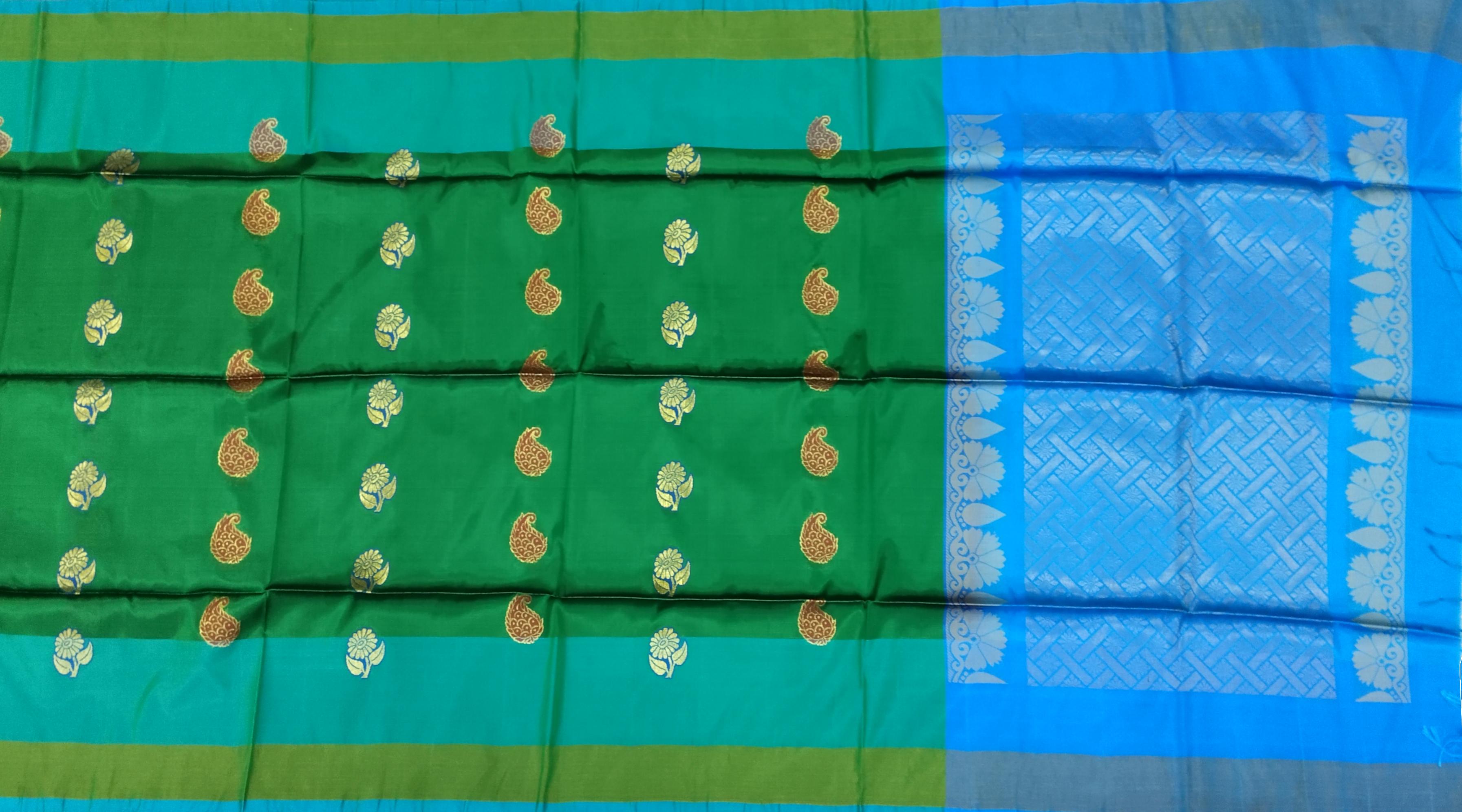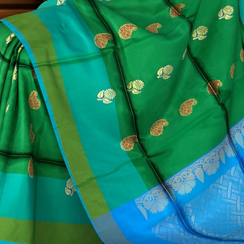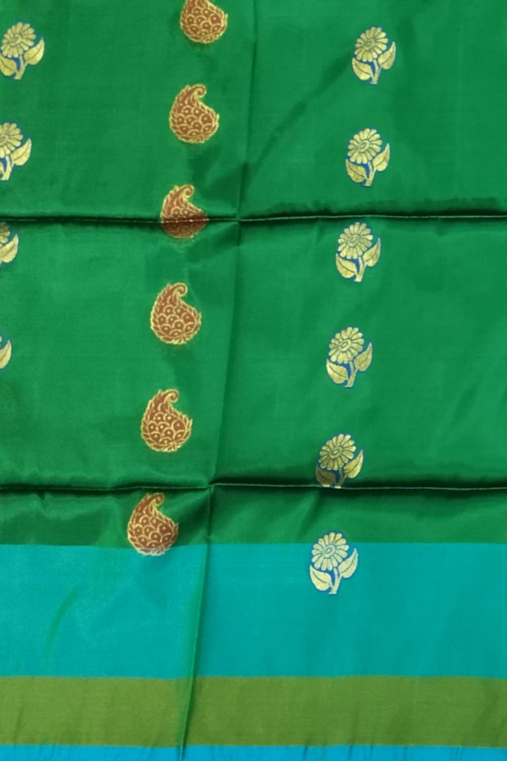 Discover the timeless allure of this exquisite Kanchipuram Silk Saree, where tradition meets unparalleled artistry. The body, a rich emerald green, is adorned with intricate mango and floral motifs, a classic design symbolizing prosperity and beauty in South Indian culture. These elaborate patterns are meticulously handwoven, showcasing the dexterity of the weavers. The saree’s distinctive dual-tone quality, transitioning to a captivating bluish-green hue, creates a mesmerizing play of colors, adding depth and uniqueness to this traditional masterpiece.