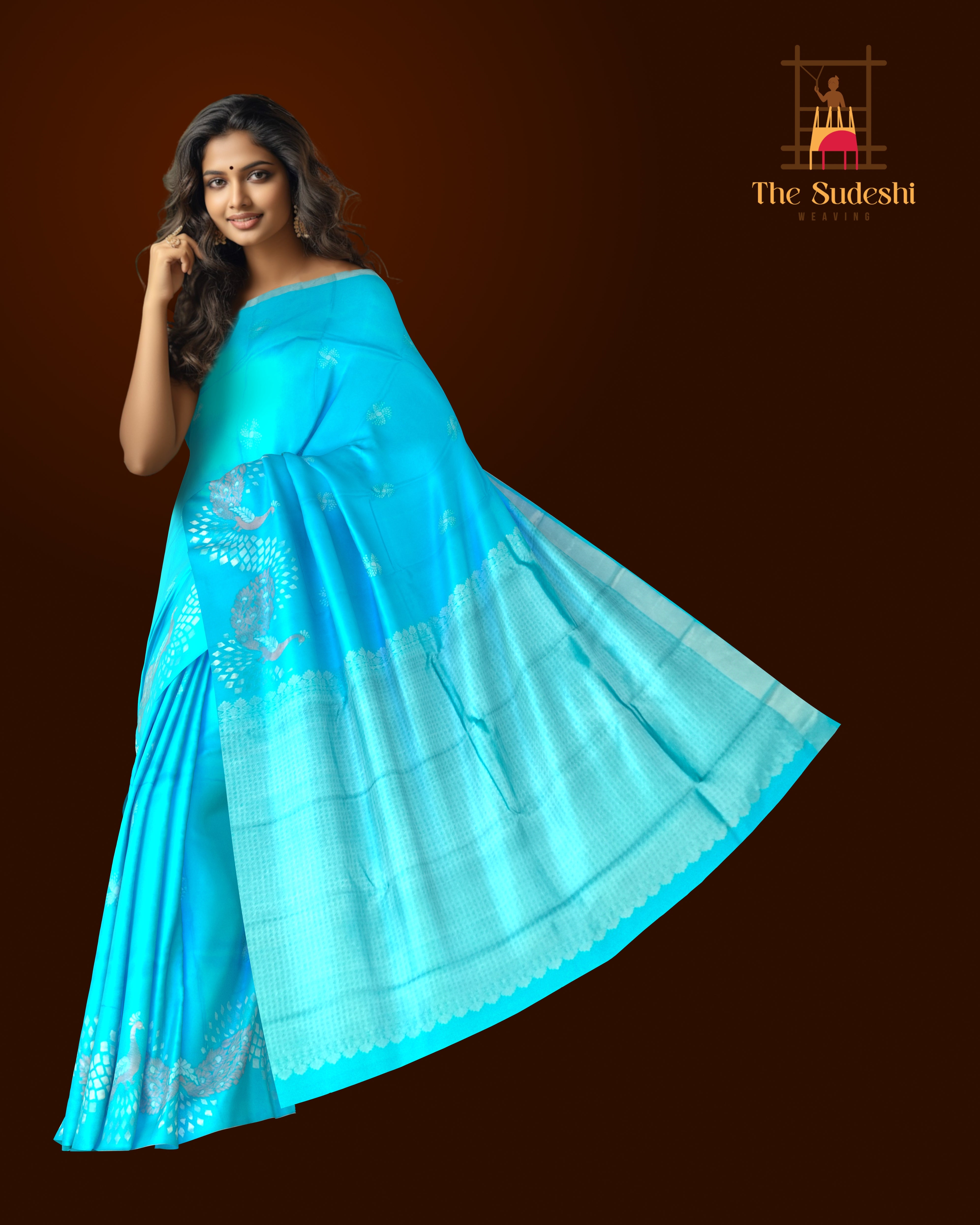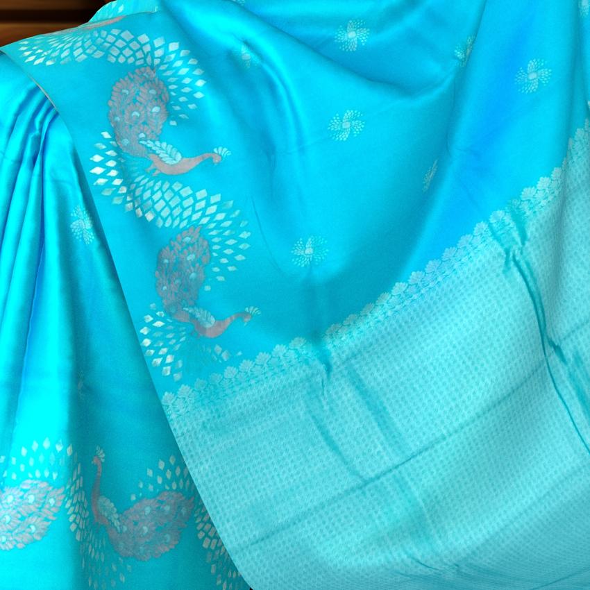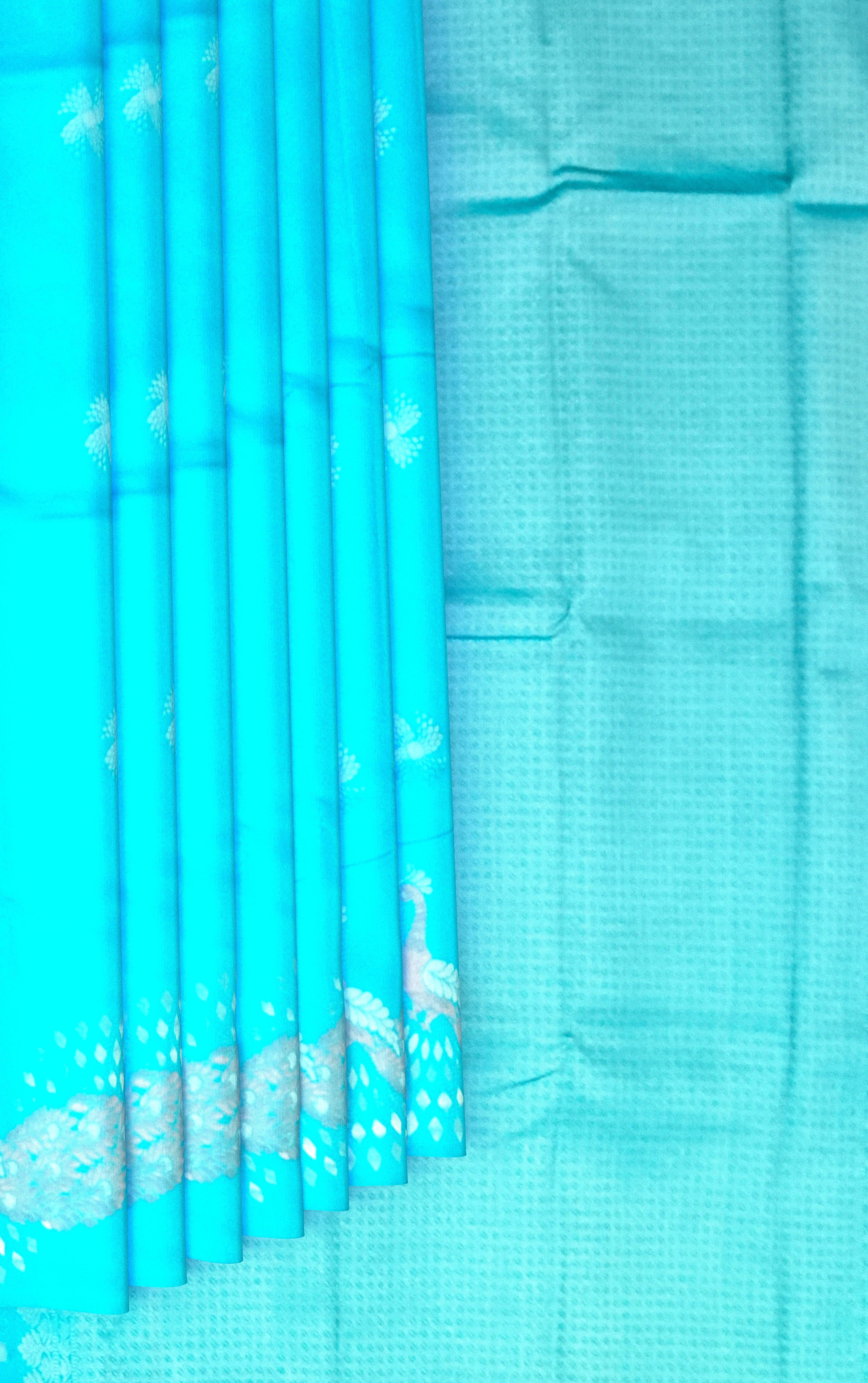 Elevate your style with this breathtaking sky blue Kanchipuram silk saree, featuring a unique one-side border adorned with graceful peacock motifs. The peacock, a symbol of beauty and grace, is intricately woven into the fabric, adding a touch of regality. With its borderless design on one side and a self-colored pallu, this saree offers a blend of tradition and contemporary aesthetics.