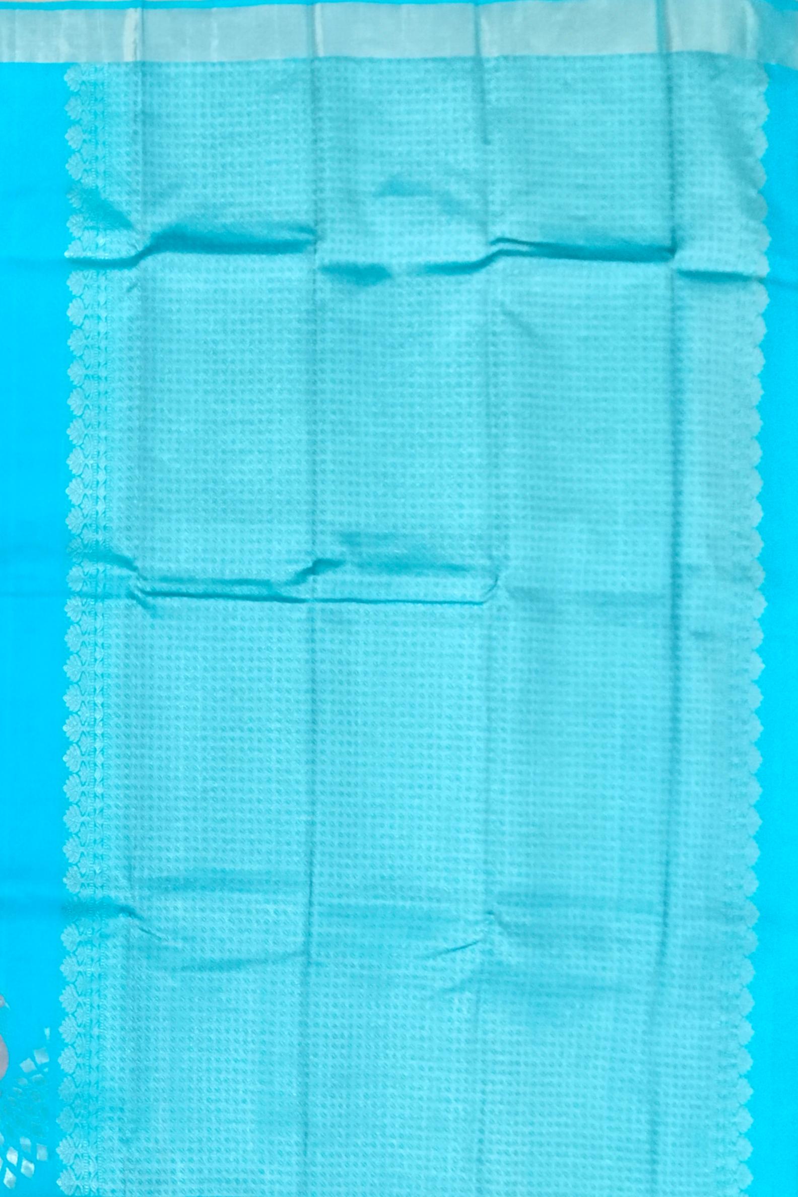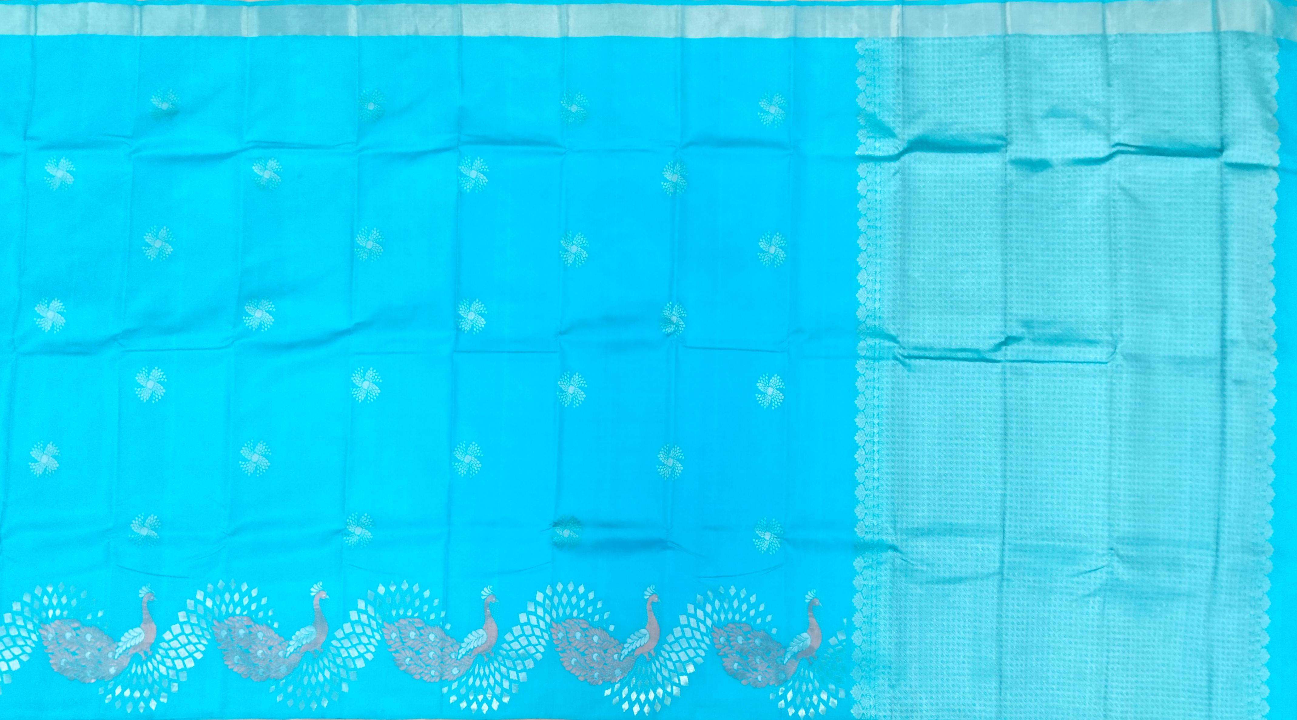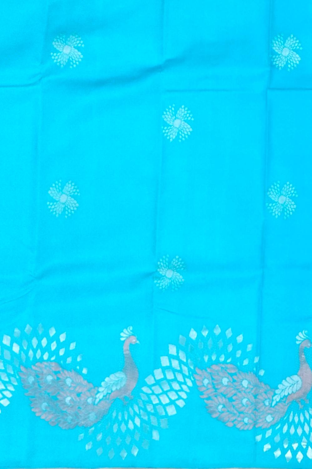 Elevate your style with this breathtaking sky blue Kanchipuram silk saree, featuring a unique one-side border adorned with graceful peacock motifs. The peacock, a symbol of beauty and grace, is intricately woven into the fabric, adding a touch of regality. With its borderless design on one side and a self-colored pallu, this saree offers a blend of tradition and contemporary aesthetics.