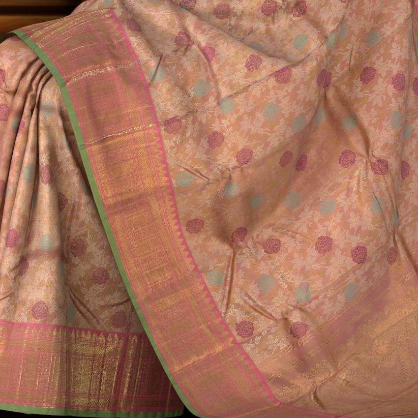 Dive into a poetic realm with this light baby pink Kanchipuram silk saree, reminiscent of delicate blossoms under the gentle caress of dawn. Each drape is a symphony of soft hues, whispering tales of enchanted gardens and timeless beauty.