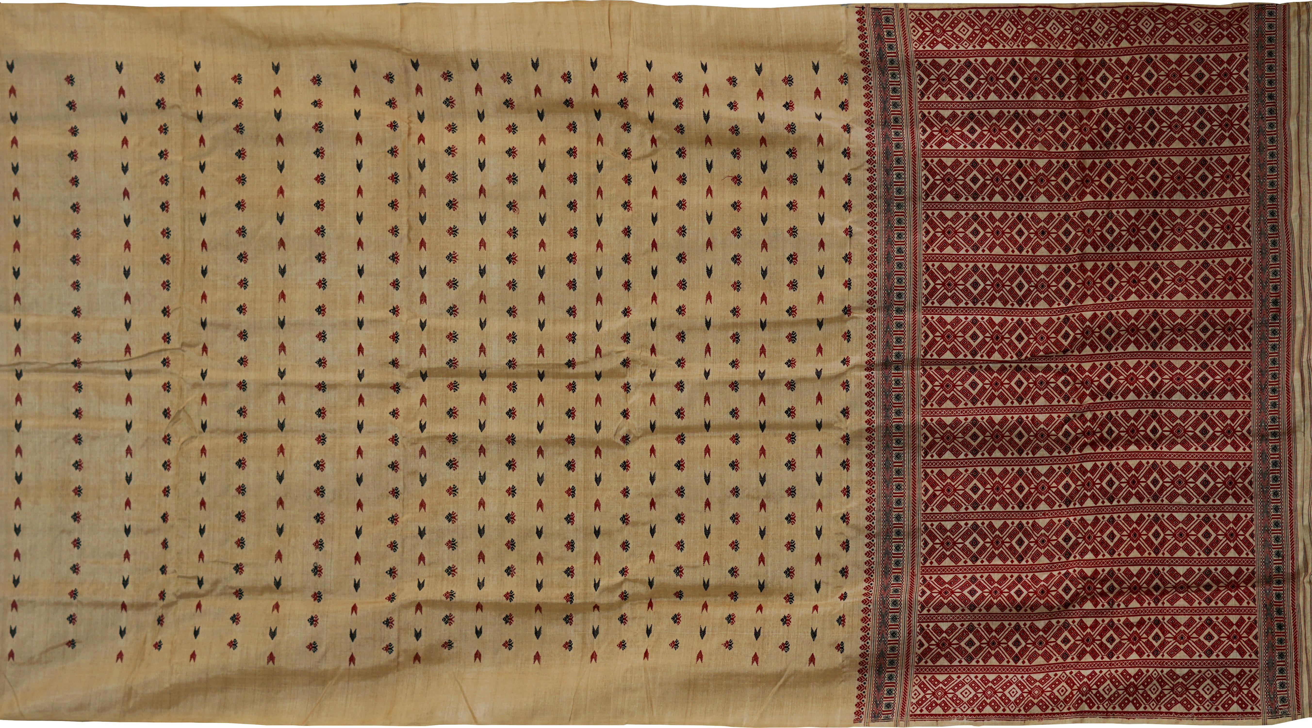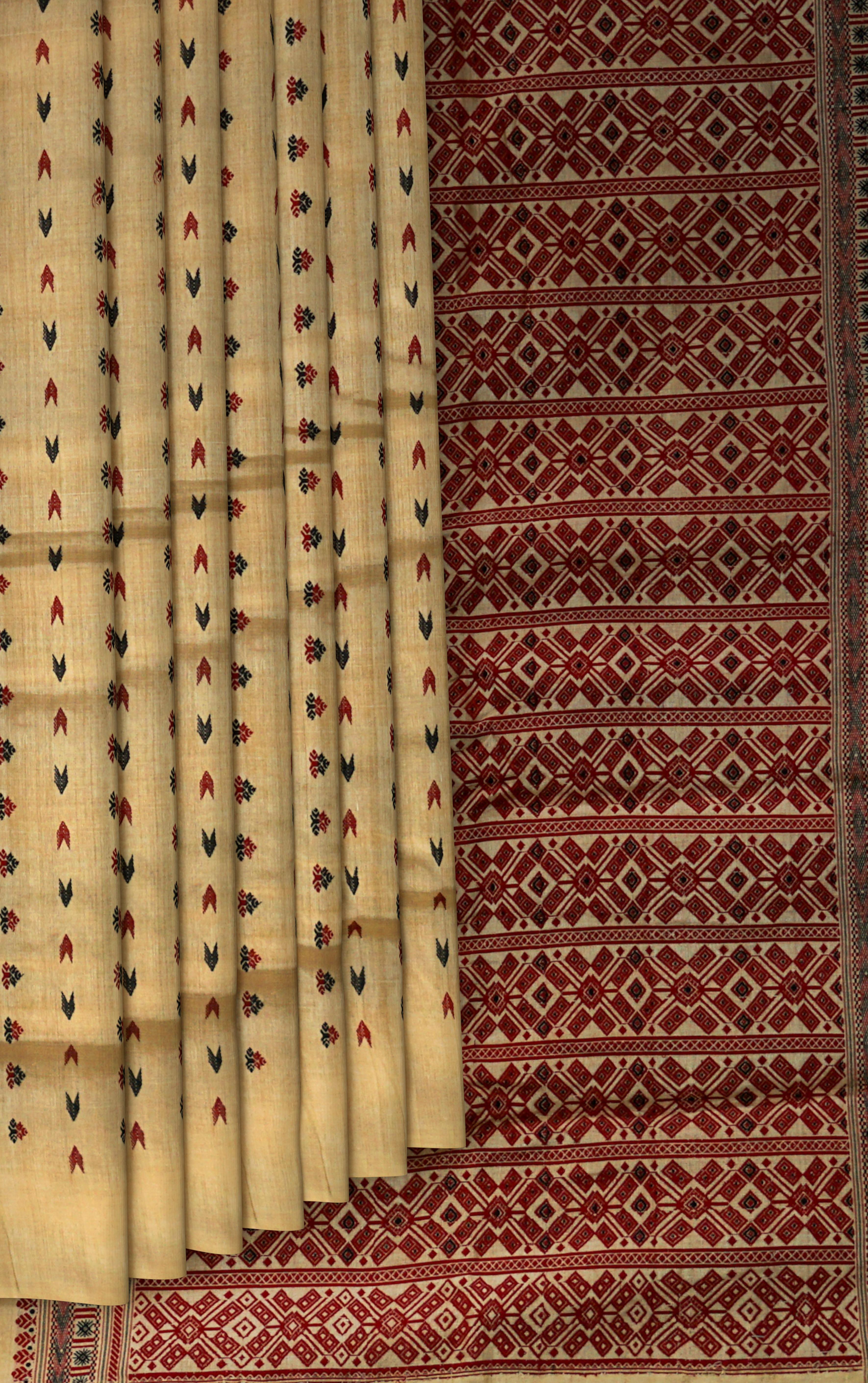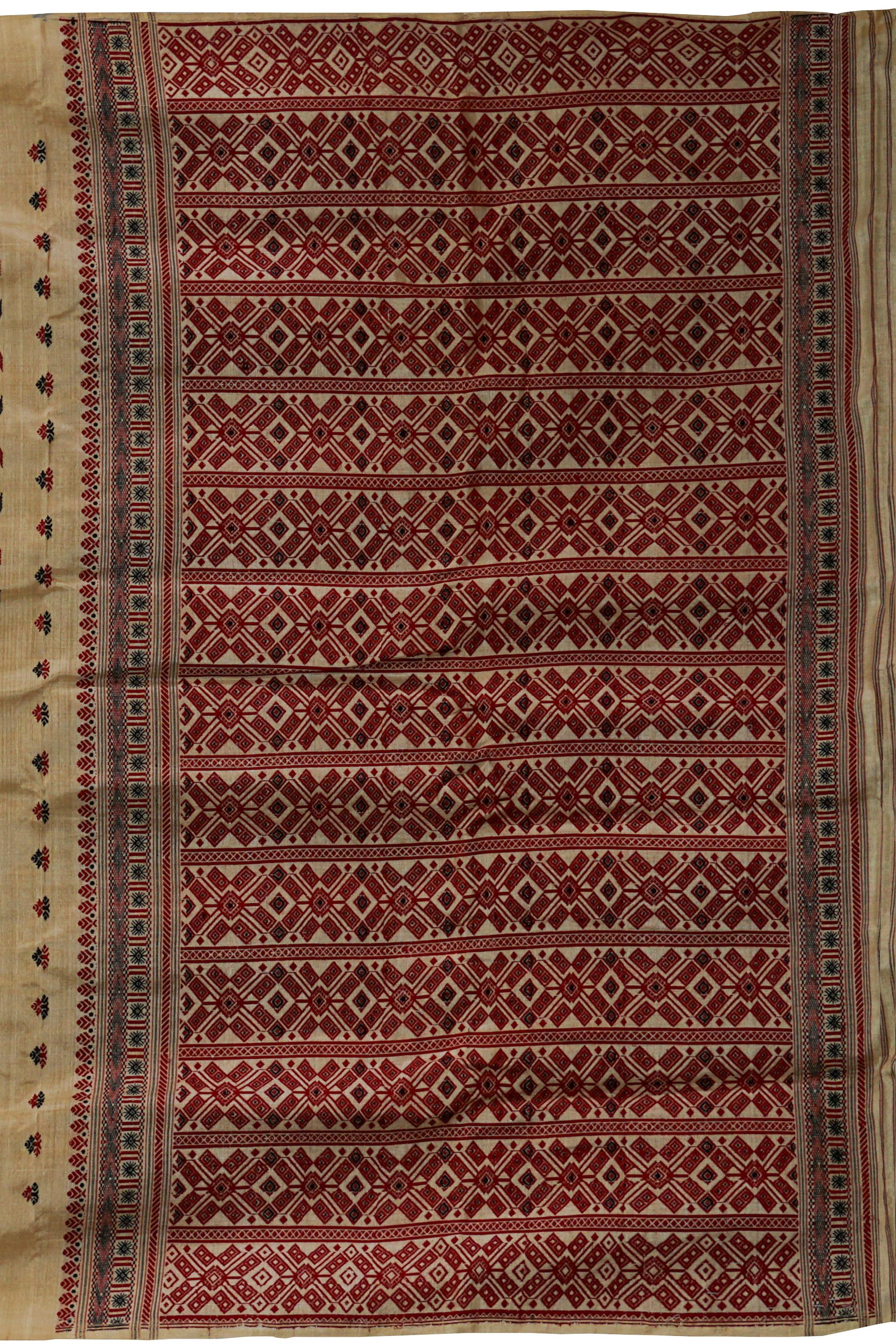 The motifs on this saree are inspired by Assamese culture and nature, featuring geometric and stylized patterns that symbolize flowers, plants, and traditional artifacts. These motifs, woven using the extra-weft technique and acrylic, add a raised, embossed effect that enhances the saree's texture and depth. The combination of gold and red is both regal and timeless, appealing to women of all ages.