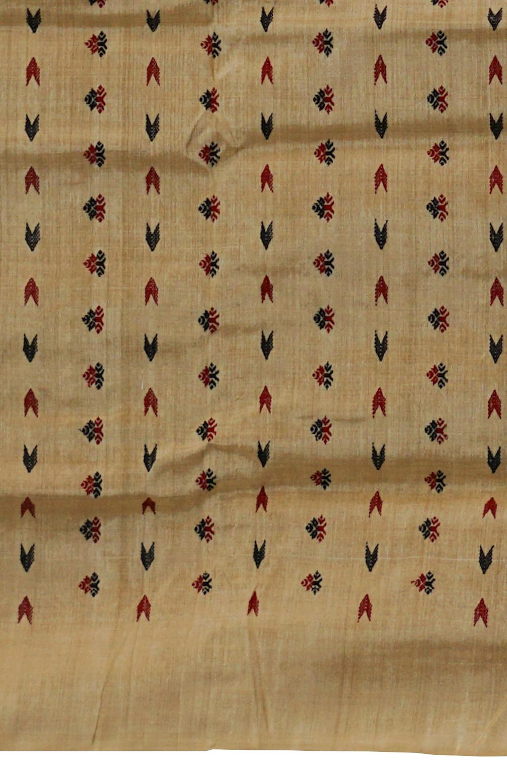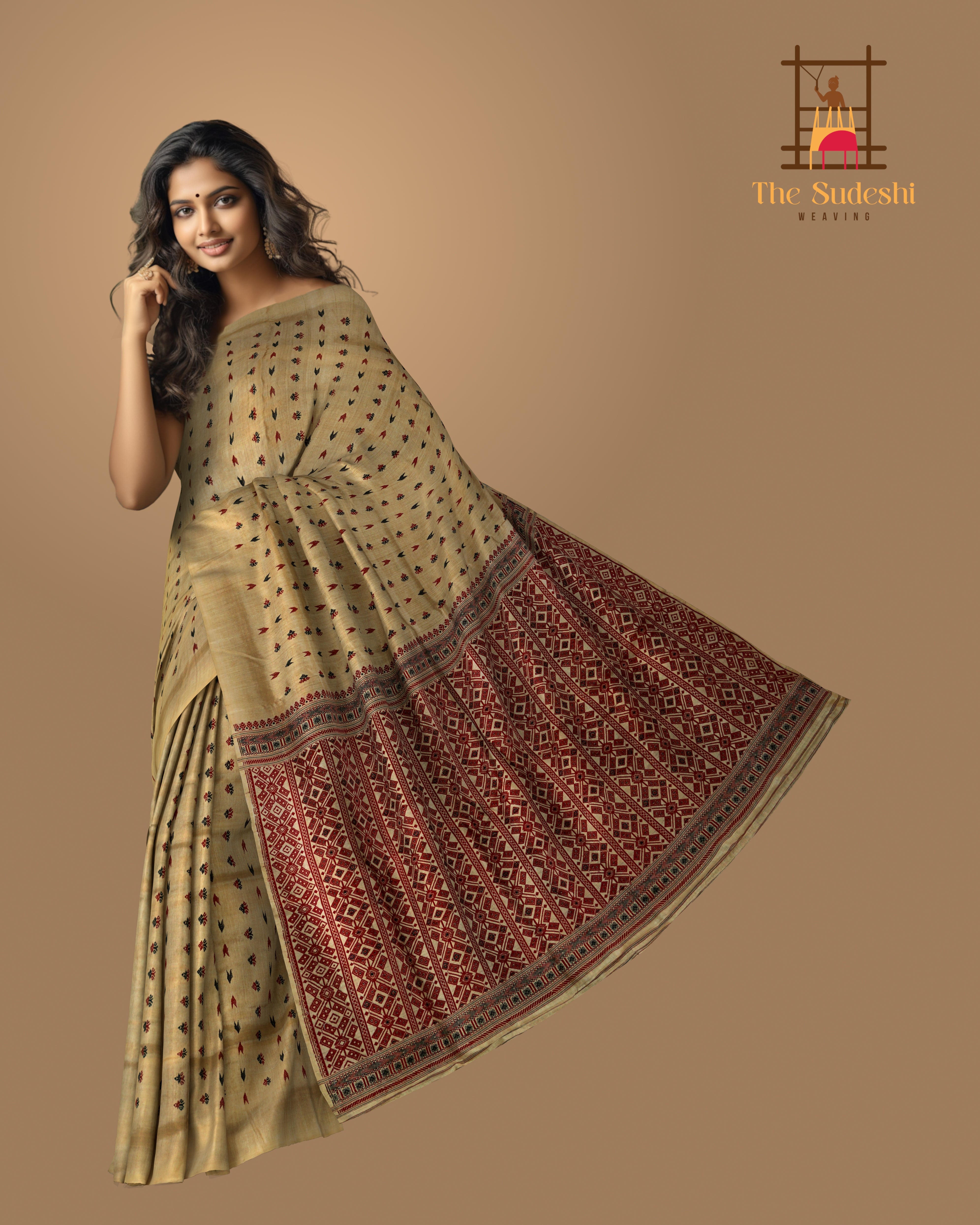 Discover the opulence of our Gold Tassar-Muga Silk Saree with a Red Border and Intricate Buttis & Motifs. This saree is crafted from a luxurious blend of Tassar and Muga silk, offering a rich and textured drape that feels exquisite against the skin. The shimmering gold body adorned with delicate buttis and motifs creates a stunning contrast with the bold red border, making this saree perfect for grand occasions.