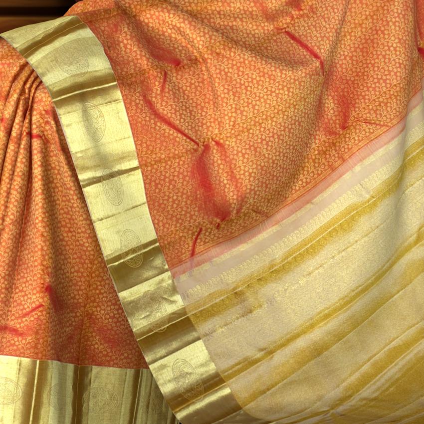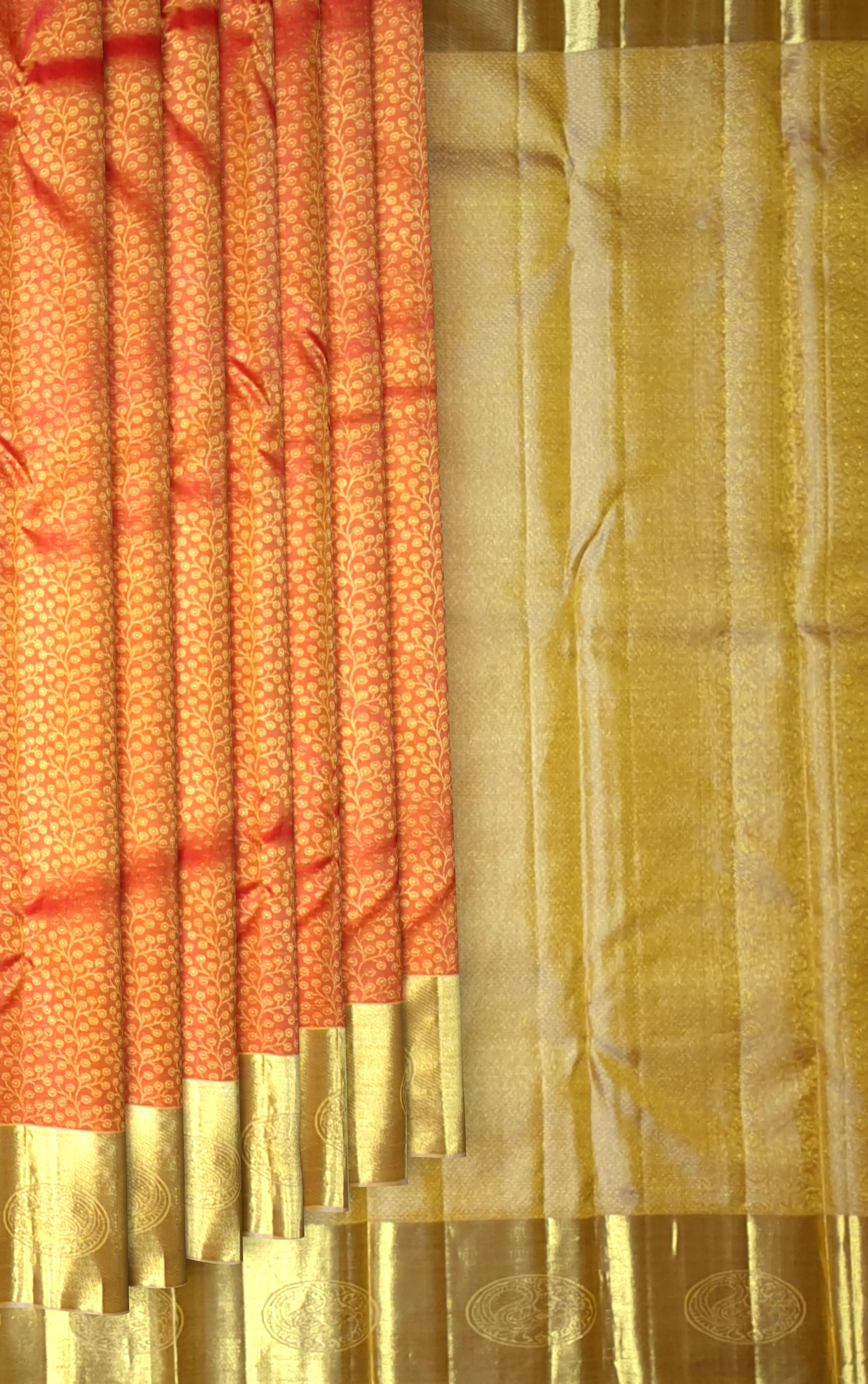 The floral brocade design is a classic hallmark of Kanchipuram silk artistry, symbolizing fertility, beauty, and spiritual growth. This saree captures the spirit of South India’s silk-weaving legacy, where vibrant colors and motifs reflect the region’s deep cultural roots. The golden orange shade, often associated with festivity and divinity, adds a regal touch, while the subtle sheen of zari underscores the artisanal finesse behind every thread.