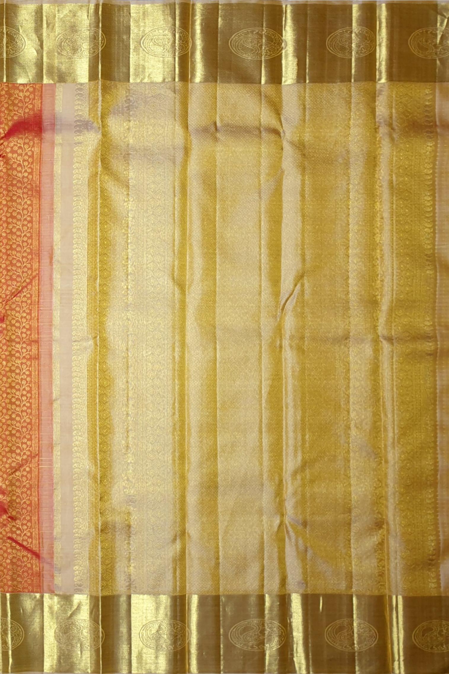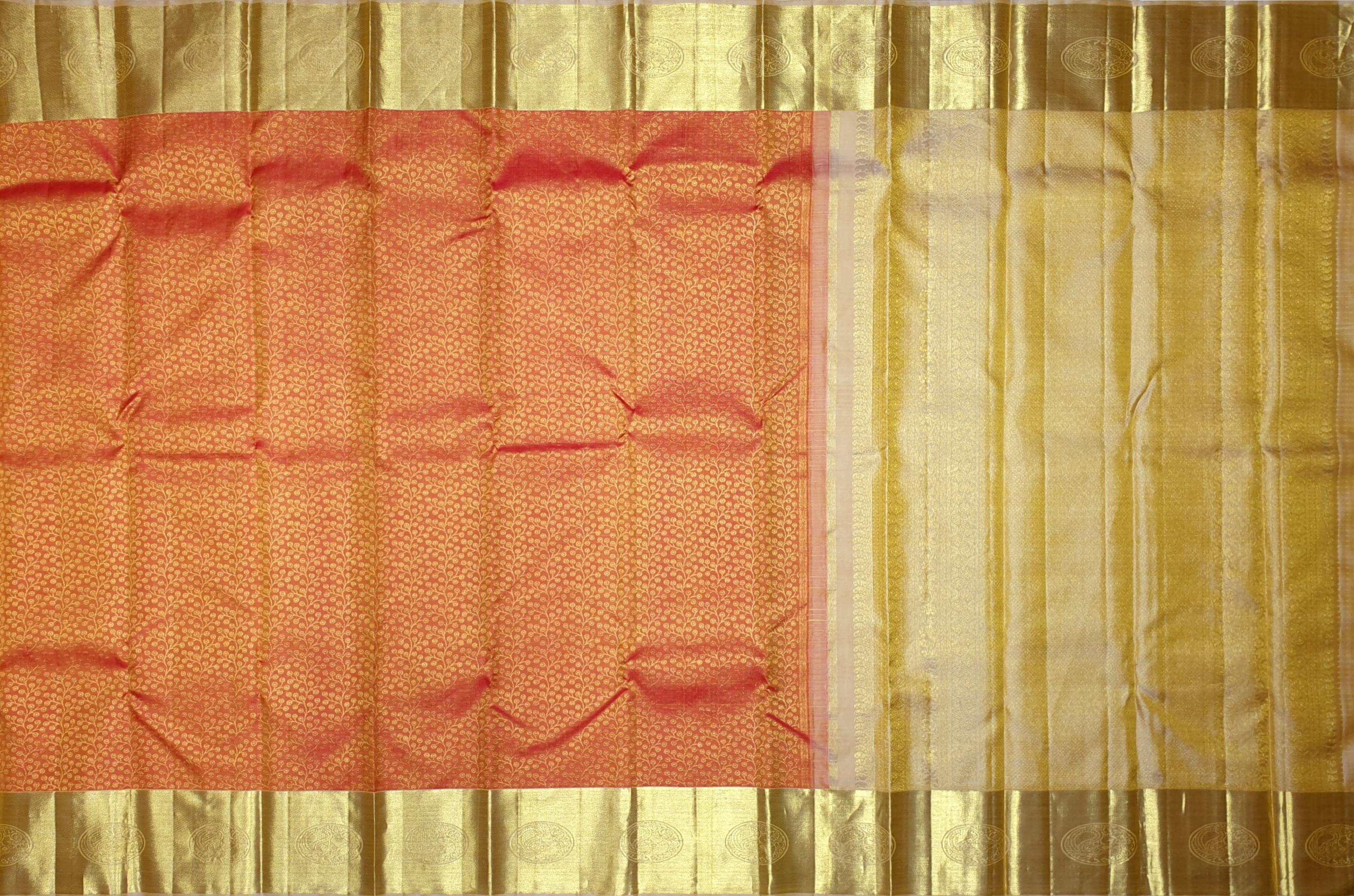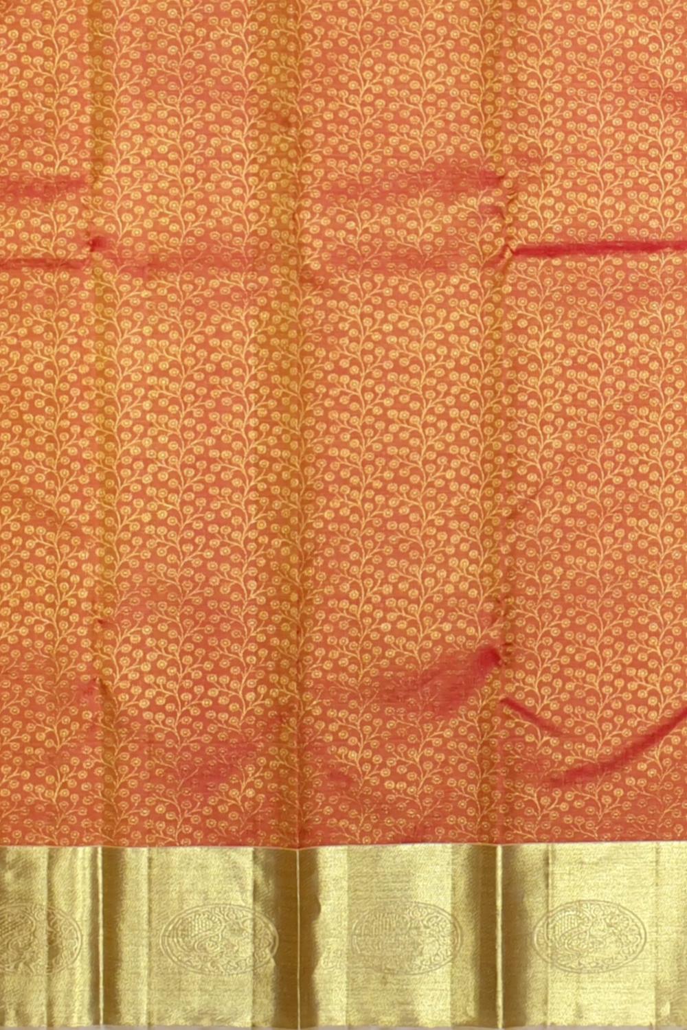 Radiating warmth and celebration, this golden orange Kanchipuram silk saree is woven with exquisite floral zari brocade that catches the light with every movement. The intricately detailed patterns bloom across the body, adding a sense of richness and opulence. Accented with a self-colored pallu and a golden blouse, this saree is a glowing embodiment of tradition and craftsmanship—perfect for making a graceful, striking entrance.
