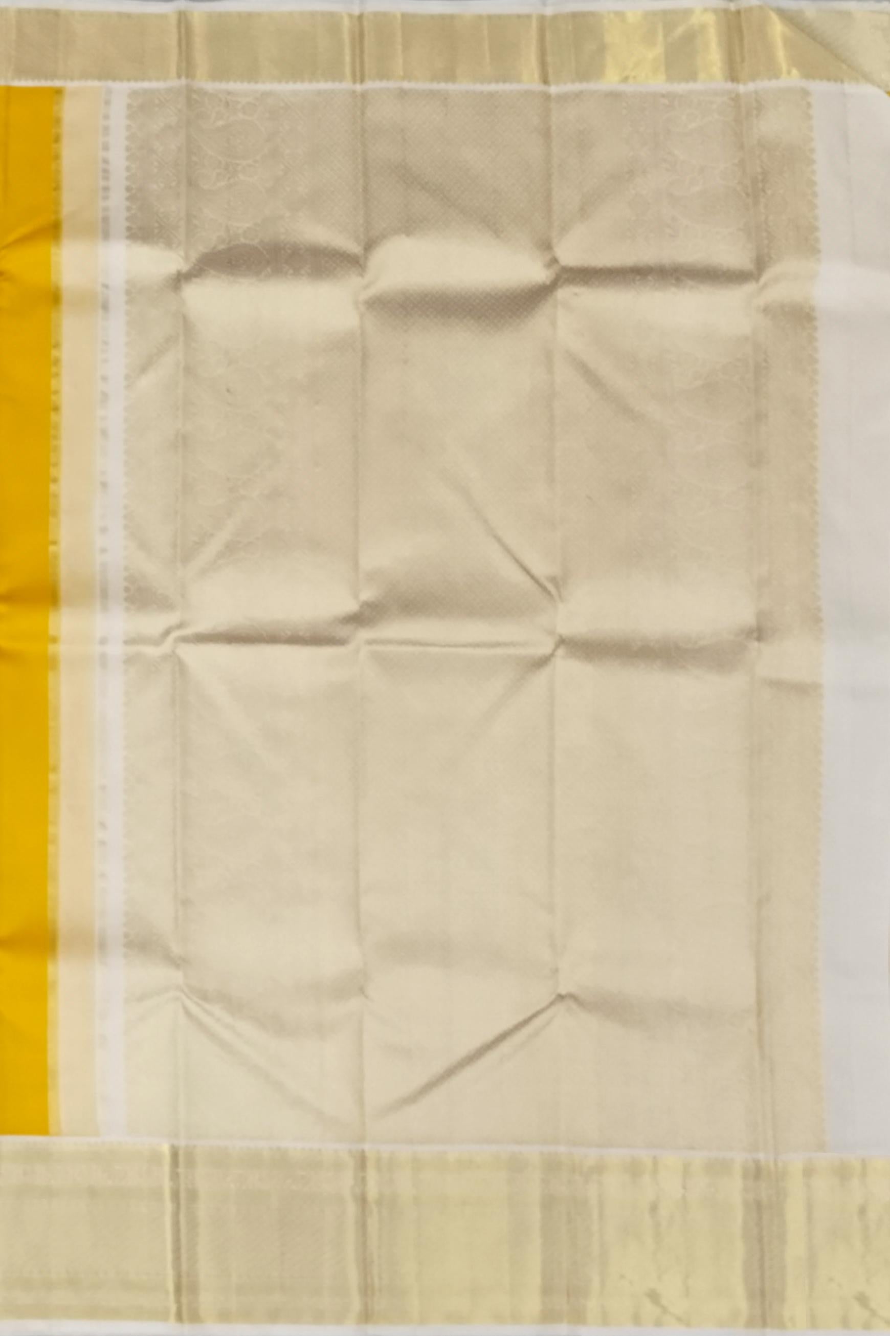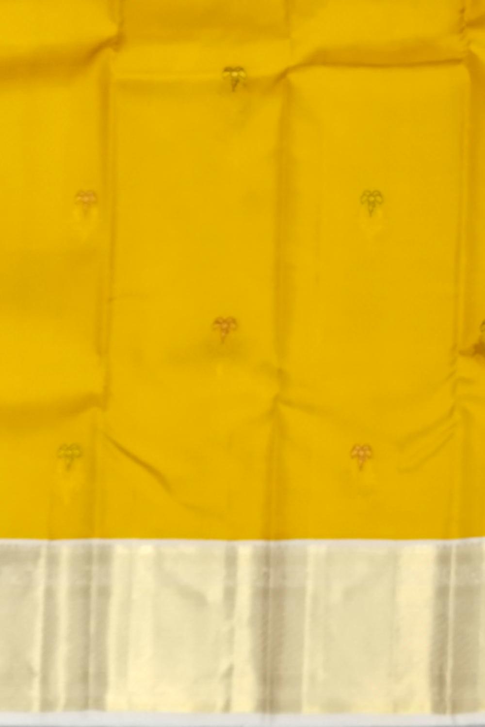Bask in the radiance of tradition with this exquisite Golden Yellow Kanchipuram Silk Saree, adorned with elegant Butta motifs. The half-white border and pallu create a gentle contrast that exudes purity and warmth — a combination that symbolizes prosperity, positivity, and spiritual balance. Each butta glimmers in woven zari, showcasing the finesse of Kanchi craftsmanship at its finest. Woven in the temple town of Kanchipuram, these sarees are celebrated for their luxurious texture and enduring beauty. Crafted from pure mulberry silk and interwoven with real zari, each saree tells a story of devotion and artistry. The motifs, inspired by temple carvings and South Indian iconography, embody blessings, prosperity, and cultural heritage. Perfect for festive occasions, traditional pujas, and auspicious ceremonies, this saree pairs beautifully with a half-white blouse and antique gold jewelry. Enhance the look with jasmine-adorned hair and a bold bindi to complete your divine ensemble. Note: The appearance of the product’s colors may vary due to lighting conditions or your device’s screen calibration. For further assistance or additional images/videos, feel free to contact us at +91 97897 60367 or email at wecare@thesudeshiweaving.com.