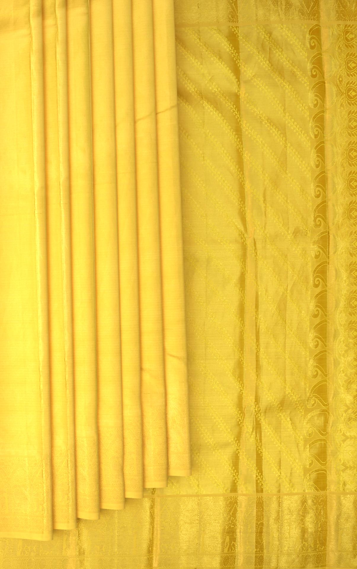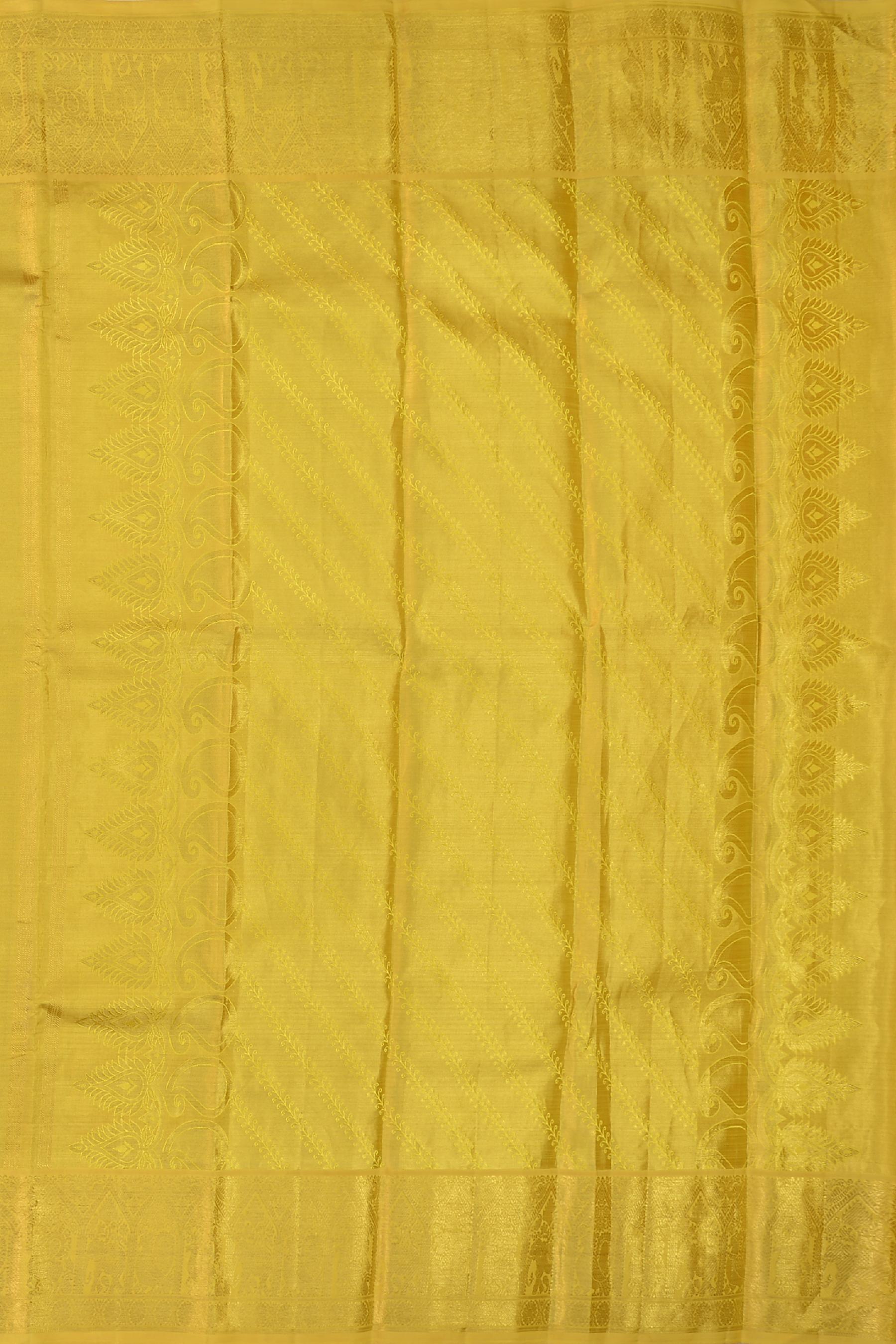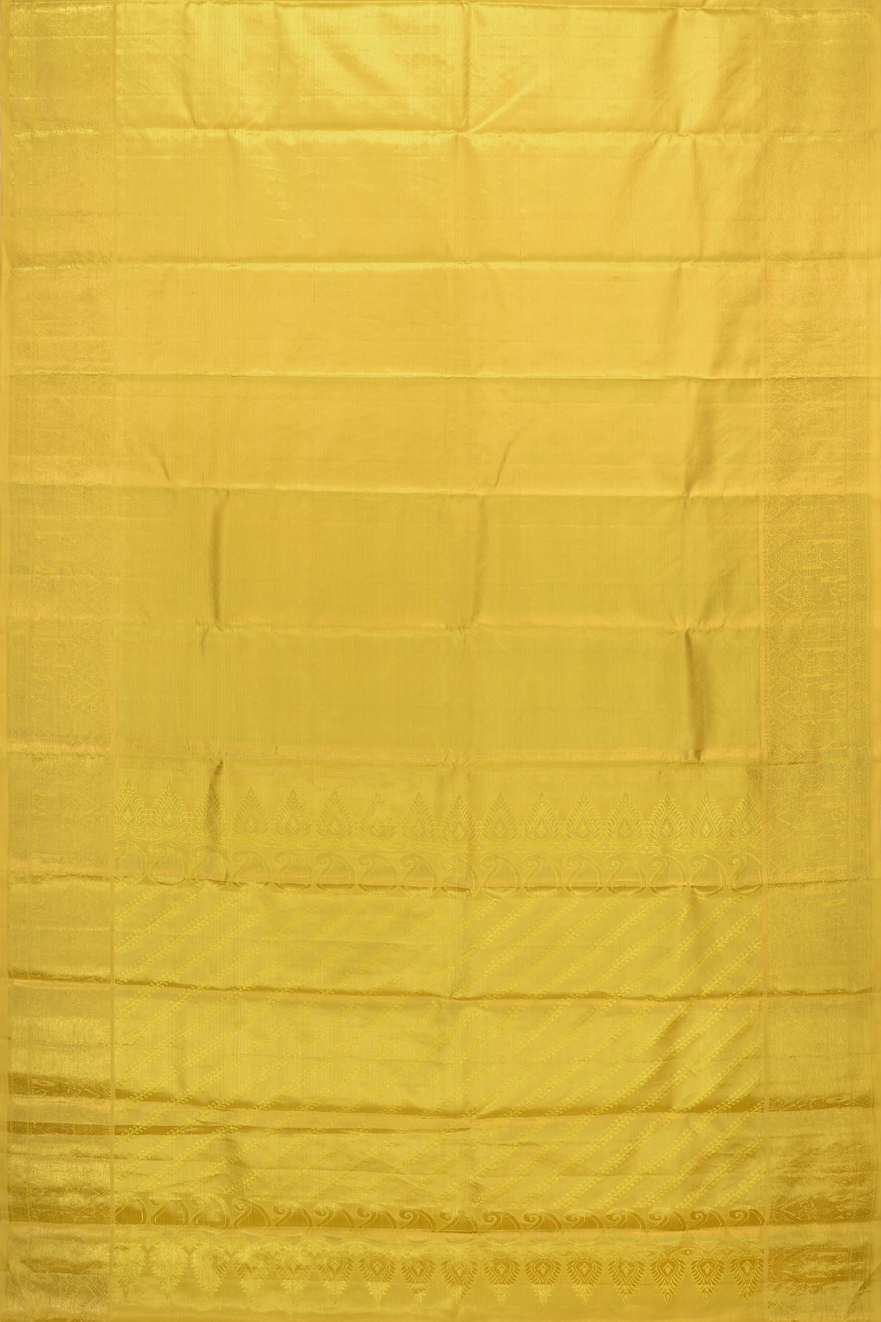 Embrace the luminous elegance of our Golden Yellow Kancheevaram silk saree, a symbol of prosperity and joy. This saree, woven with a tissue technique, shimmers with every move, encapsulating the essence of celebration. The Kamalam border, adorned with elephant and peacock motifs, adds a regal touch, celebrating the rich tapestry of Indian mythology and symbolism.