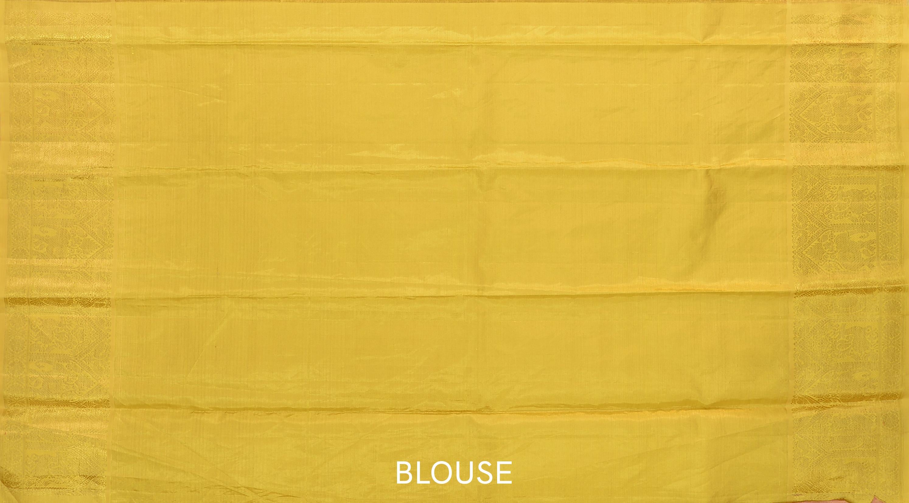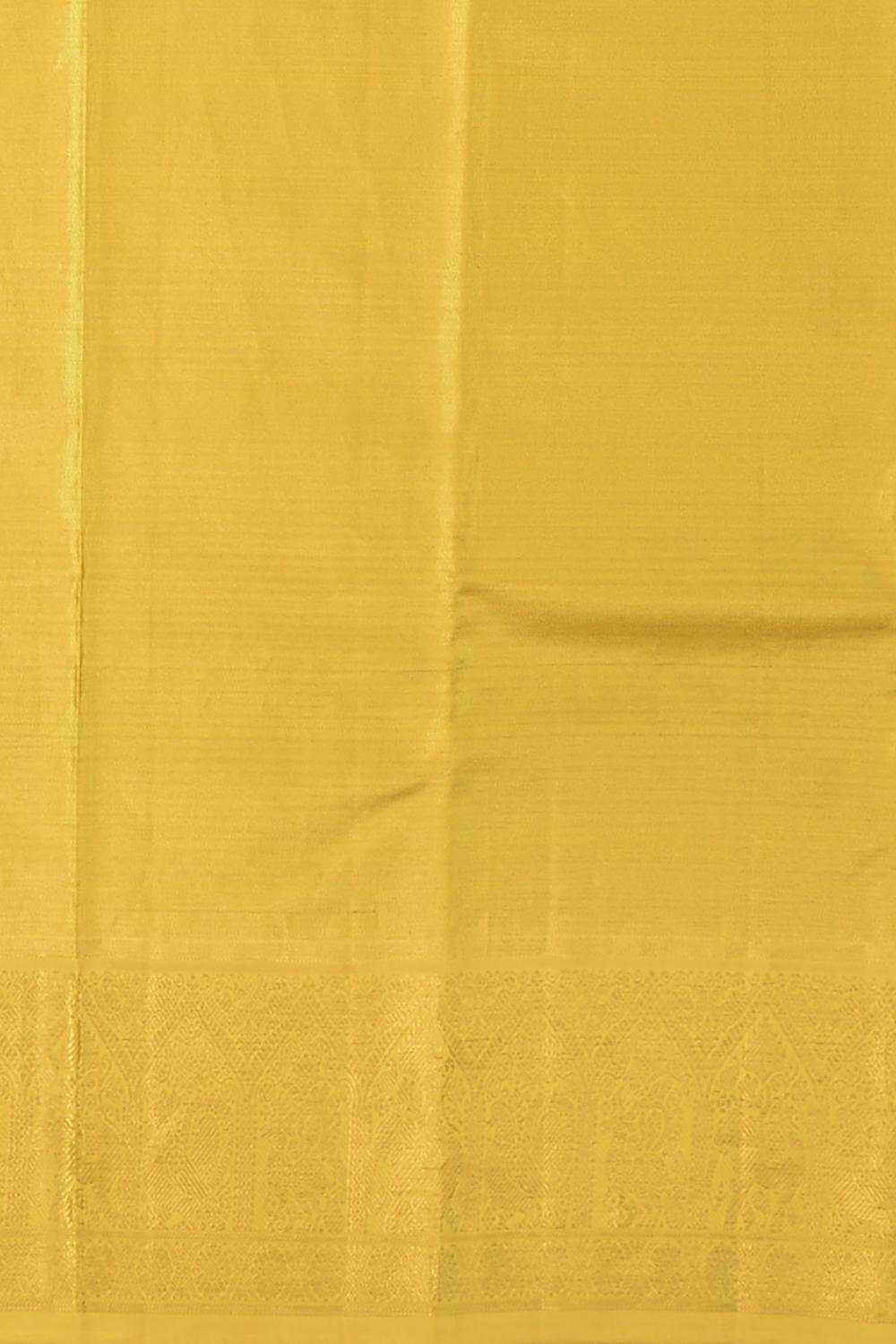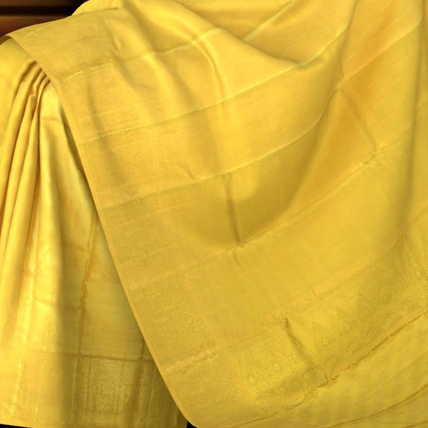 Embrace the luminous elegance of our Golden Yellow Kancheevaram silk saree, a symbol of prosperity and joy. This saree, woven with a tissue technique, shimmers with every move, encapsulating the essence of celebration. The Kamalam border, adorned with elephant and peacock motifs, adds a regal touch, celebrating the rich tapestry of Indian mythology and symbolism.