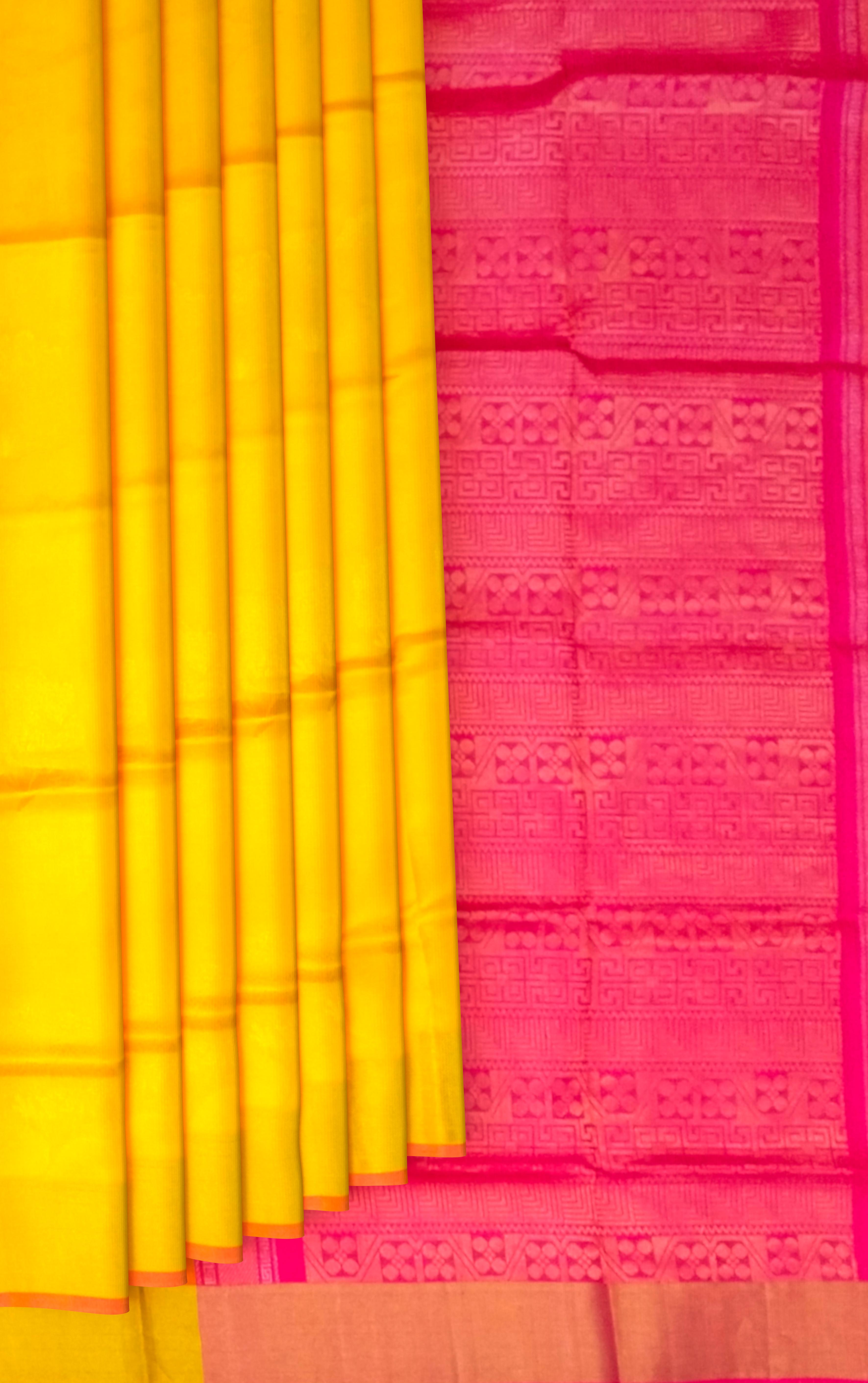 This dazzling saree, with its charming pink border, pallu, and blouse, is an ideal choice for festive celebrations, traditional ceremonies, and joyful gatherings. Its bright and cheerful color makes it perfect for events like Haldi ceremonies, cultural festivals, or even a delightful morning wedding. Pair it with contrasting pink or gold jewelry to highlight its vibrant tones. A classic South Indian hairstyle like a gajra-adorned bun would beautifully complement its traditional appeal, ensuring you radiate warmth and charm.