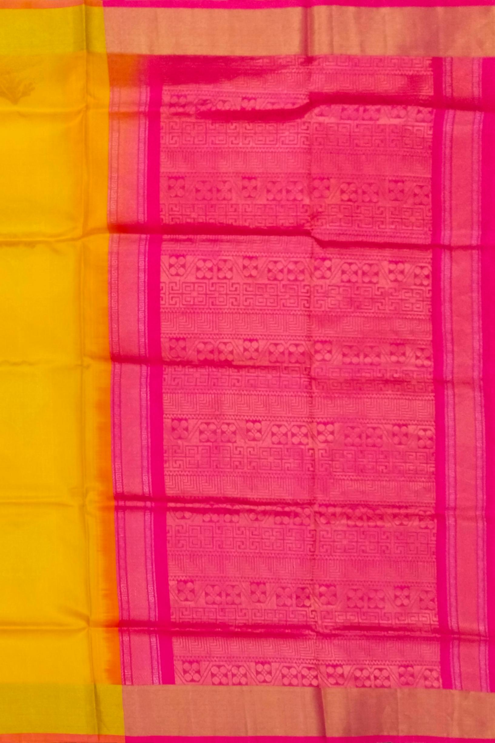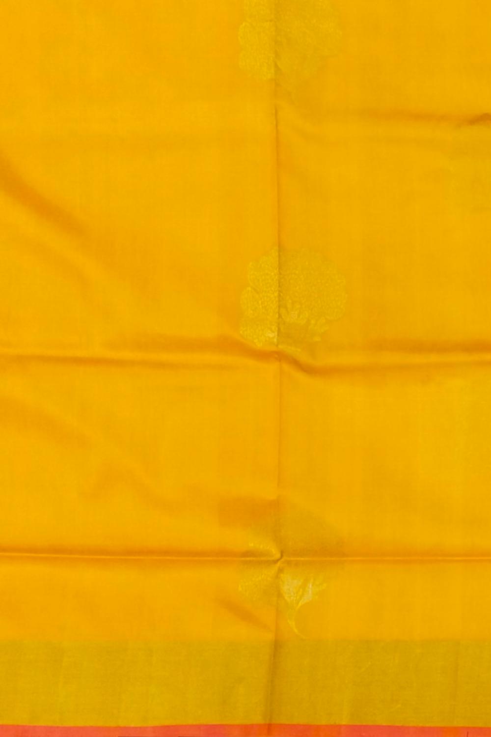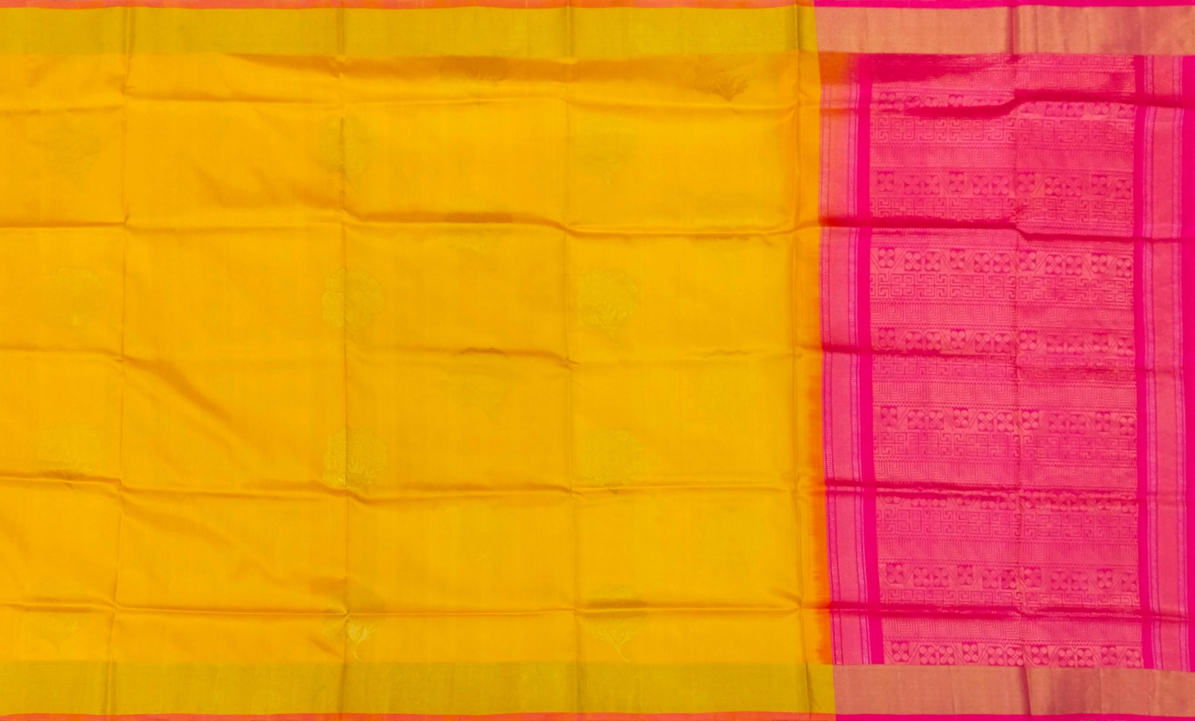 Illuminate any occasion with the vibrant charm of this Golden Yellow Kanchipuram Silk Saree, a true embodiment of radiant beauty and traditional craftsmanship. The luminous yellow body is intricately woven with self-colored bhuttas, creating a rich texture and subtle design that speaks volumes of its artistry. The monochromatic elegance of the self-bhutta allows the saree's vibrant hue to take center stage, making it a joyful and eye-catching selection.