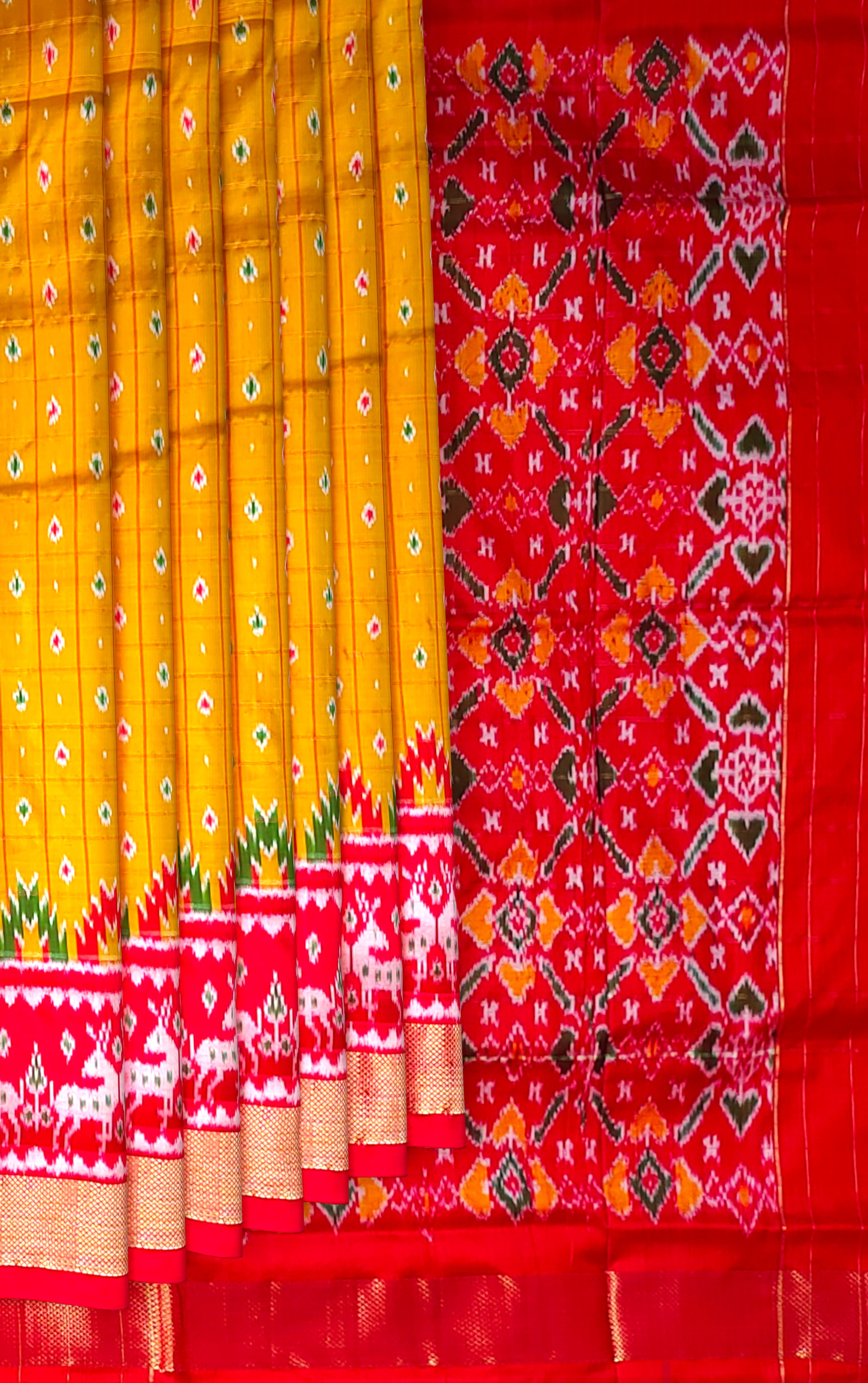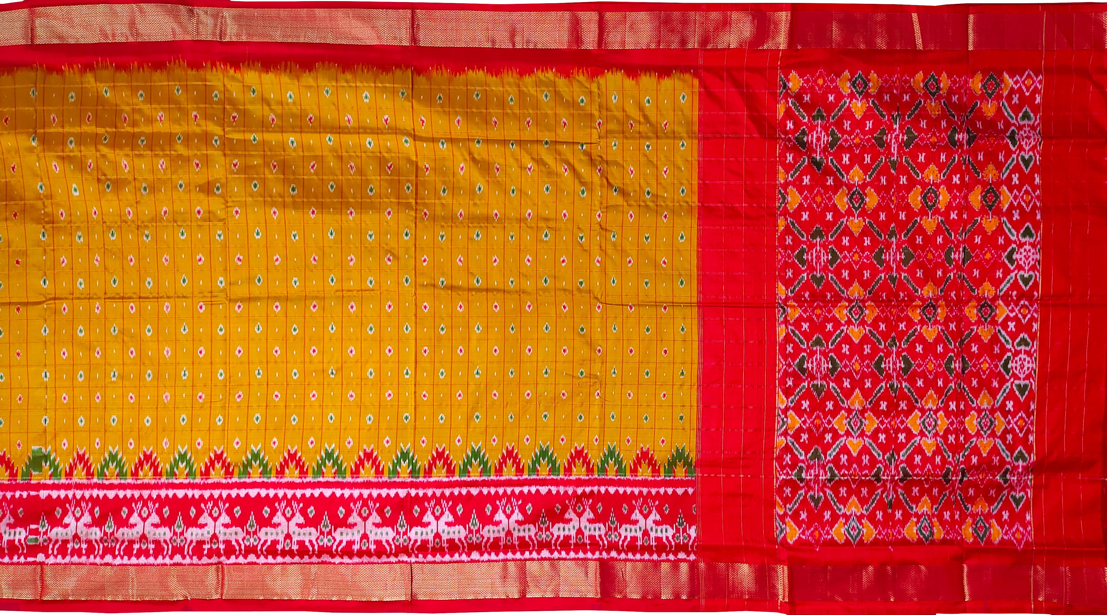 This beautiful Golden Yellow Red Pochampally Single Ikat Handloom Saree is a vibrant and stunning piece that showcases the beauty of traditional Indian craftsmanship. The saree features intricate gold zari work on a golden yellow and red background, creating a striking contrast that exudes elegance and sophistication.