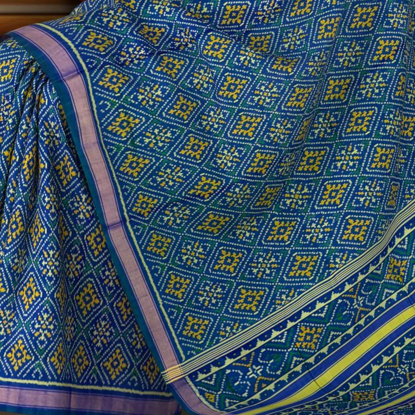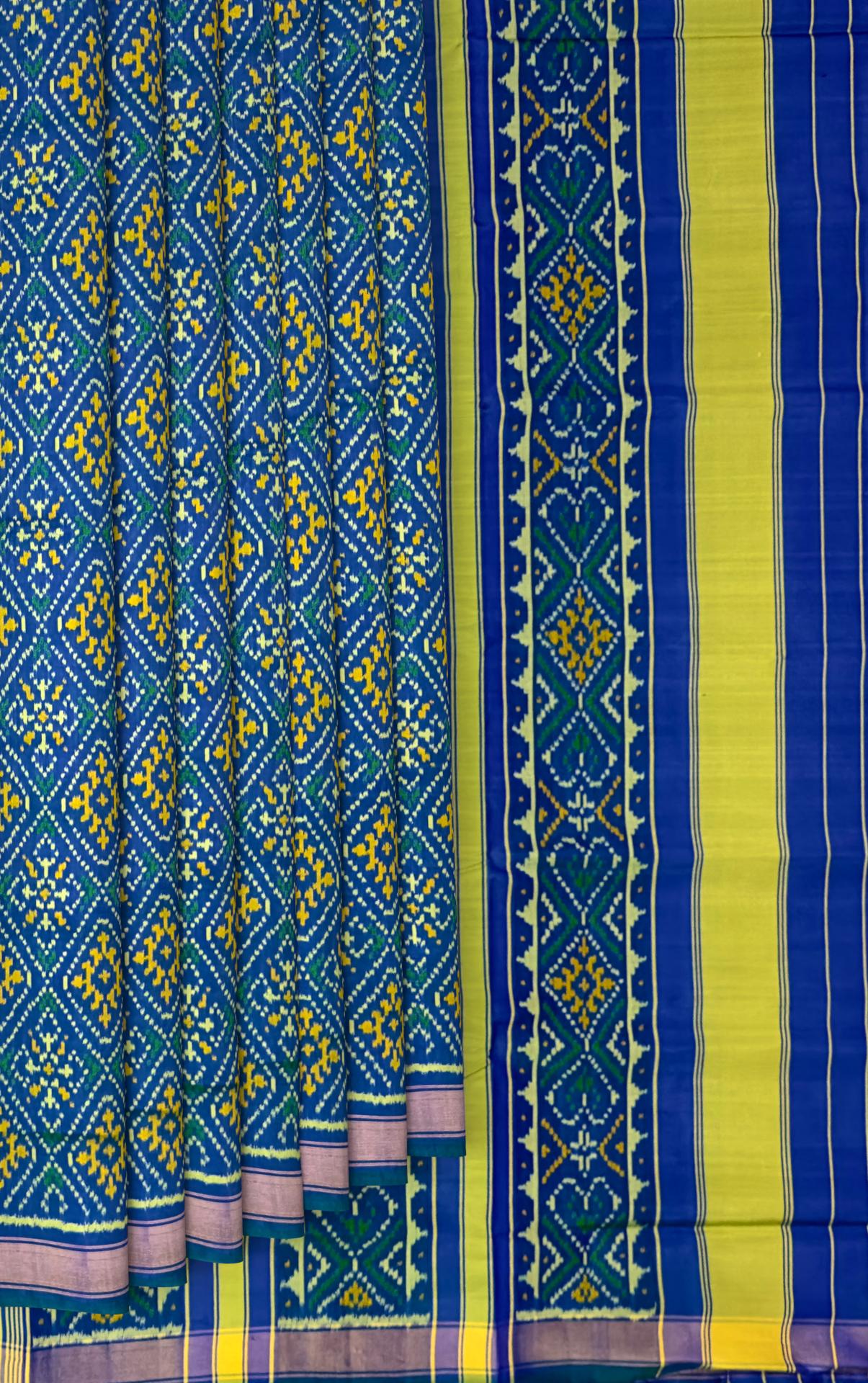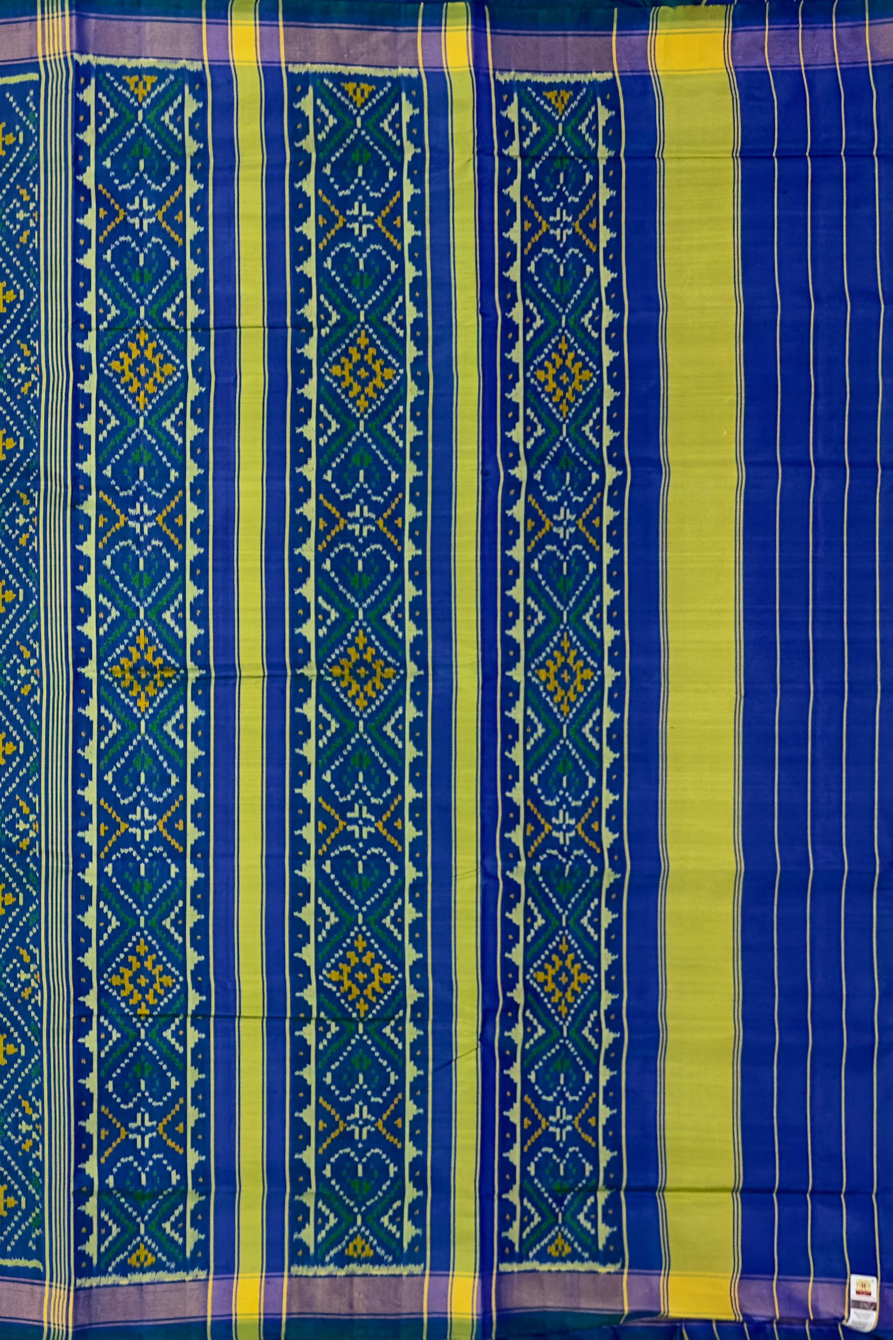Revel in the lush hues of the Green Blue Chanda Bhat Regular Rajkot Patola Saree. Crafted with precision using the single ikat technique, this saree is perfect for festive occasions, blending tradition with a splash of vibrant color.