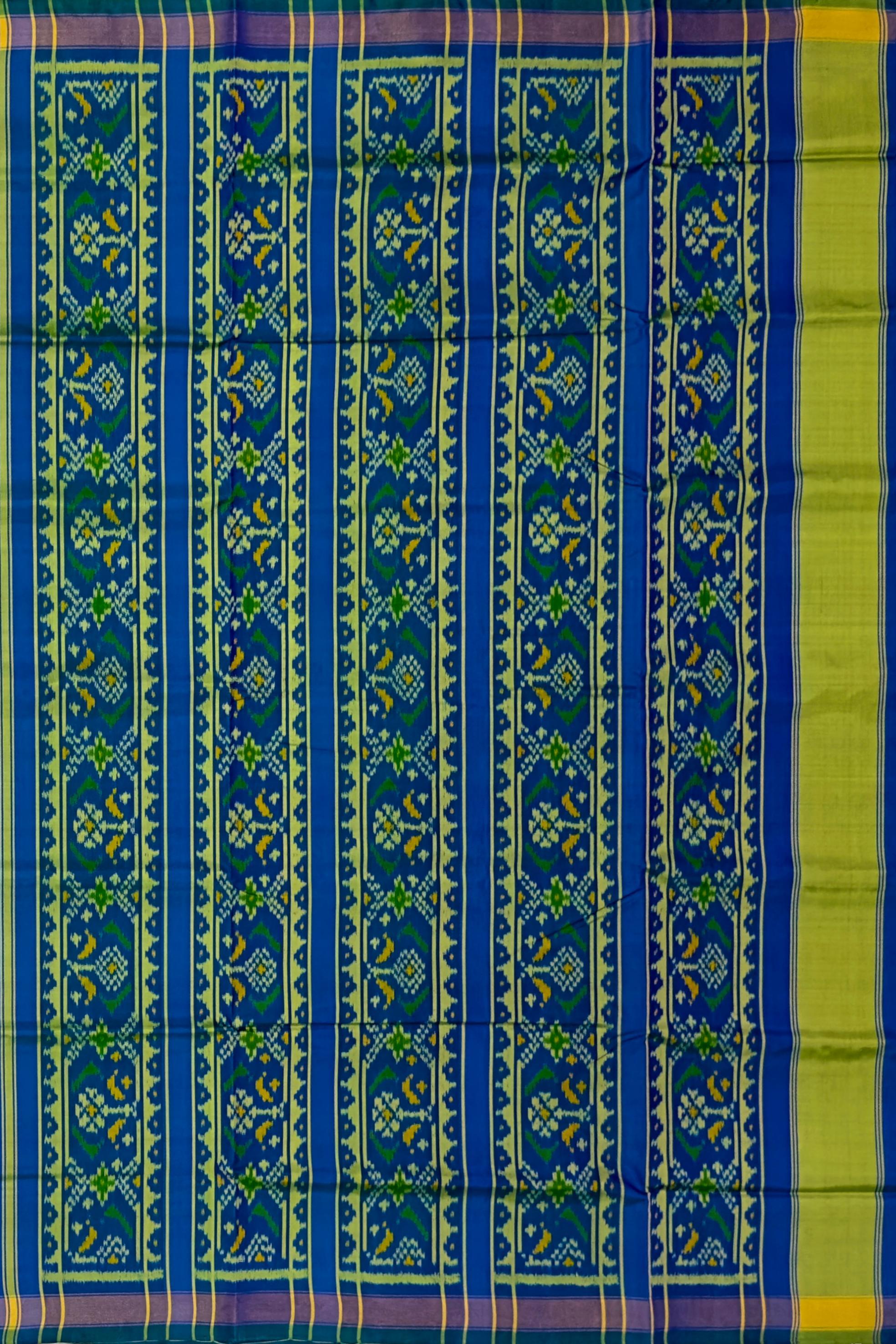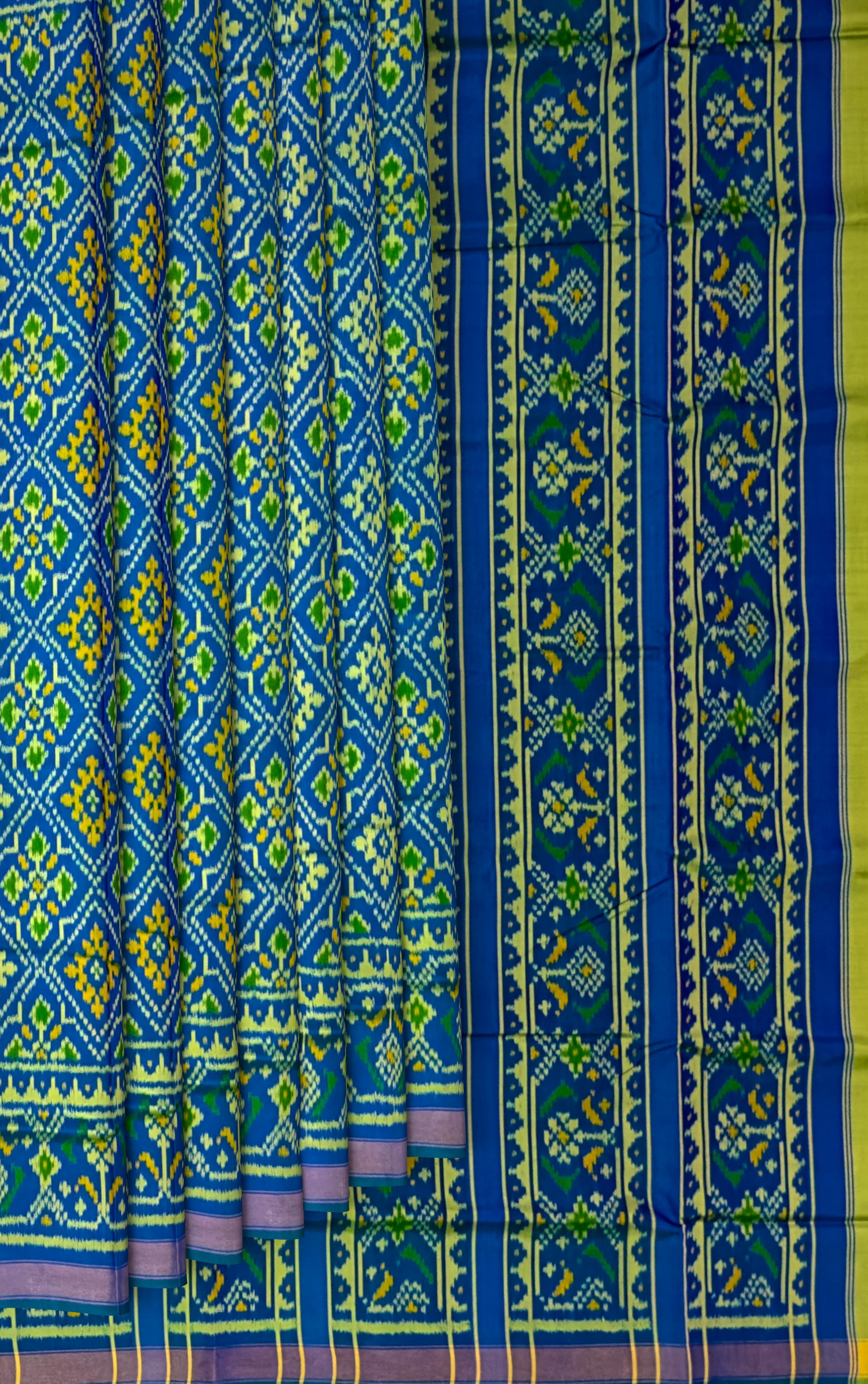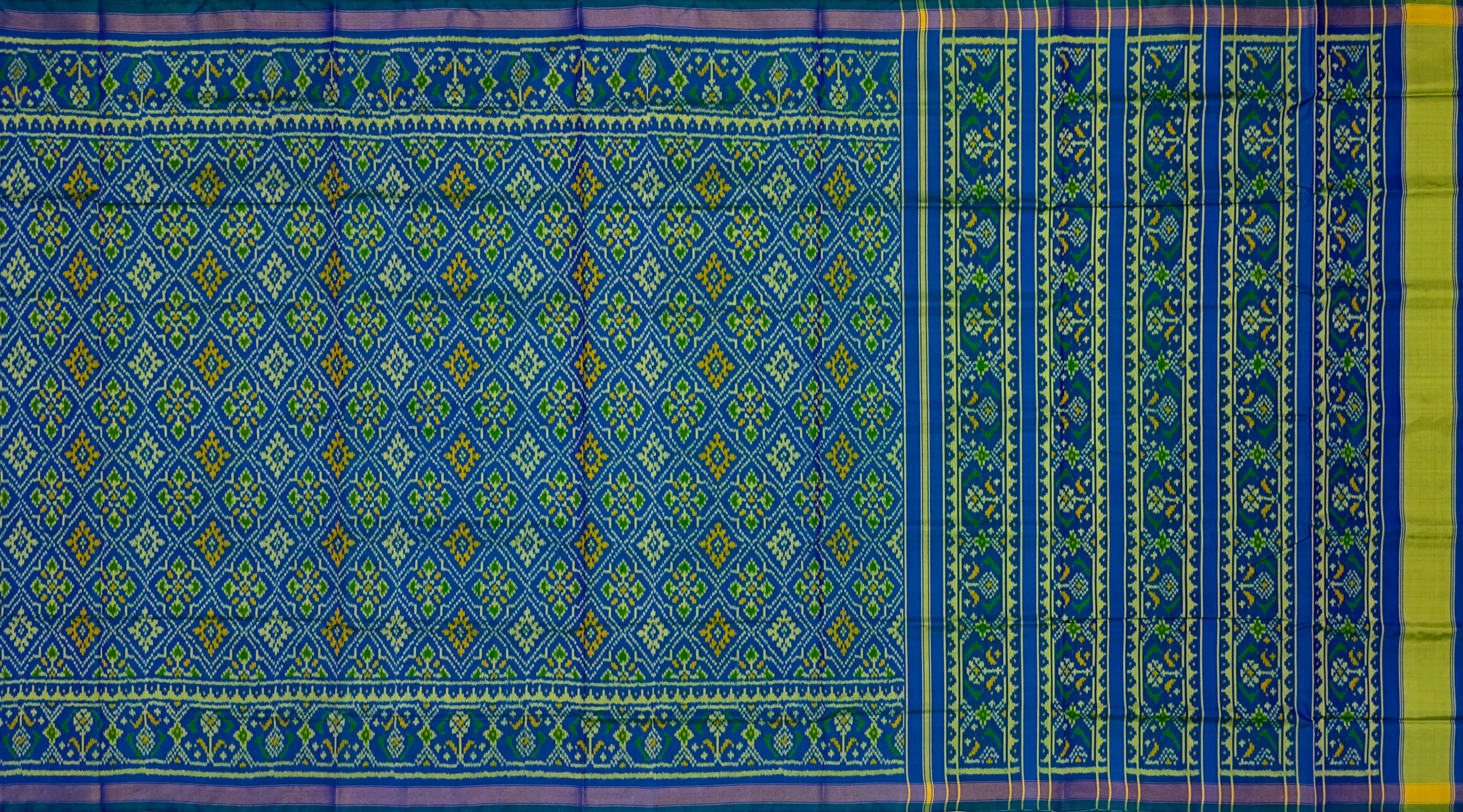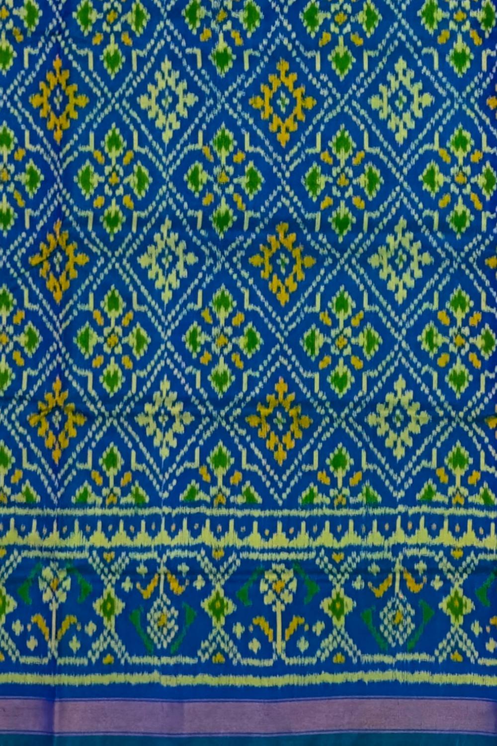 The Green Blue Chandabhat Border Pallu Ghughro (LP) Single Ikat Rajkot Patola Saree is a beautiful blend of traditional design and modern aesthetics. The dual-tone green and blue base, paired with the intricate Chandabhat motifs on the border and pallu, creates a striking contrast that is both elegant and eye-catching.