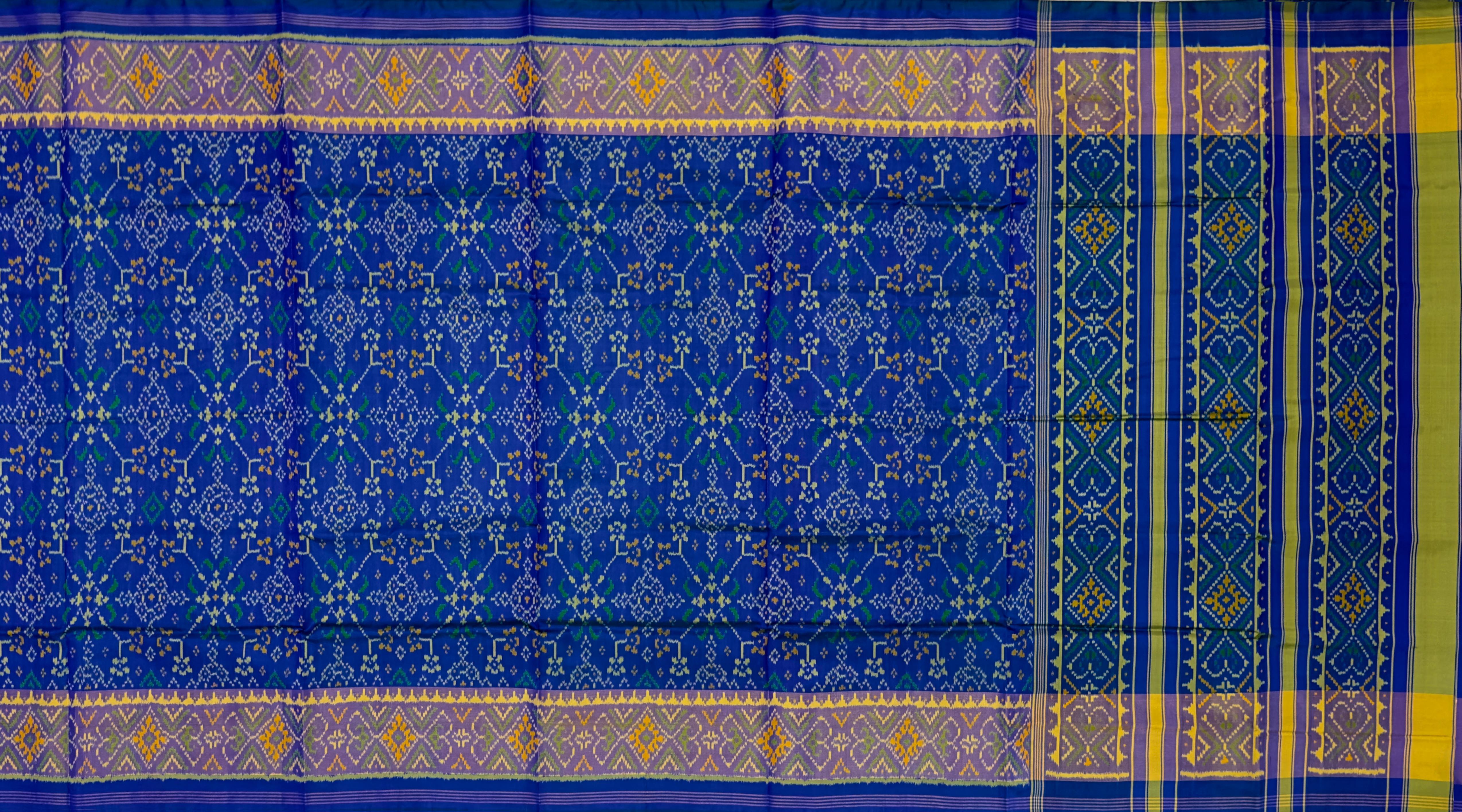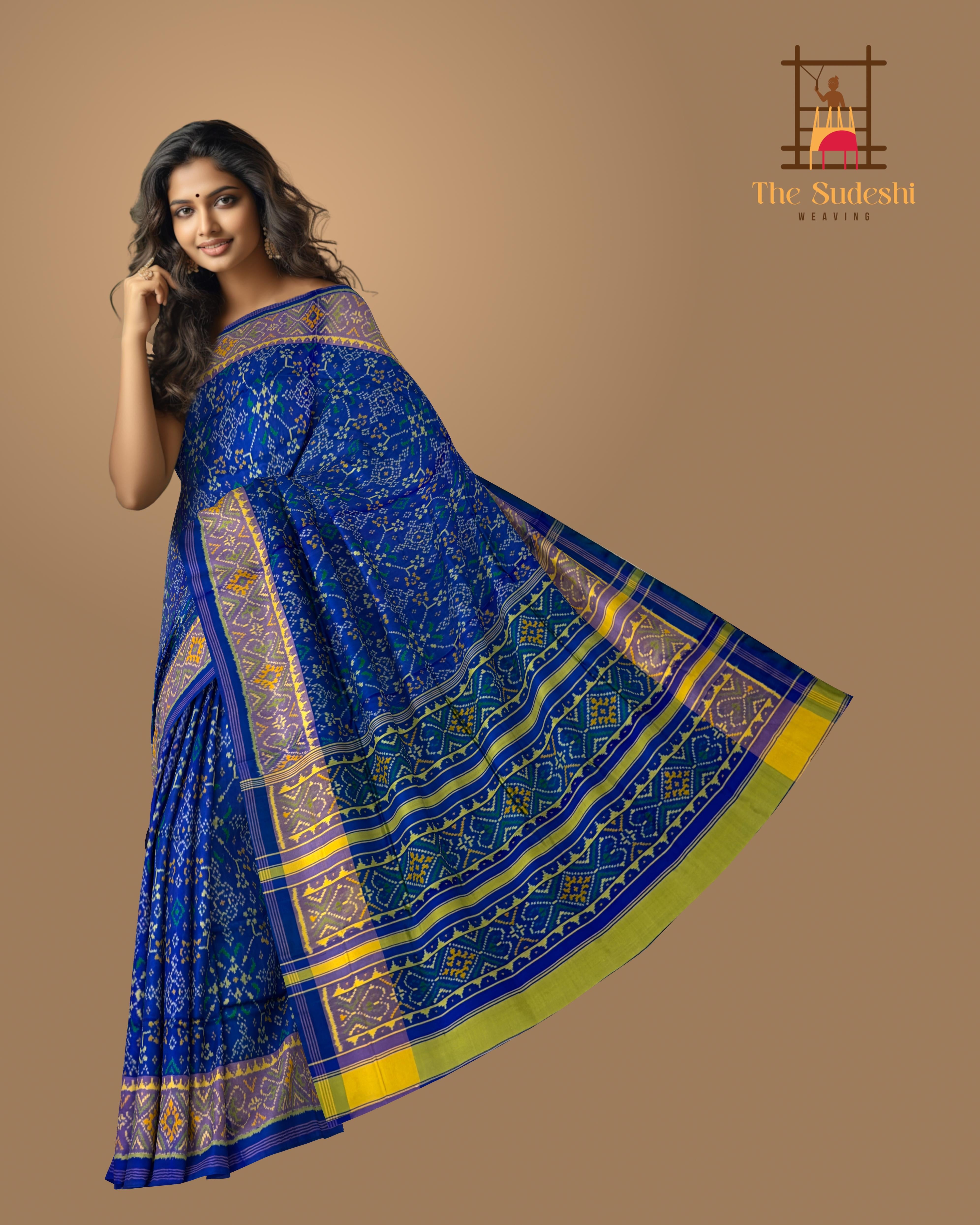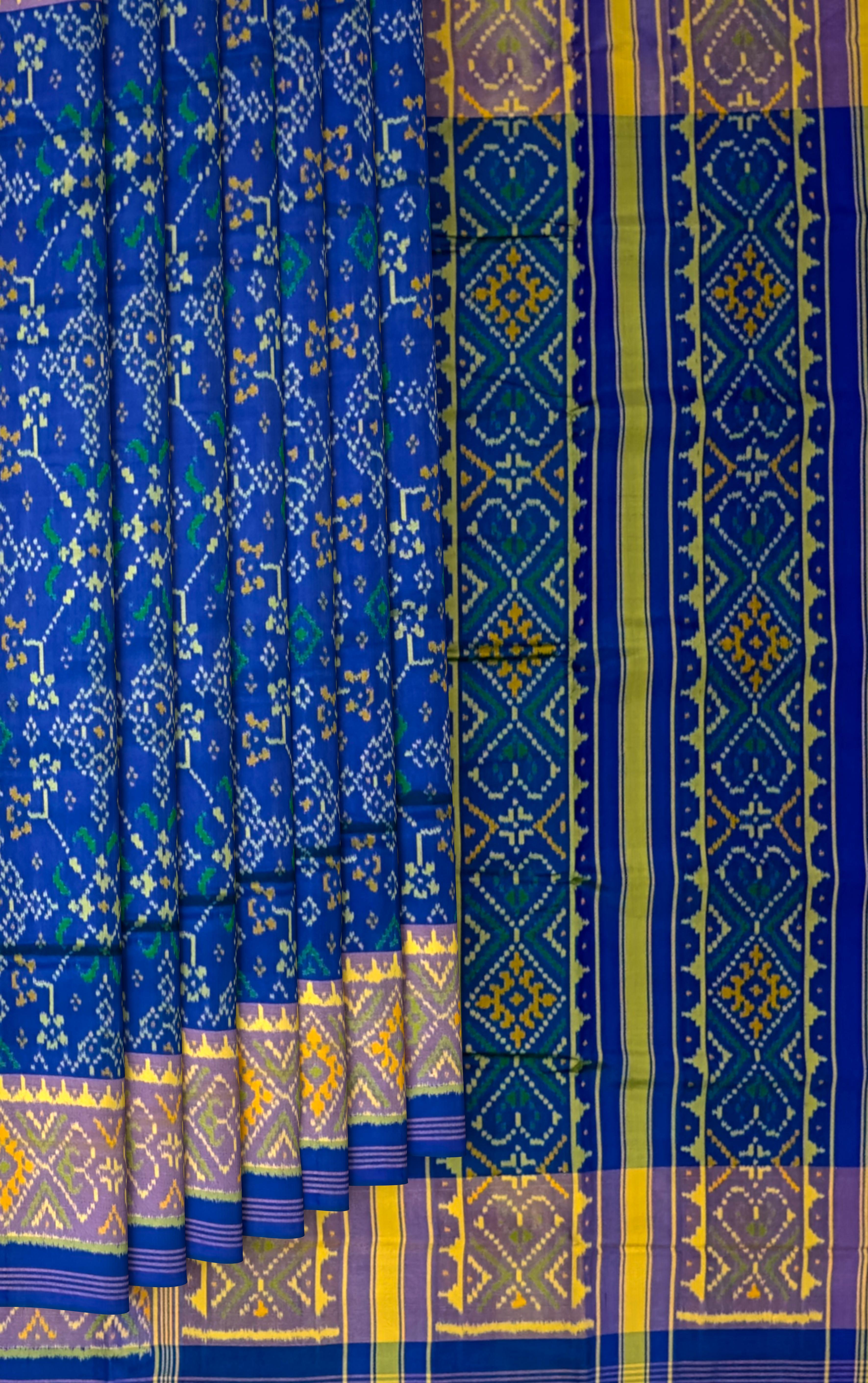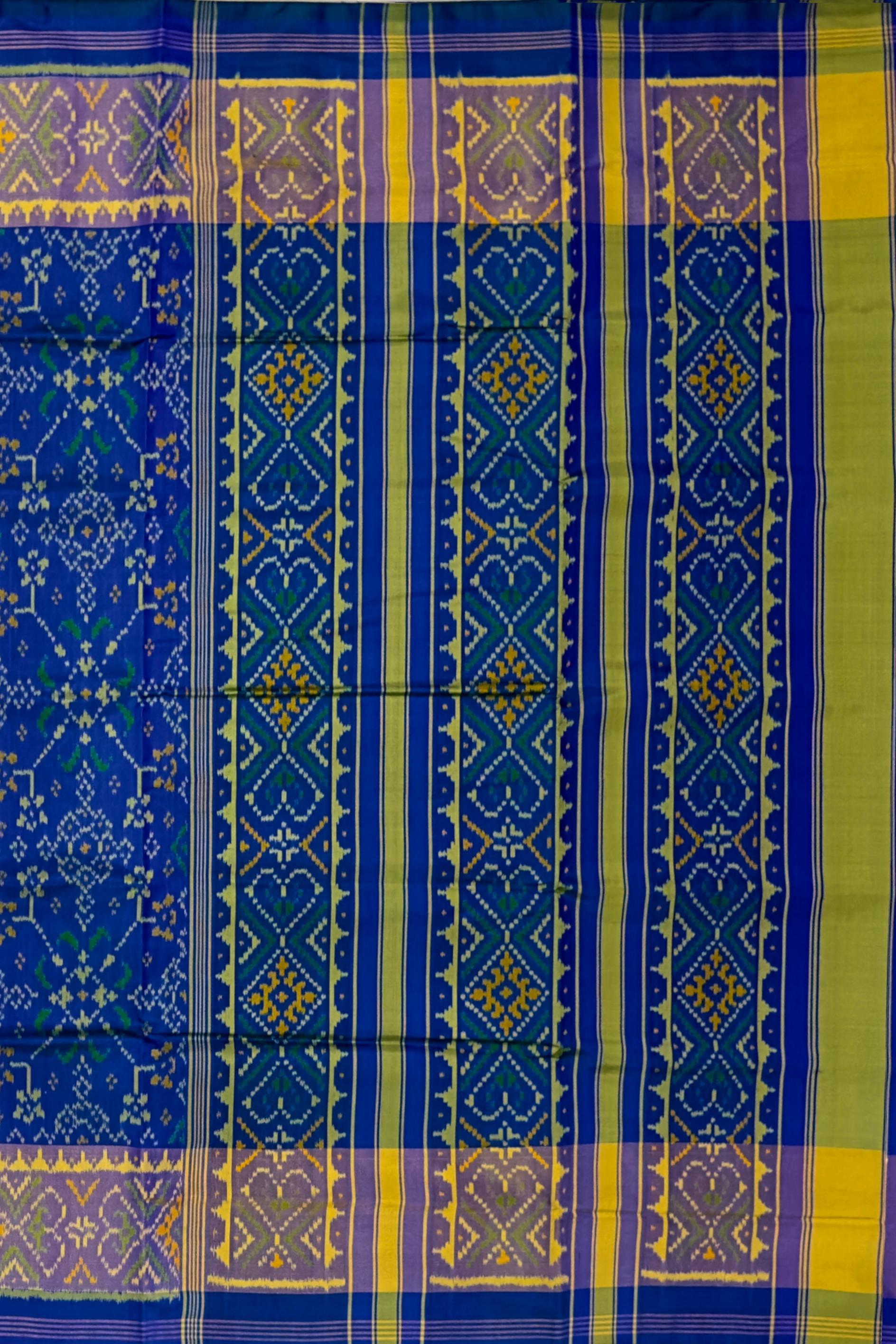 Step into the world of heritage with the Green Blue Navratna Border Pallu Chelari Single Ikat Rajkot Patola Saree. This saree, featuring a dual-tone green and blue base, is a testament to the rich cultural tapestry of Gujarat. The intricate Navratna motifs on the border and pallu symbolize prosperity and good fortune, making this saree a cherished addition to any wardrobe.