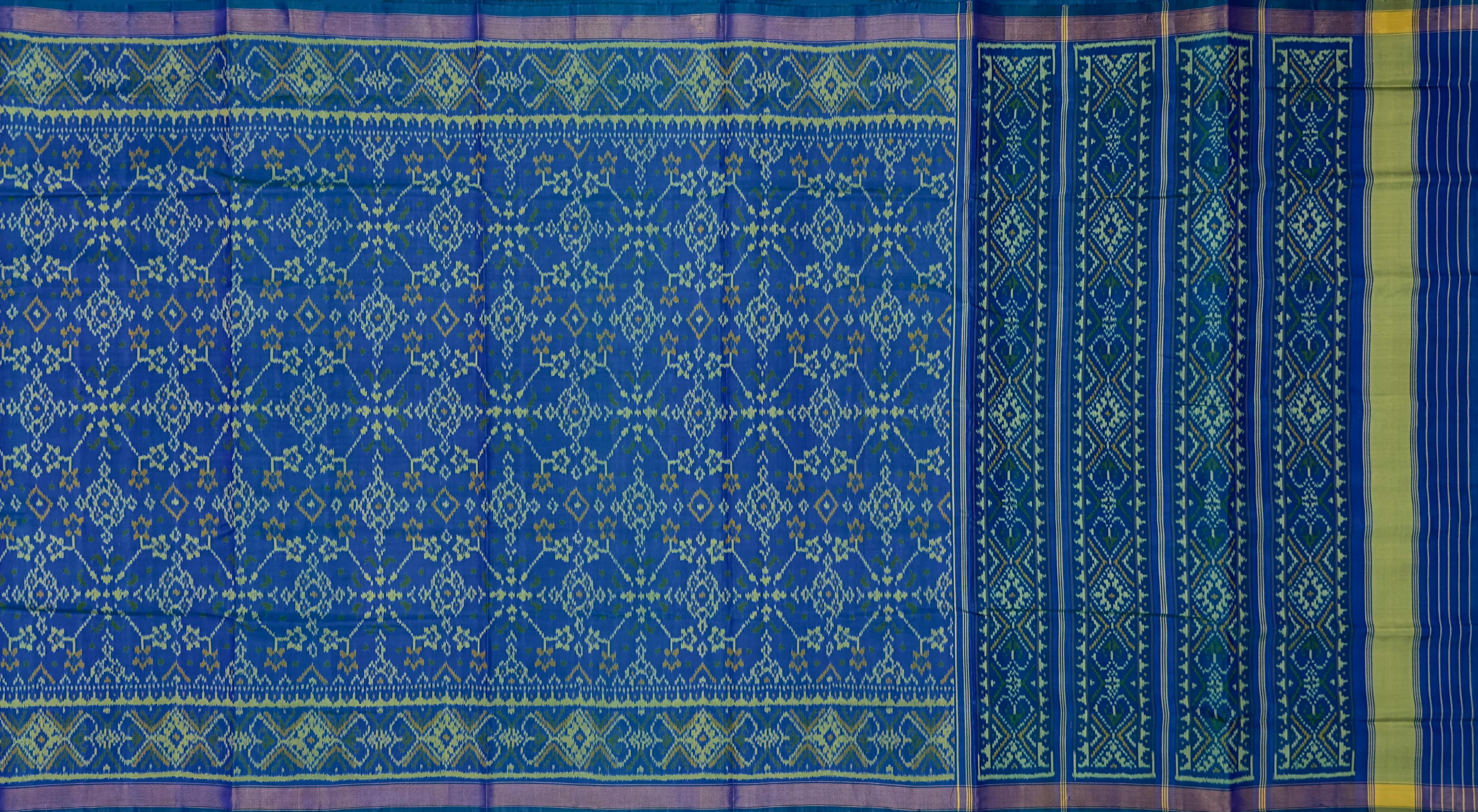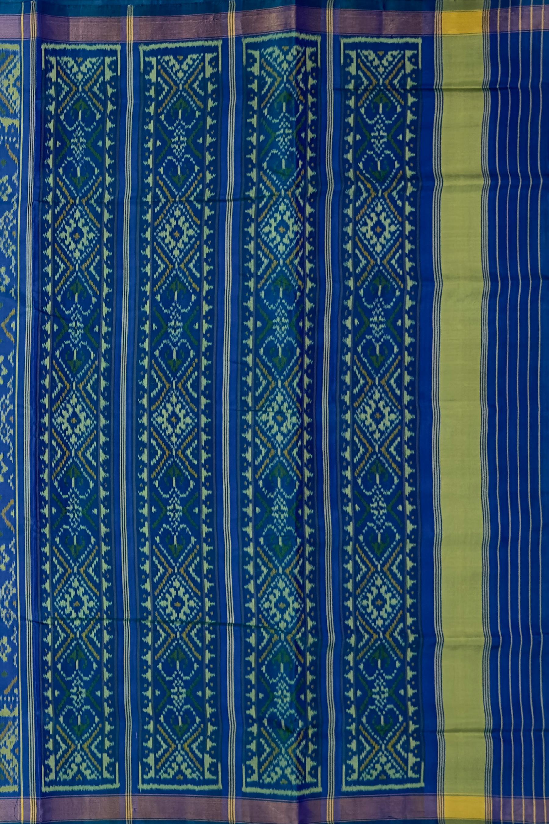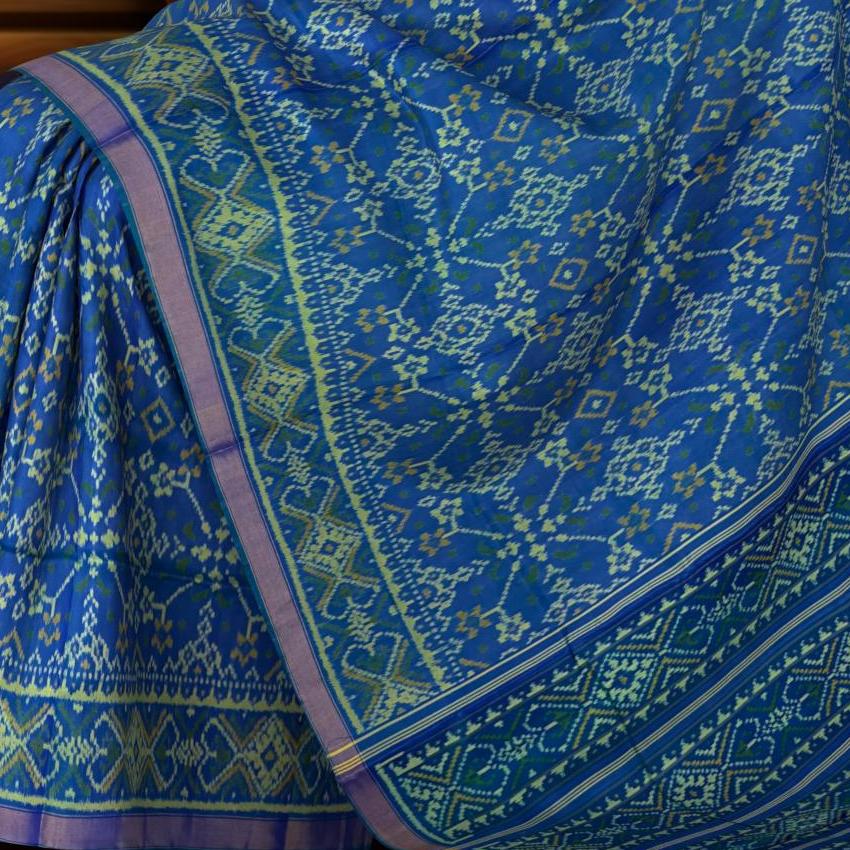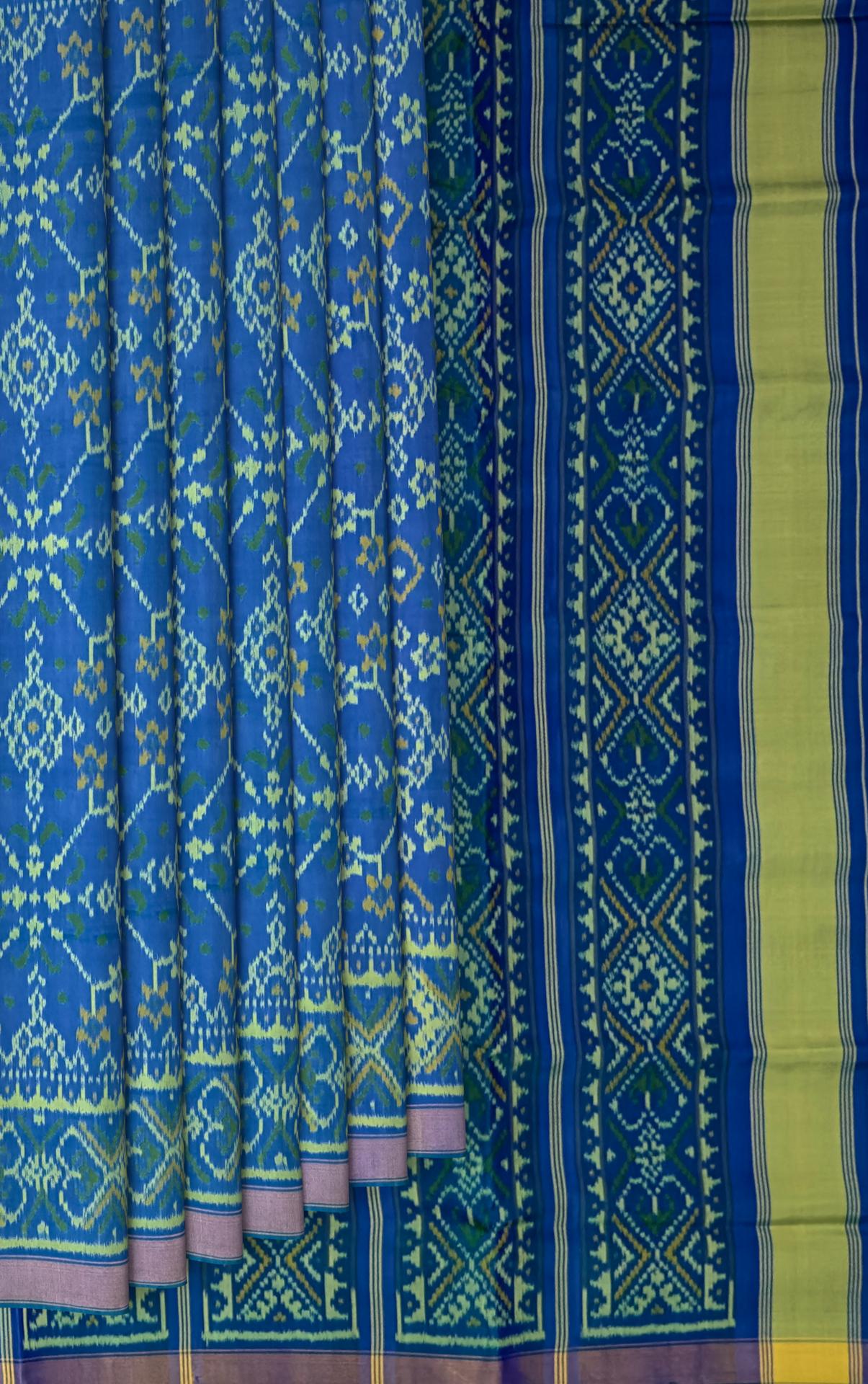 Unveil the timeless beauty of the Green Blue Navratna Patola Saree, a masterpiece of traditional Indian artistry. Crafted using the single ikat technique, this saree features the intricate Navratna design, showcasing luxurious patterns. The unique combination of green and blue enhances the beauty of the detailed motifs that flow seamlessly from the body to the pallu. The semi-lustrous finish adds a touch of modern sophistication, making it a versatile choice for various occasions. Perfect for grand weddings, cultural celebrations, and social gatherings, this saree is designed for the modern NRI woman who values her Indian heritage. It symbolizes centuries of artisan tradition, making each piece a unique work of art. Celebrate your heritage with the Green Blue Navratna Patola Saree, a timeless piece that exudes tradition and elegance.