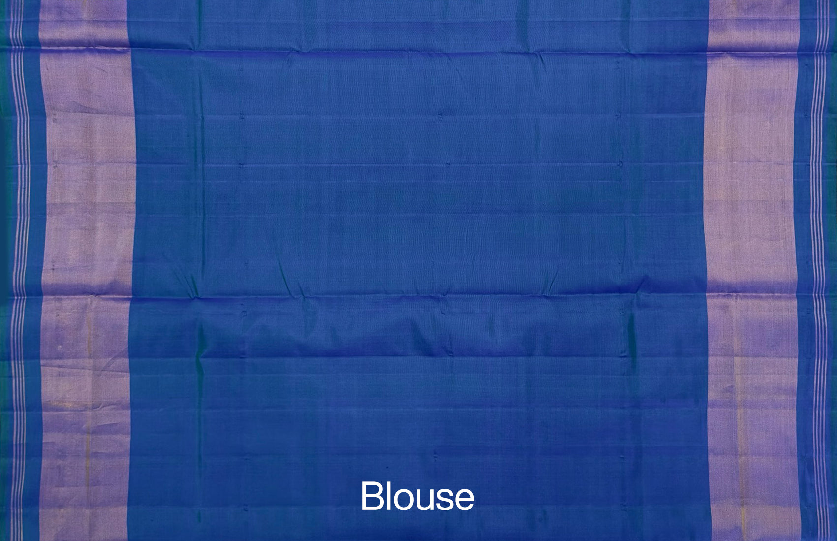 The Navratna design, symbolizing the nine precious gems, is a traditional motif that represents prosperity and protection. The green and blue colors of the saree evoke a sense of tranquility and balance, making it perfect for both festive celebrations and formal events. The intricate craftsmanship and luxurious feel of the saree ensure you make a lasting impression wherever you go.