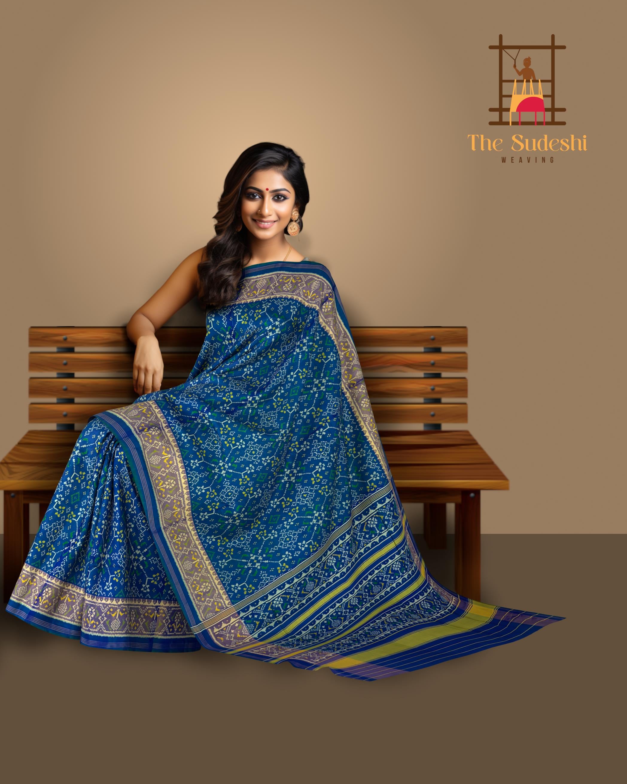 Step into the world of vibrant elegance with our Green Blue Single Ikat Rajkot Patola Saree, featuring the captivating Navratna design. This semi-lustre saree boasts a stunning dual-tone effect, with green and blue hues blending seamlessly to create a mesmerizing look. The tissue border and ghughro (bells) on the pallu add a touch of opulence, making this saree a standout piece for any special occasion.