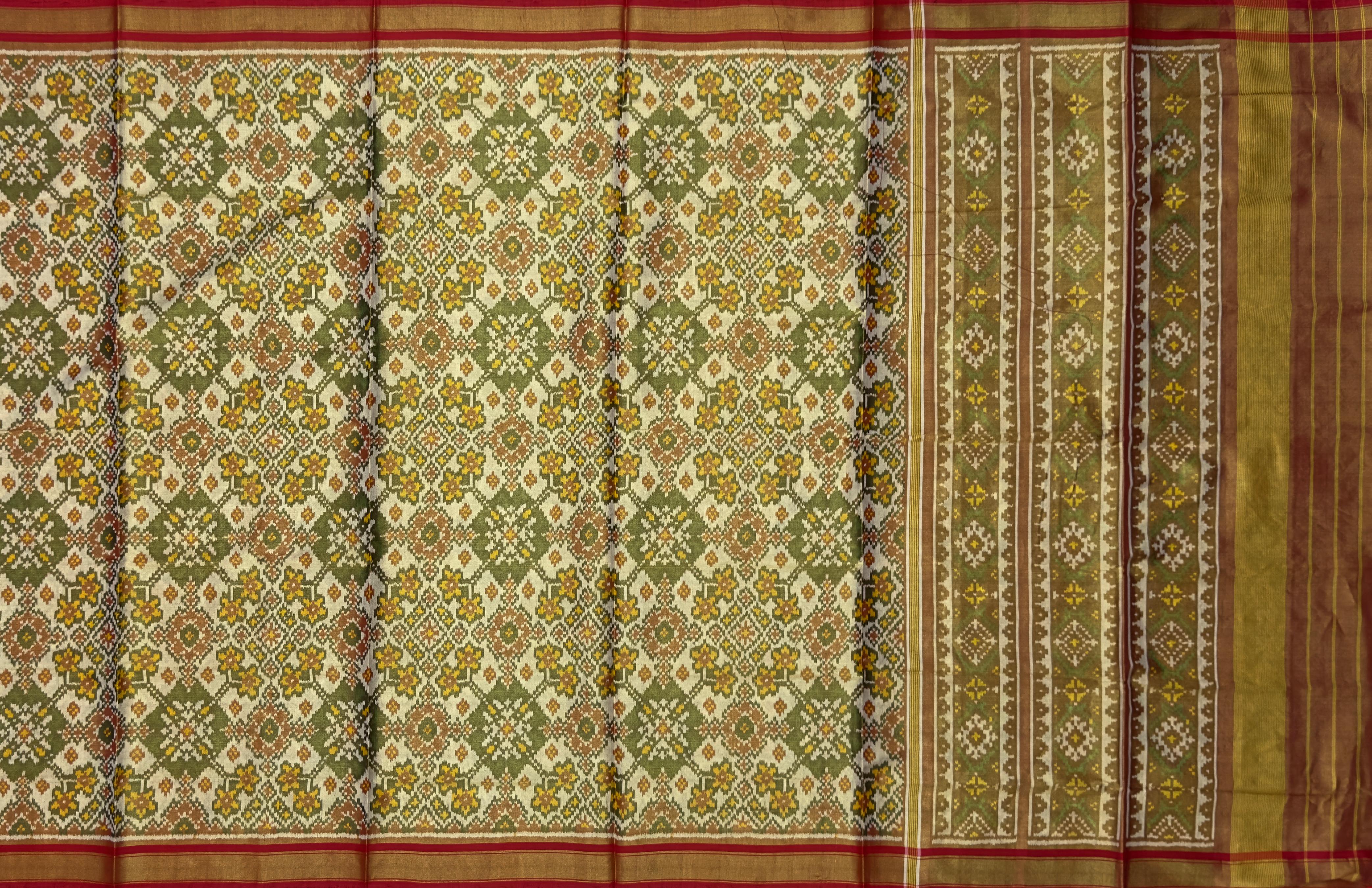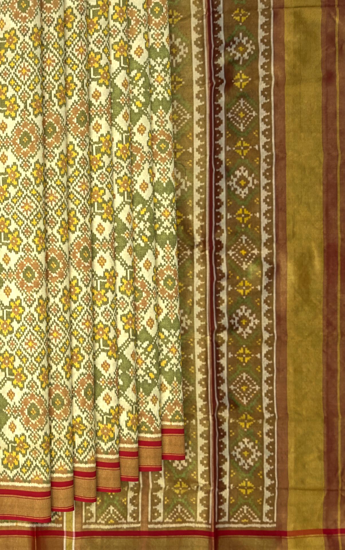 This Tissue Navratna Saree in green, brown, and yellow is a tribute to traditional artistry, perfect for high-end social events. Its luxurious tissue texture and vibrant Navratna designs offer a modern twist on classic style.
