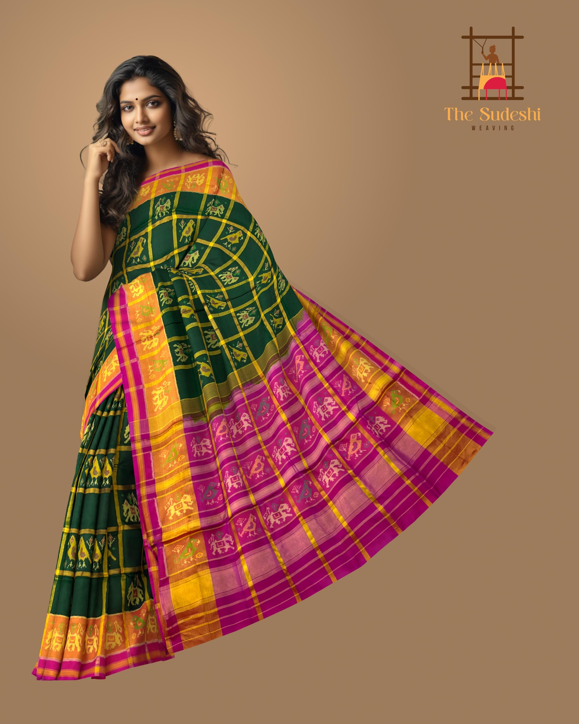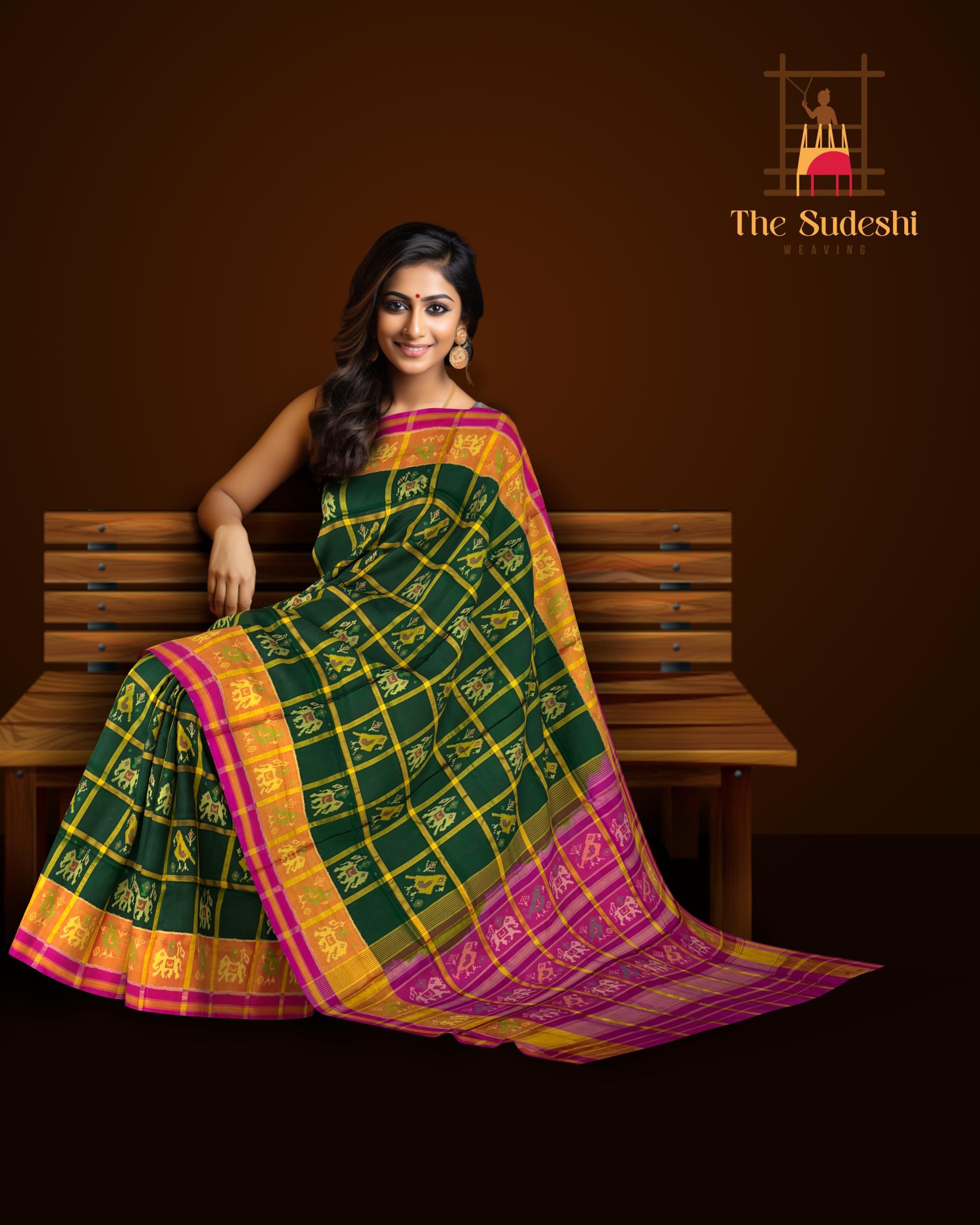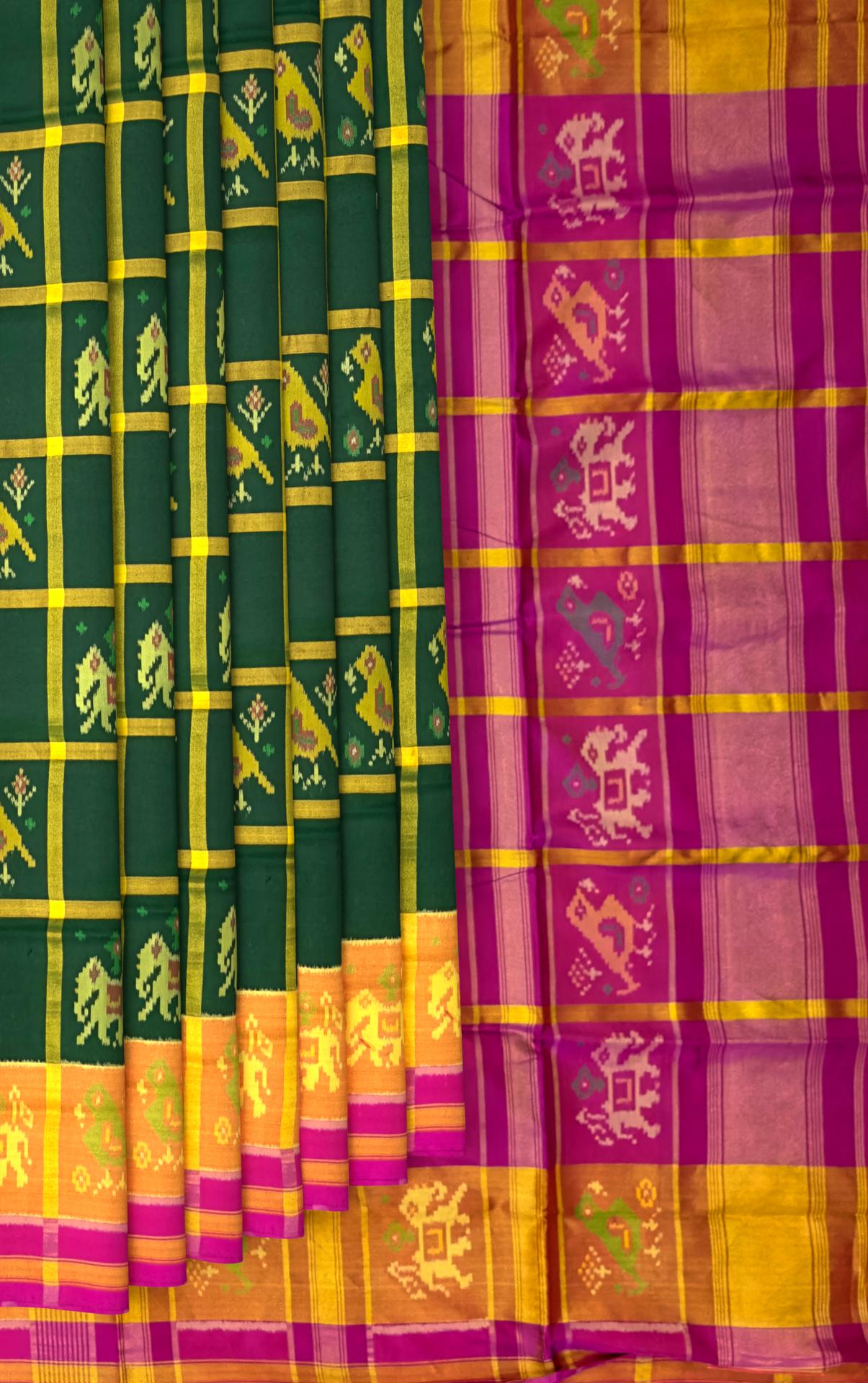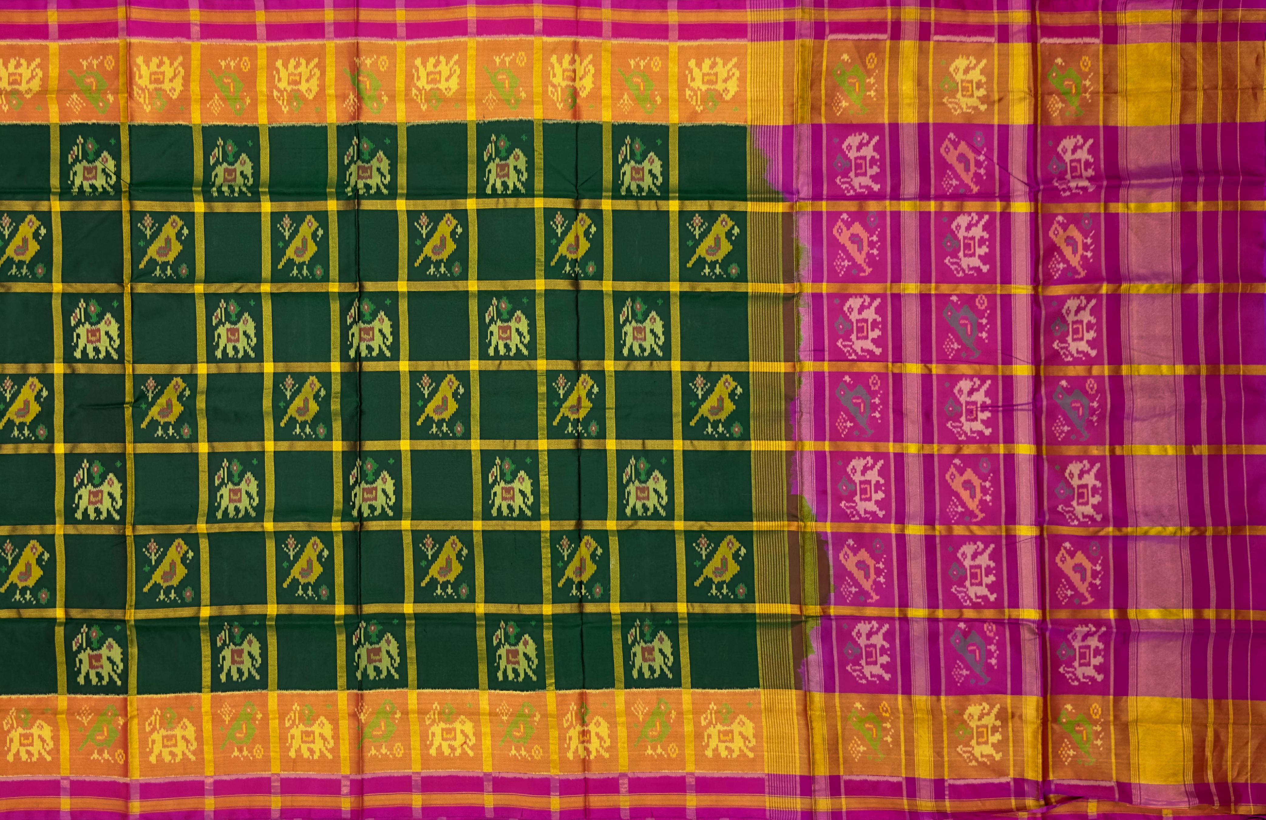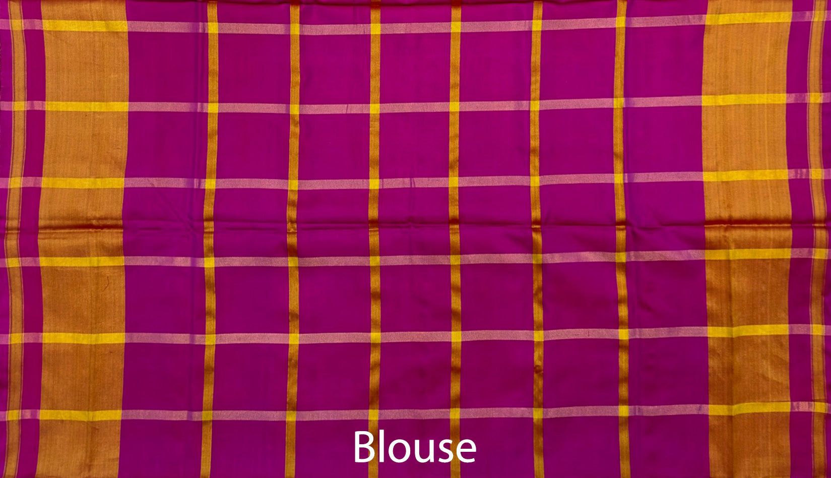 The Green Check Jari Checks Saree with bottle green and purple hues offers a unique style for sophisticated gatherings. Its intricate Hathi Popat patterns make it a standout choice for those who value craftsmanship and detail.