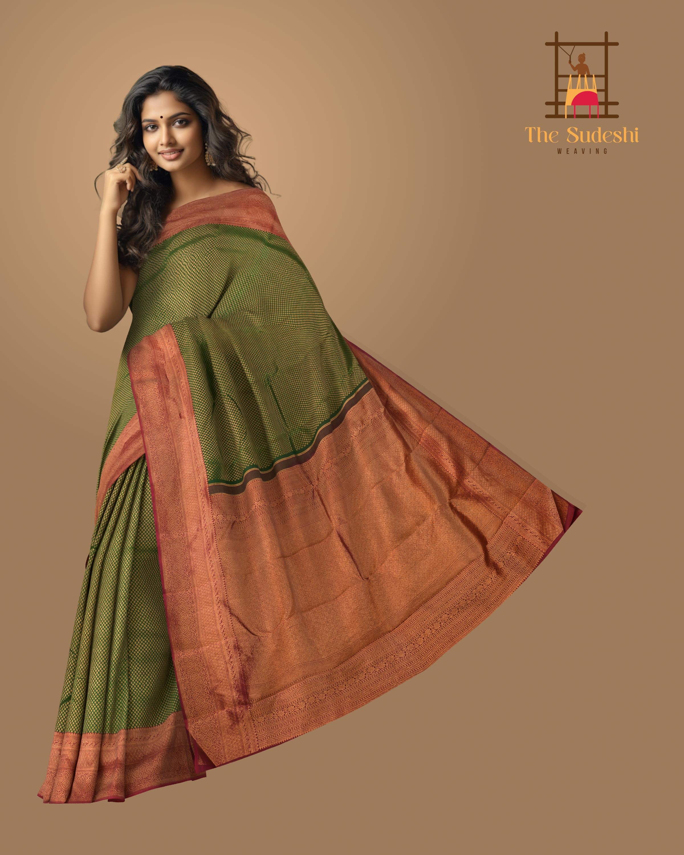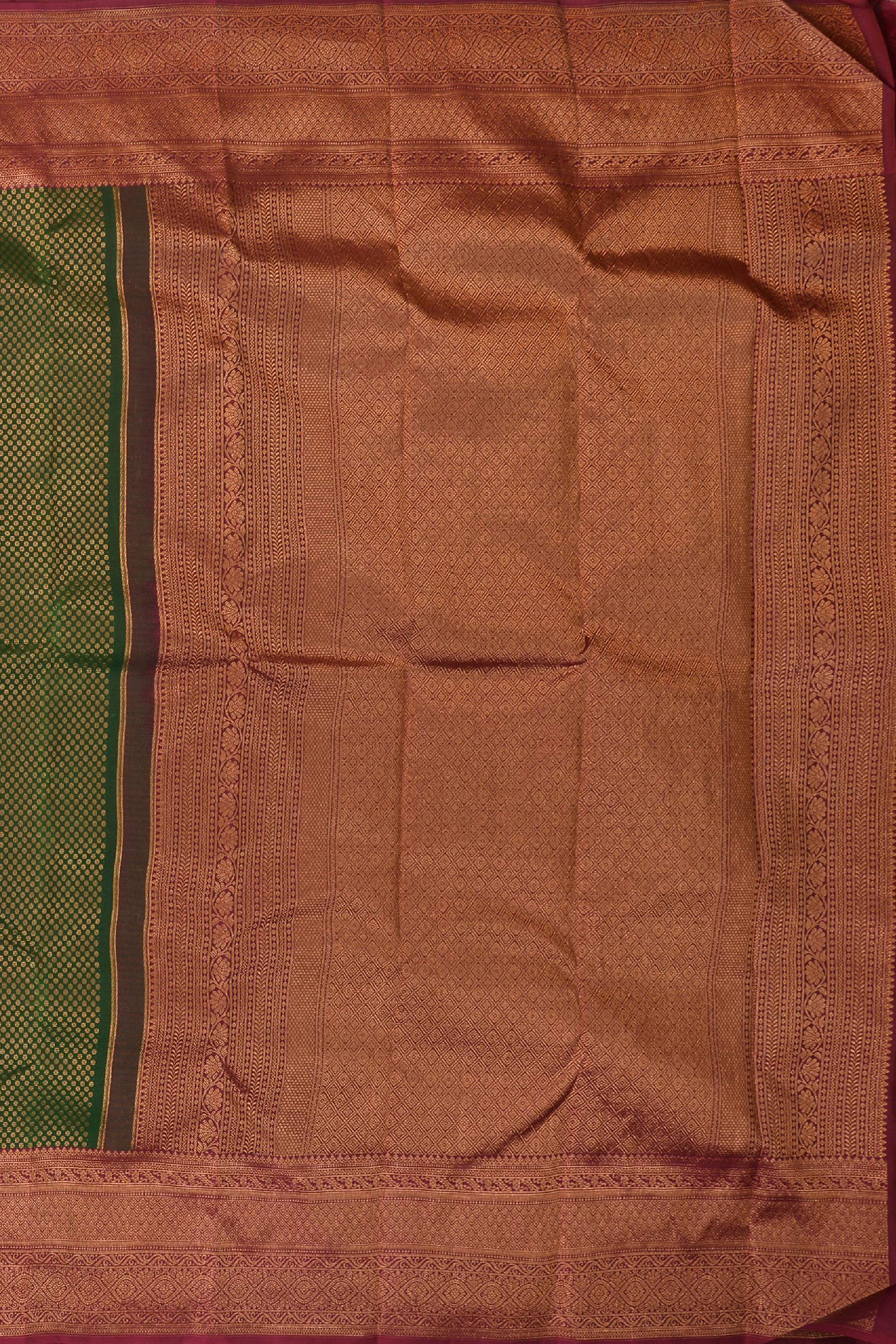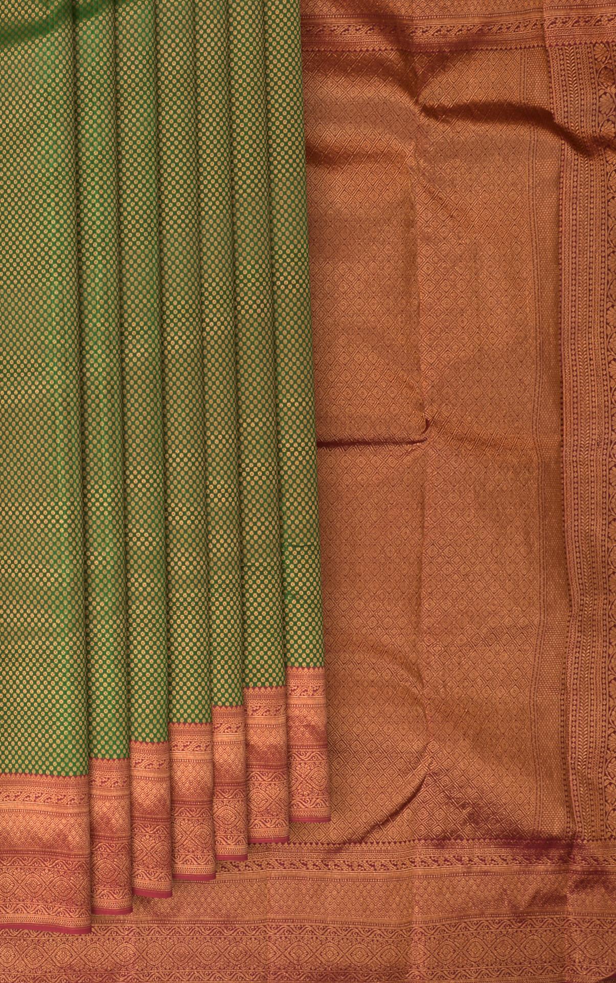 Delve into the depth of nature's palette with our Green Kancheevaram silk saree. Featuring jacquard with copper zari and small buttas, this saree is a celebration of life and vitality. The contrast Maroon border is grandly designed, incorporating diamond motifs, floral patterns, and the mythical mayil kan, symbolizing wisdom and grace.
