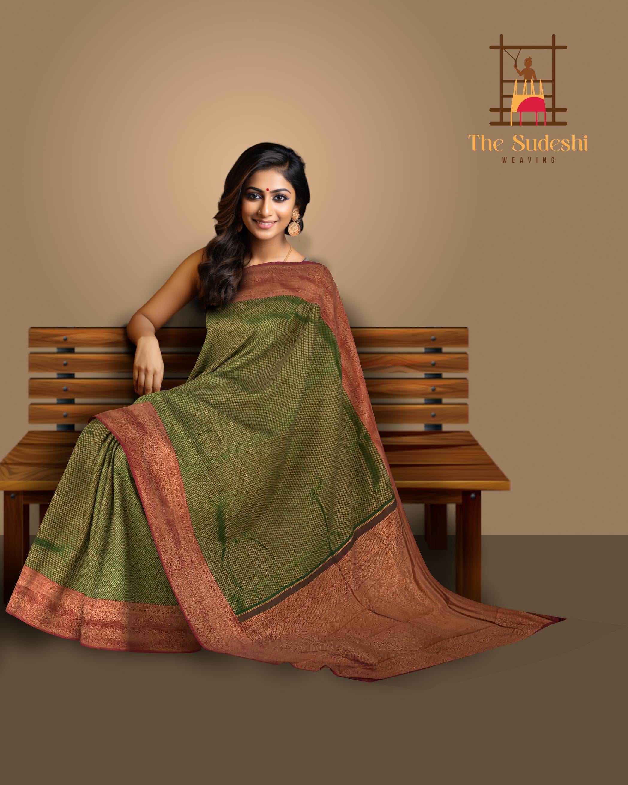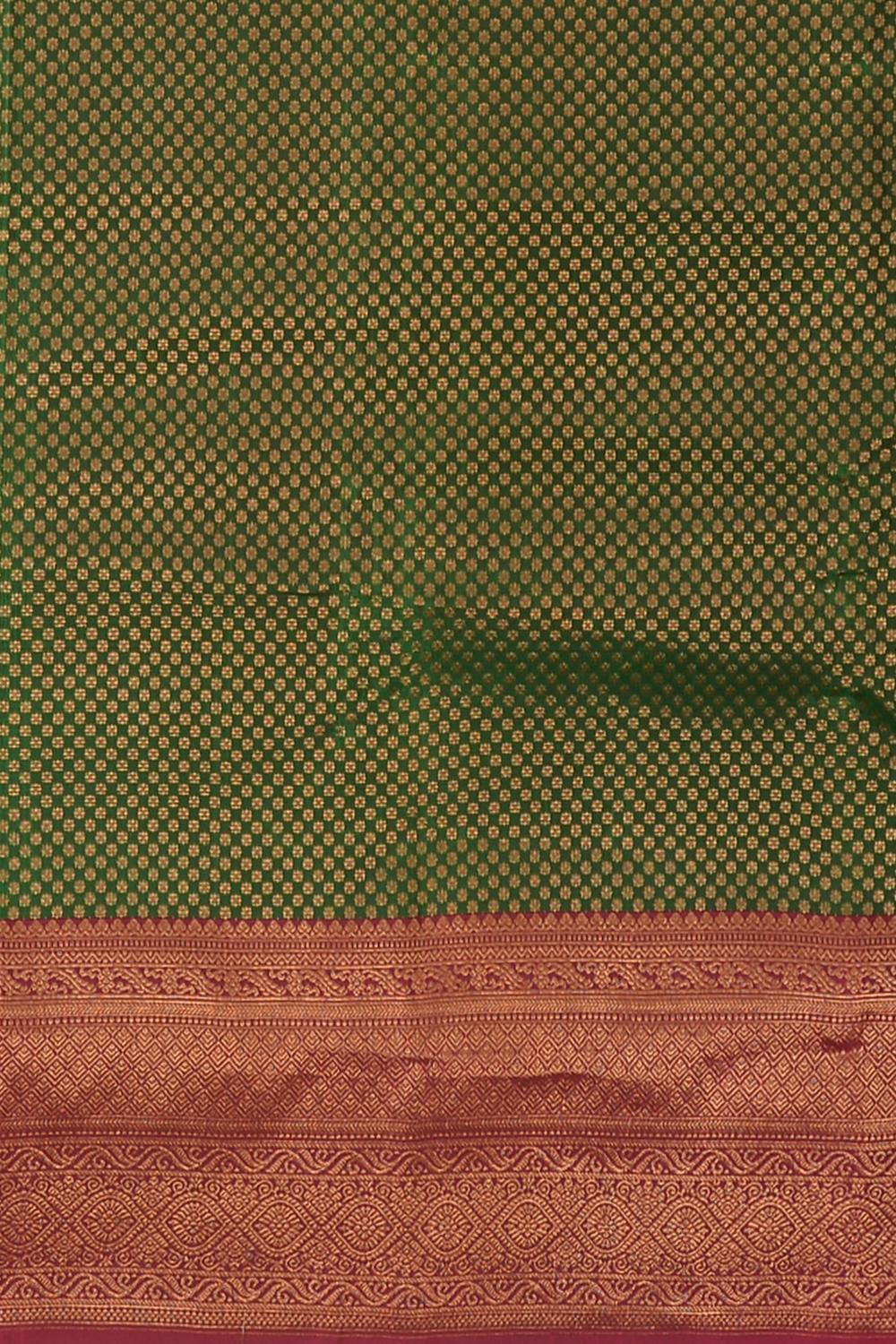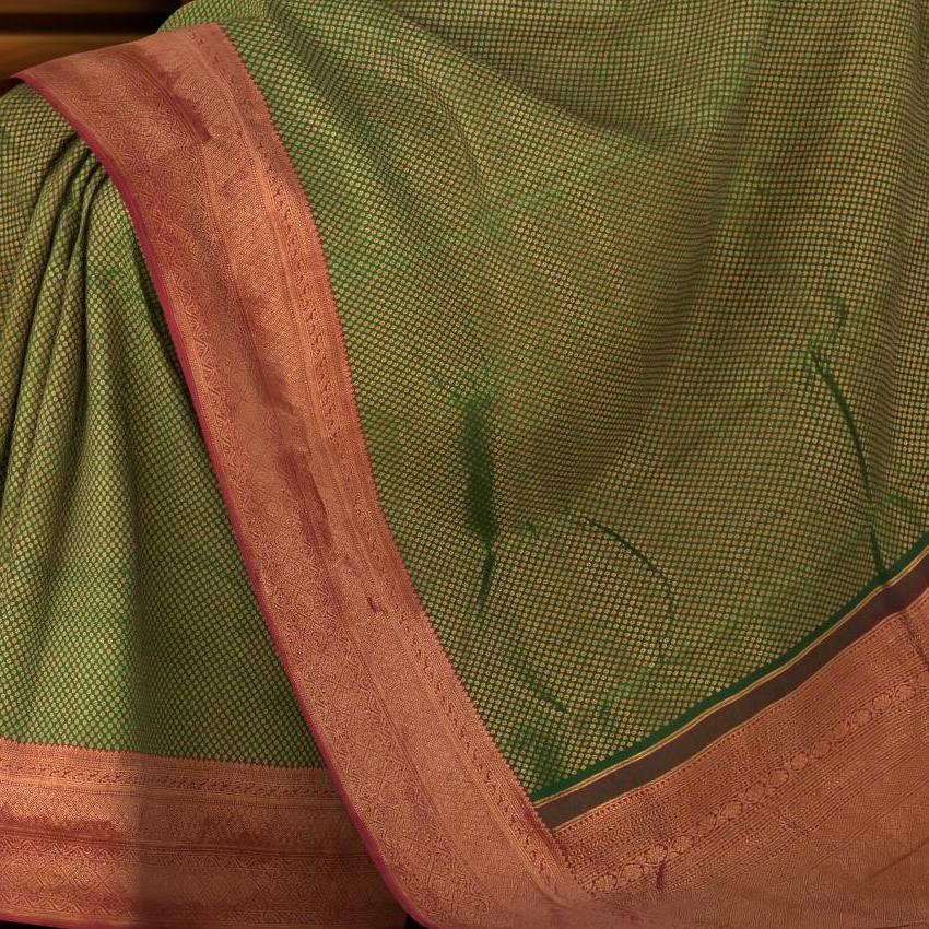 Delve into the depth of nature's palette with our Green Kancheevaram silk saree. Featuring jacquard with copper zari and small buttas, this saree is a celebration of life and vitality. The contrast Maroon border is grandly designed, incorporating diamond motifs, floral patterns, and the mythical mayil kan, symbolizing wisdom and grace.