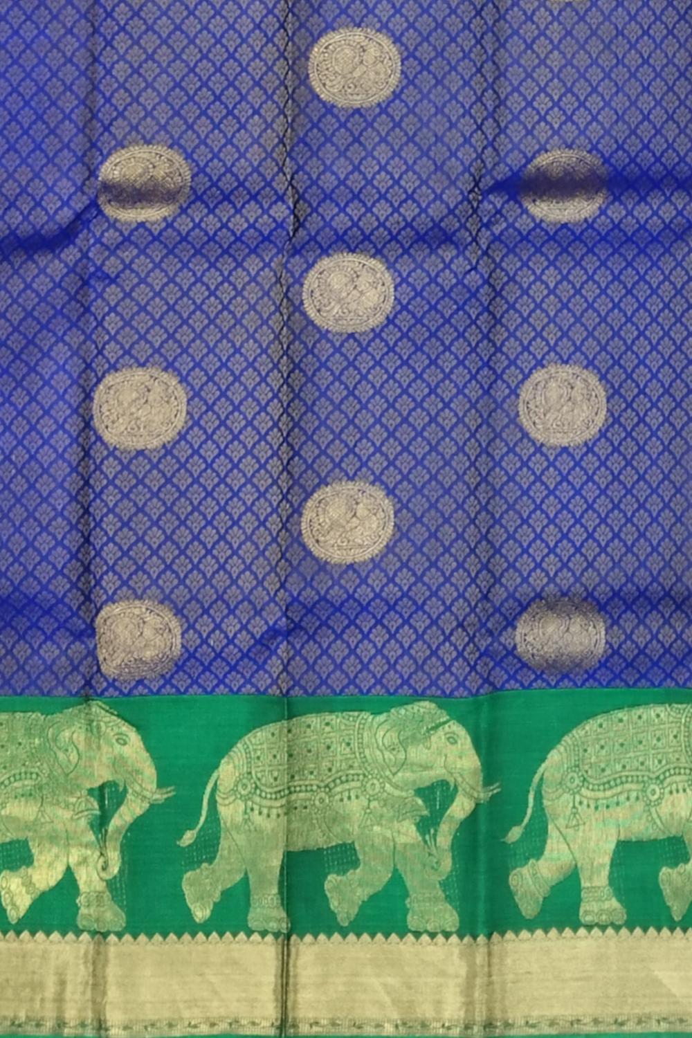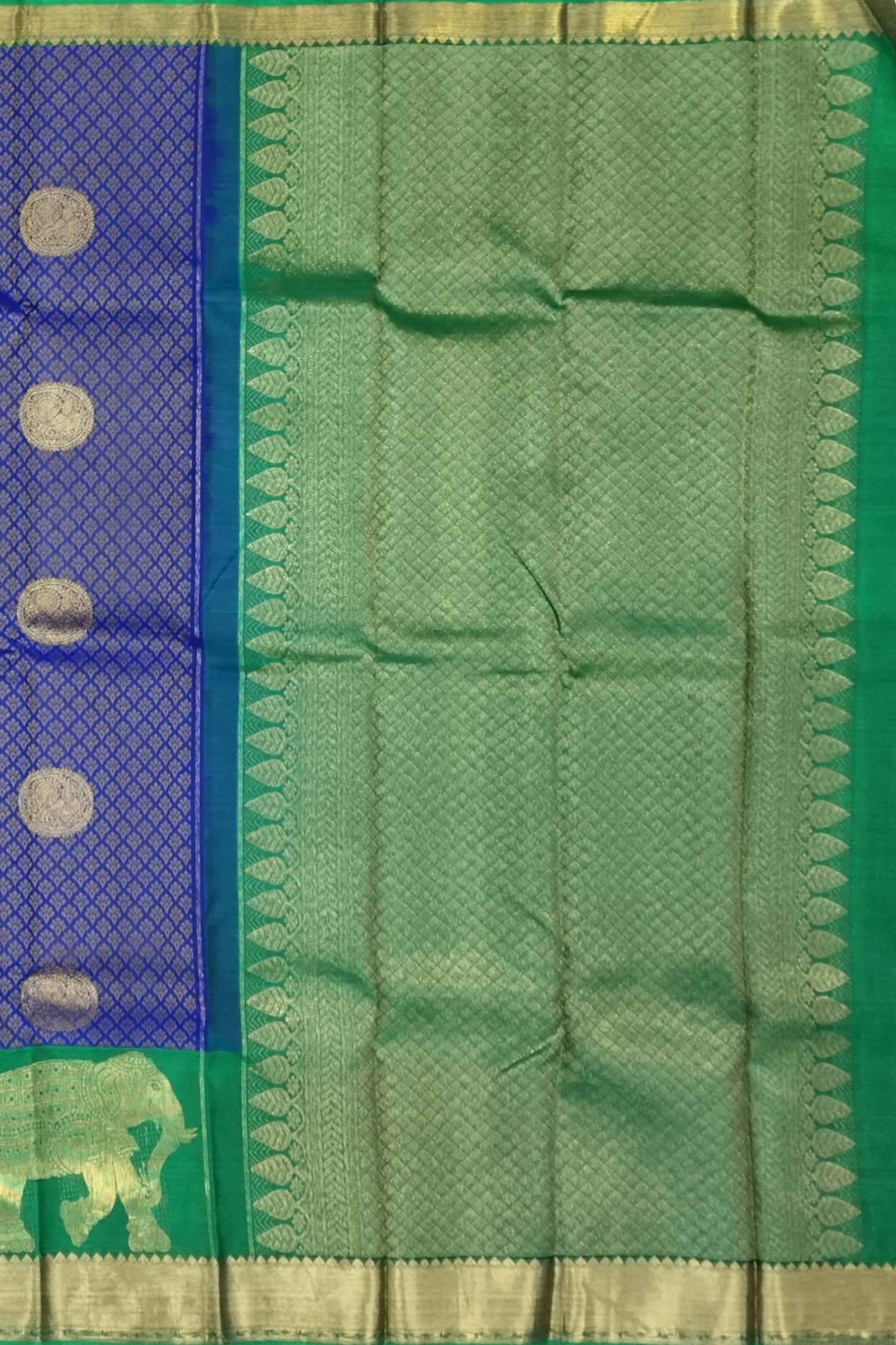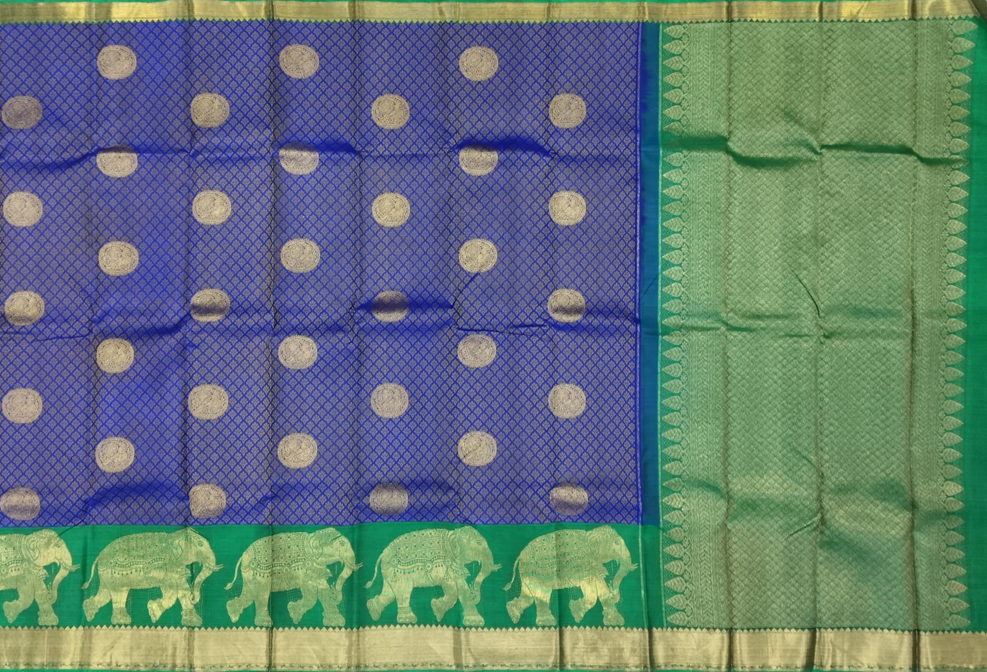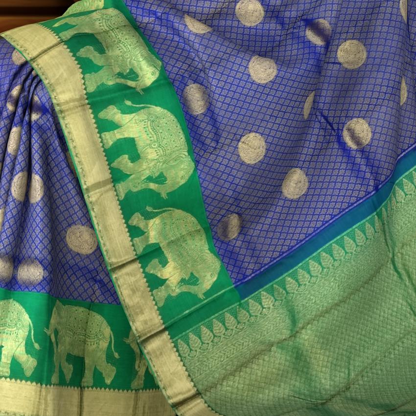 Symbolic and opulent, this green Kanchipuram silk saree is adorned with annam (mythical swan) bhutta motifs and a majestic elephant design along the border. The jacquard weave lends intricate texture, bringing the motifs to life with rich detail.