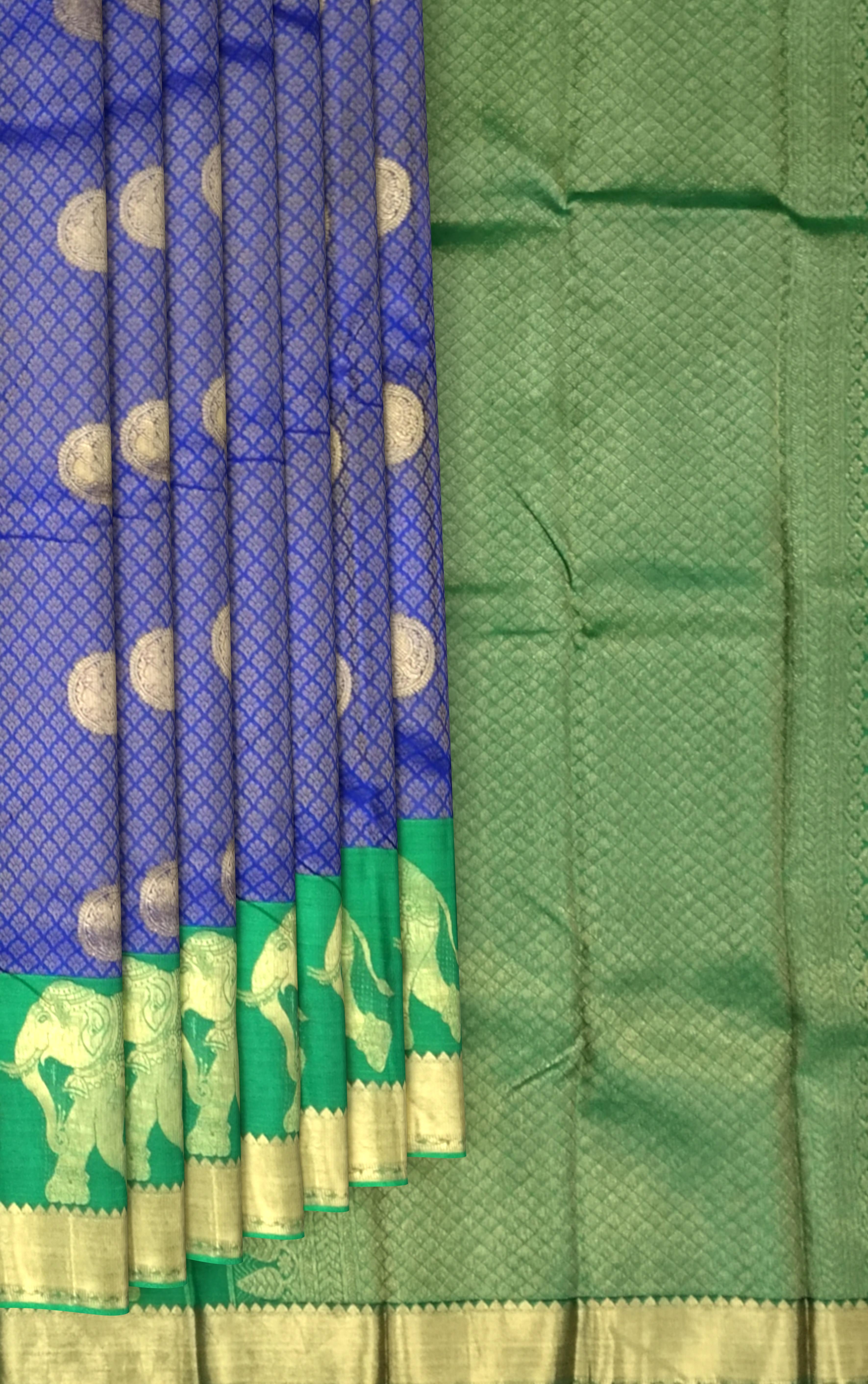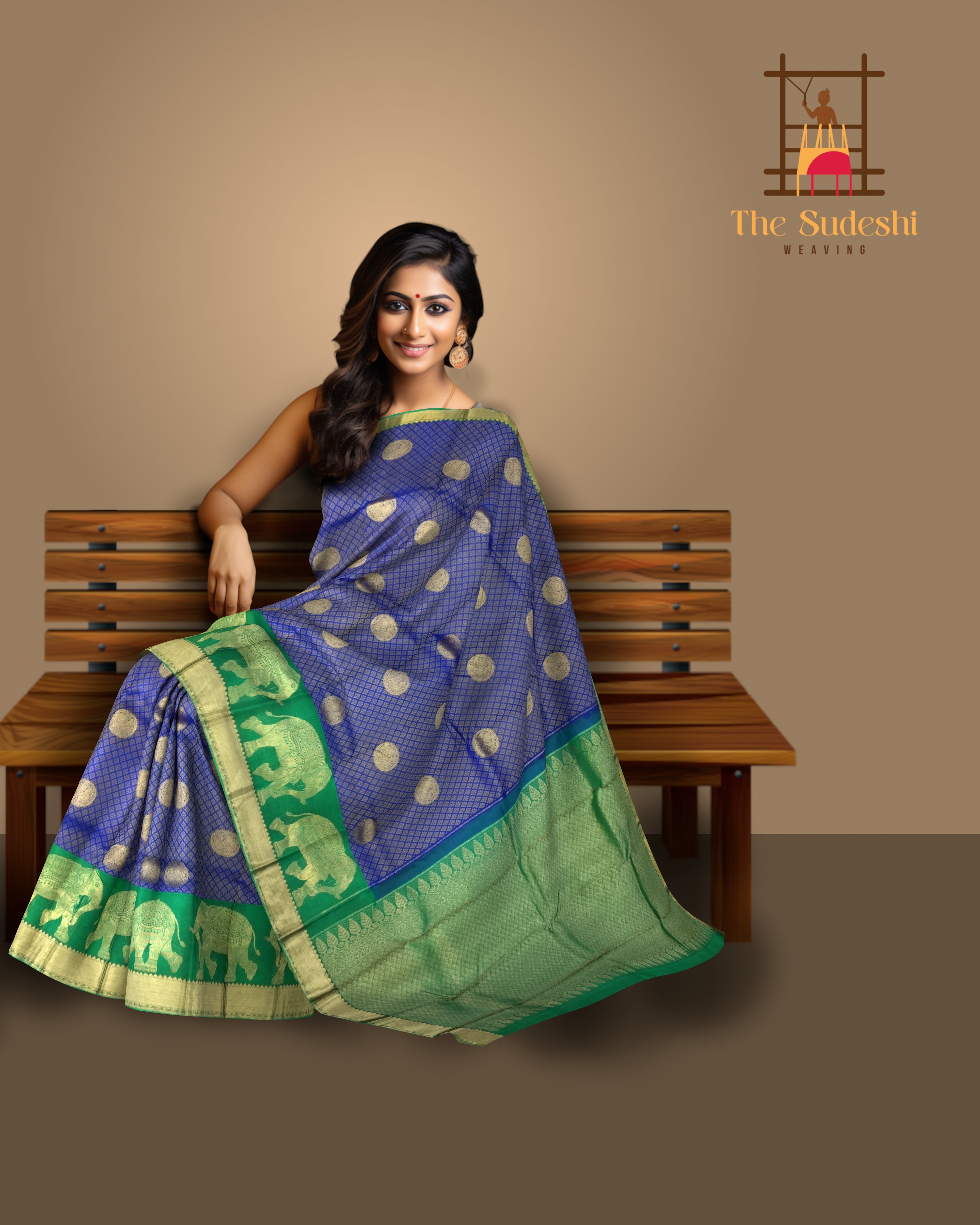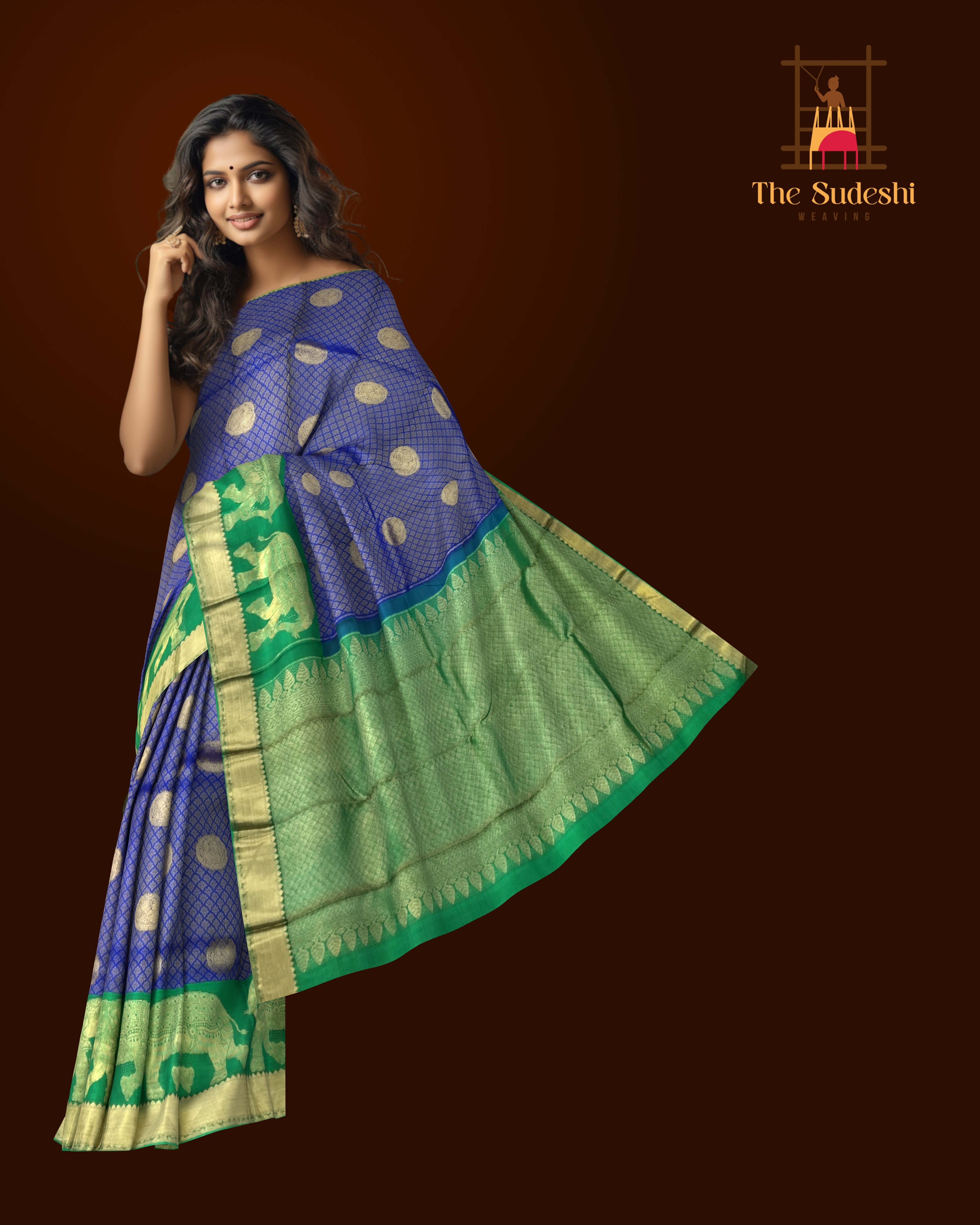 Symbolic and opulent, this green Kanchipuram silk saree is adorned with annam (mythical swan) bhutta motifs and a majestic elephant design along the border. The jacquard weave lends intricate texture, bringing the motifs to life with rich detail.