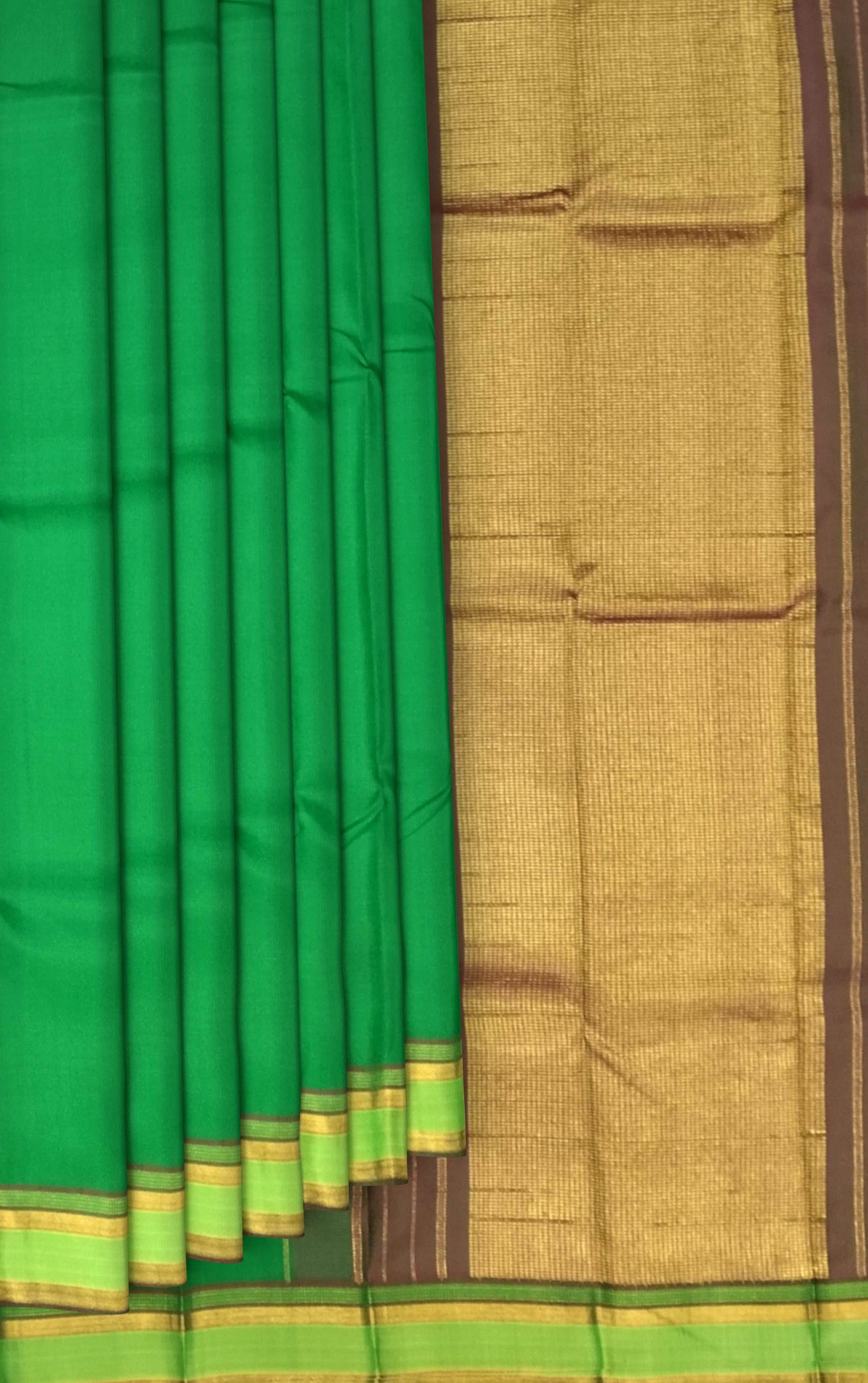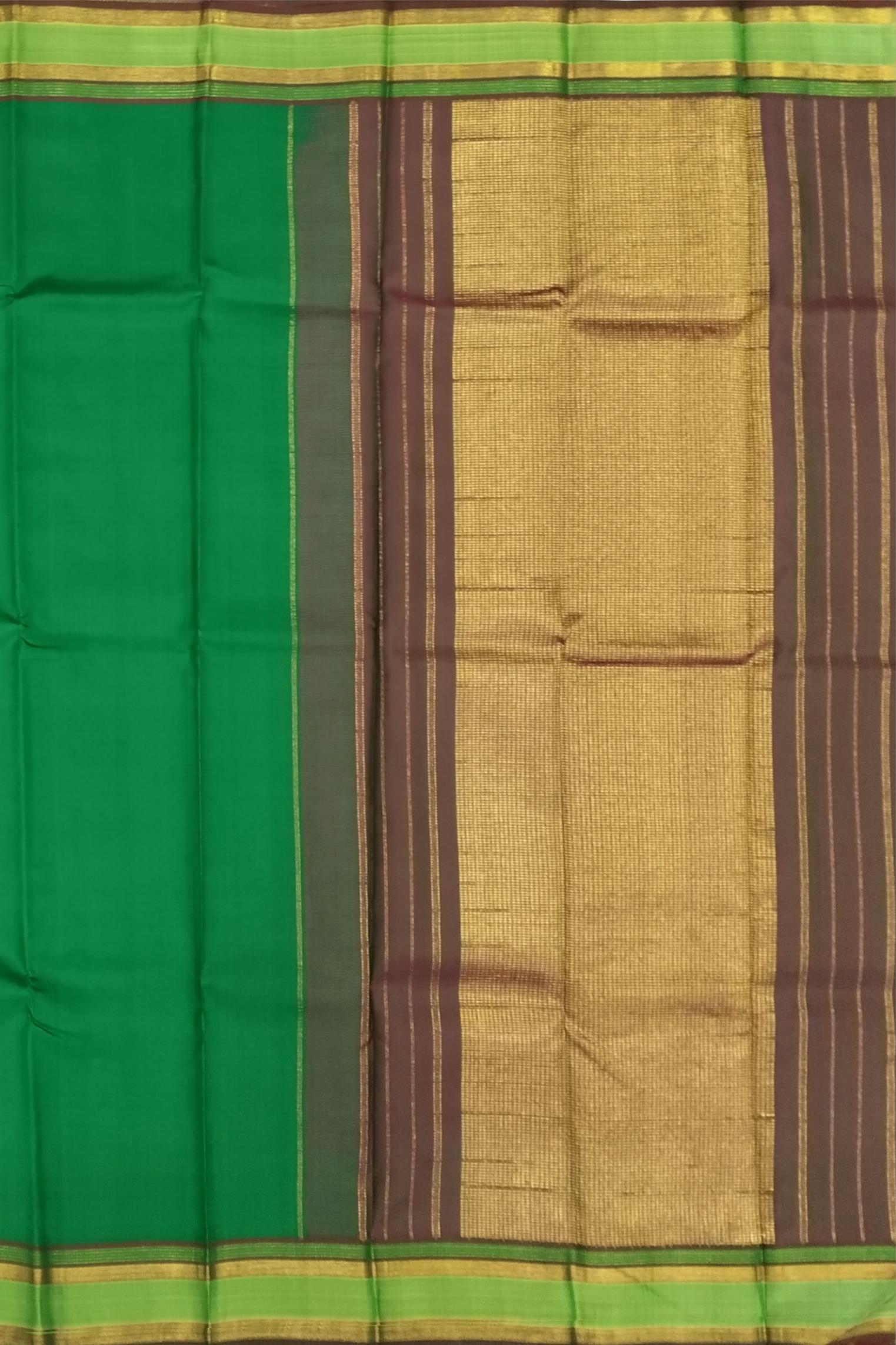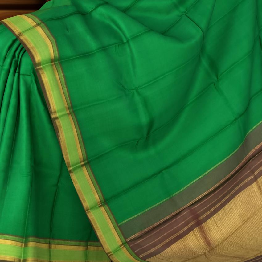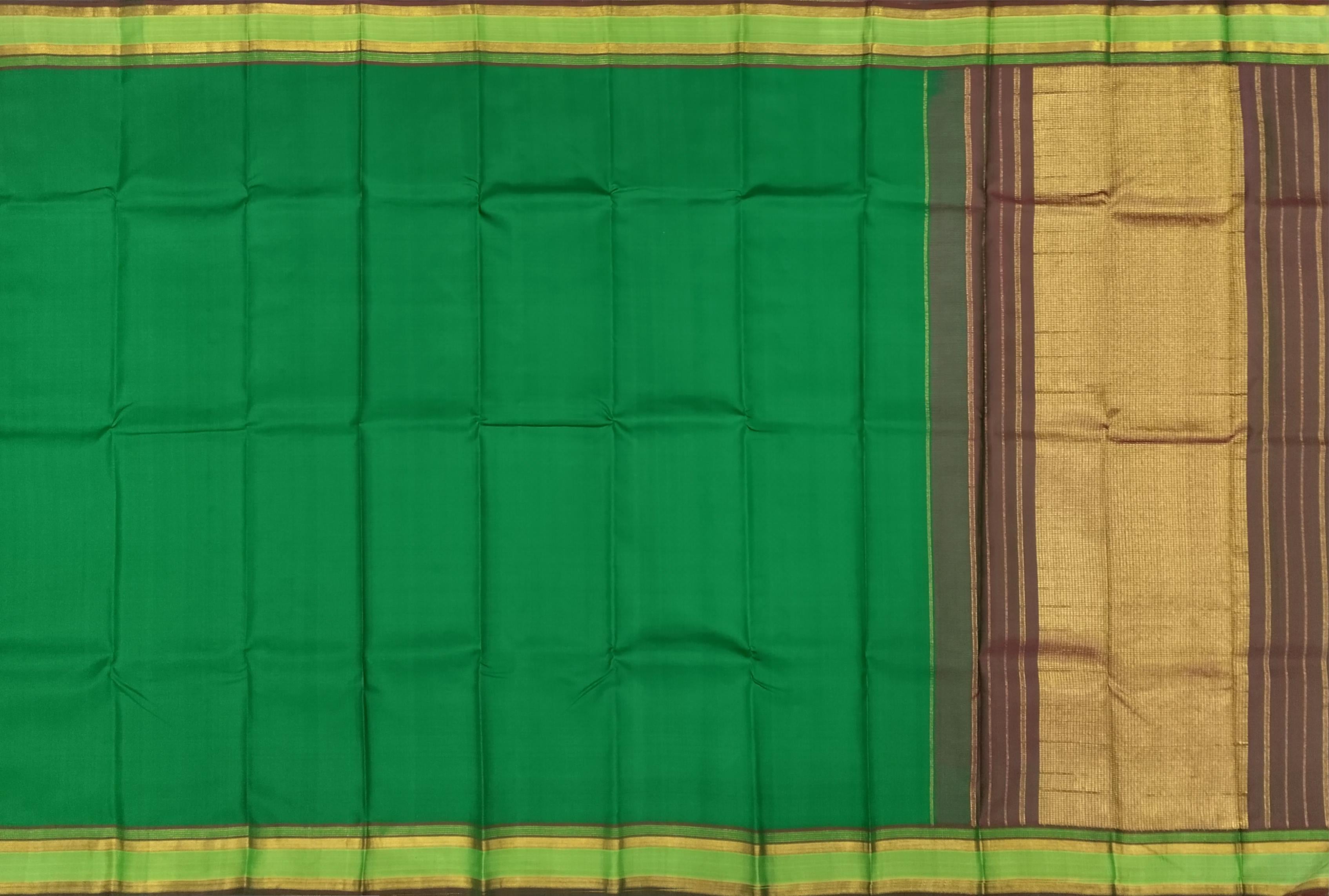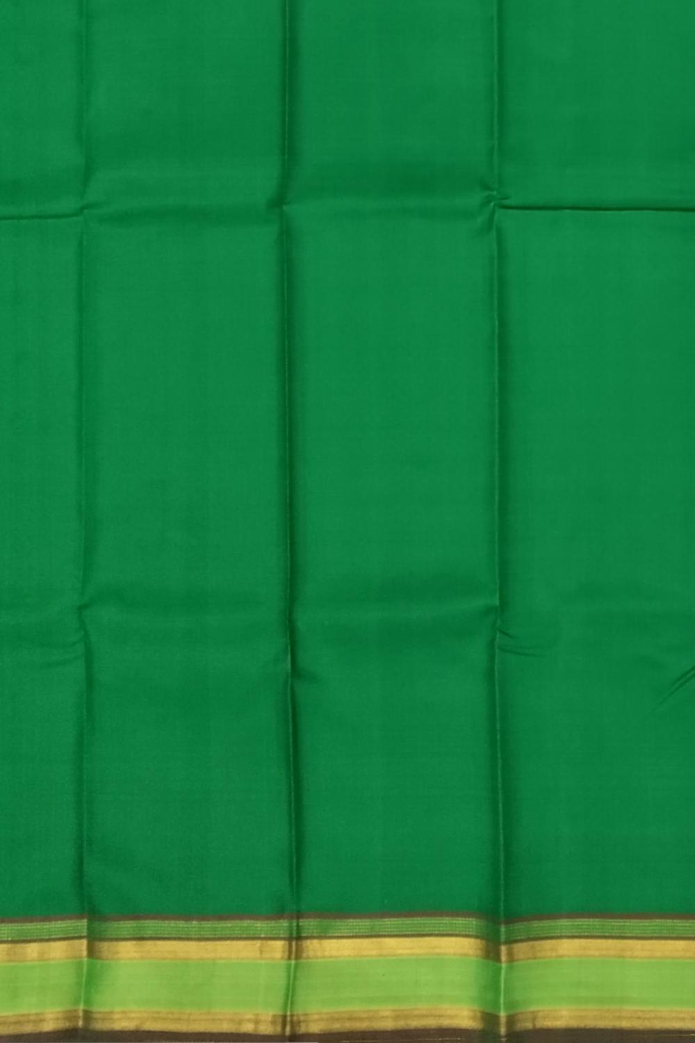 Kanchipuram sarees are more than just attire—they are woven expressions of cultural pride and meticulous artistry. The choice of green in this saree is significant, representing fertility, prosperity, and new beginnings. Handwoven in pure silk, the simplicity of this design highlights the weave’s impeccable finish and natural brilliance.
