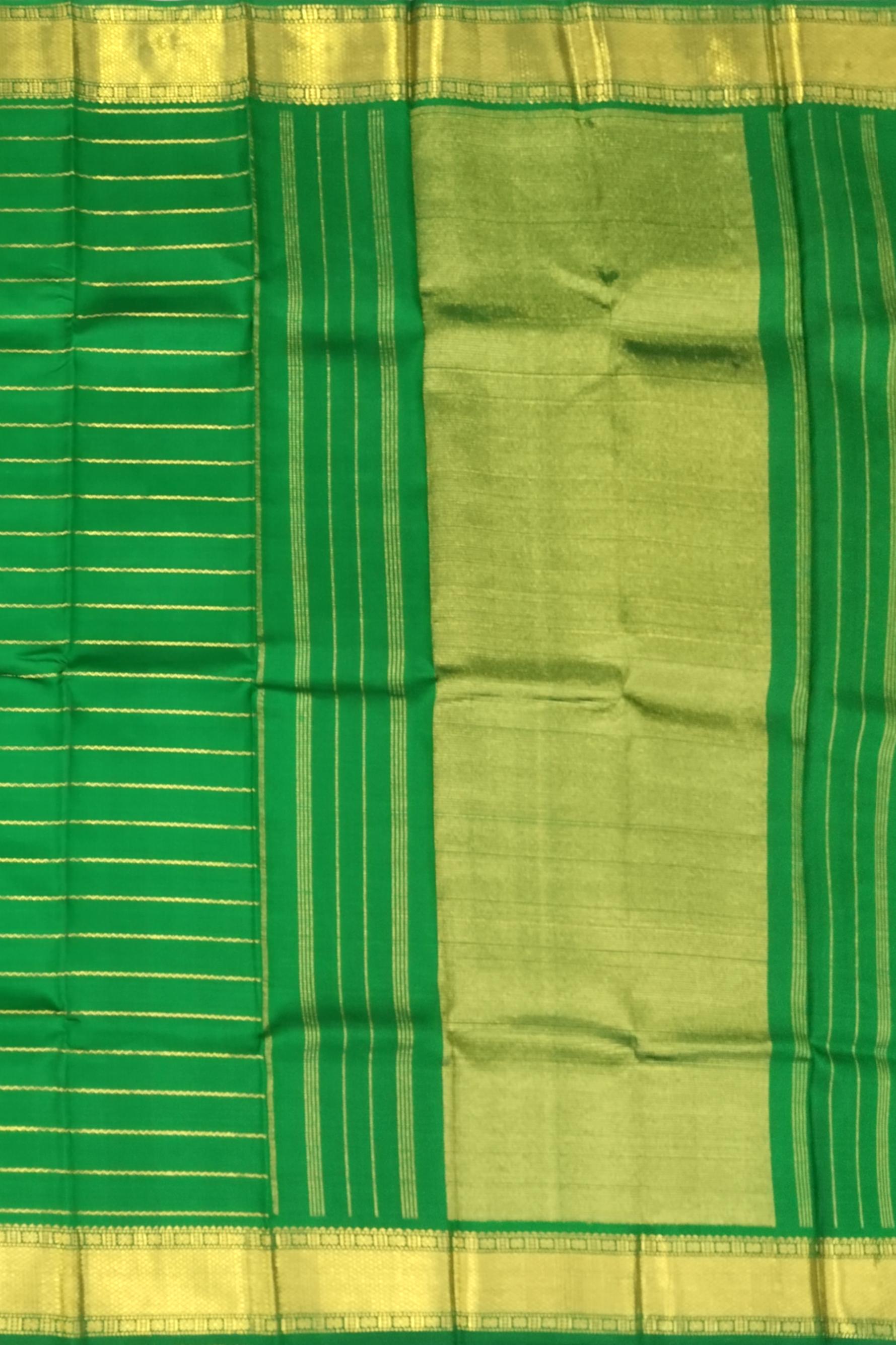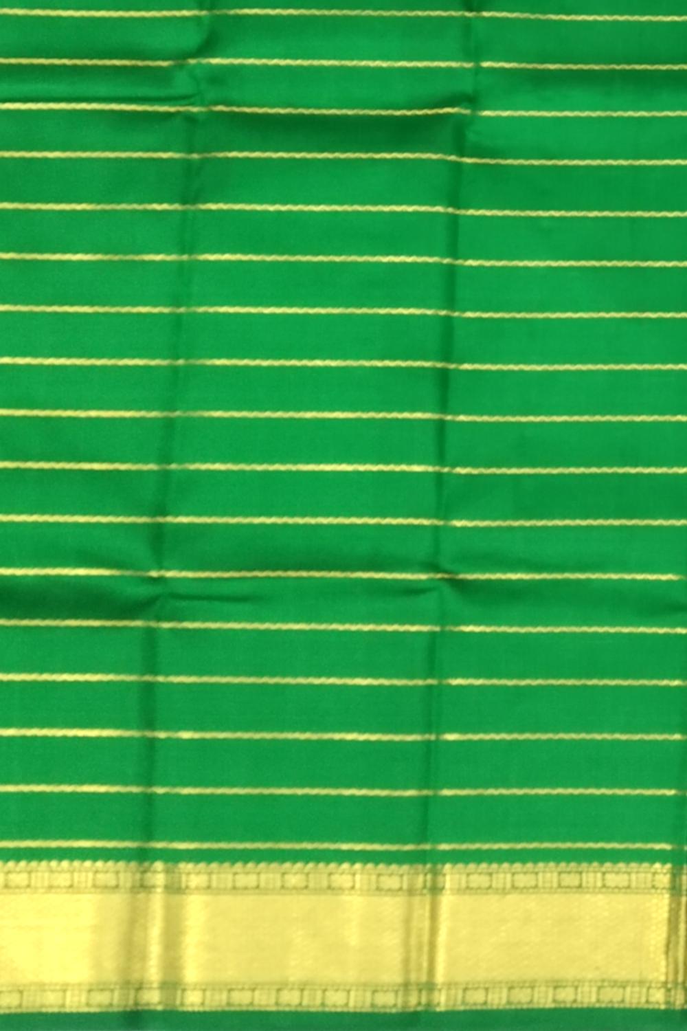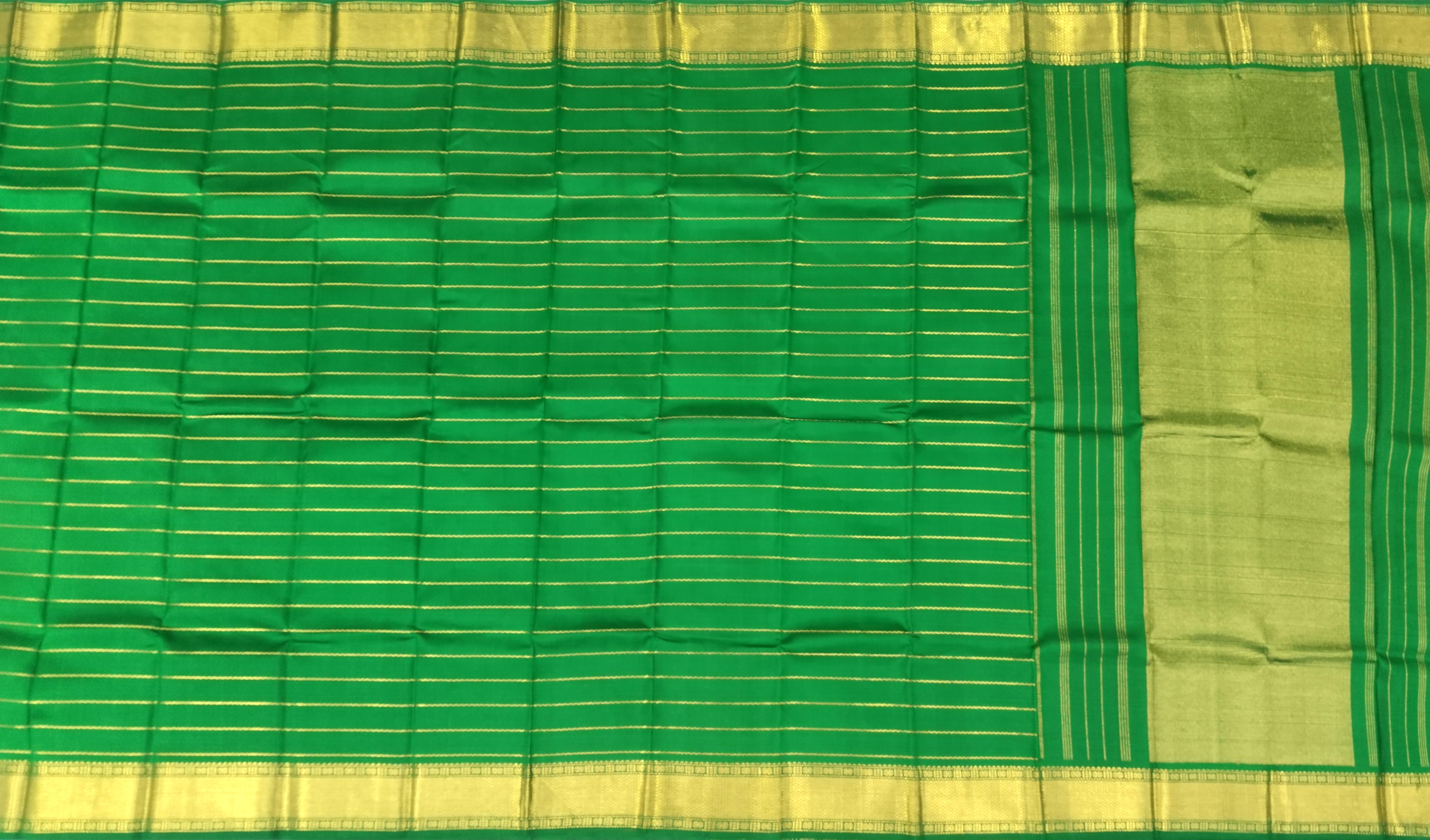 A symbol of grace and tradition, this Green Kanchipuram Silk Saree showcases a distinctive horizontal veldhari pattern across the body. The self-border enhances the saree’s minimal yet majestic aesthetic, allowing the intricate weaving and natural sheen of silk to shine. It’s a perfect example of refined beauty for the modern woman rooted in tradition. Crafted in the weaving heart of Tamil Nadu, Kanchipuram pure silk sarees are known for their fine texture and lasting quality. Every saree is a tribute to the skilled artisans who have preserved this heritage art form for generations. This saree is perfect for festive functions, temple events, and cultural occasions. Pair it with a green or gold blouse, complemented by traditional jewellery and a sleek hairstyle, to complete your elegant ensemble. Note: The appearance of the product’s colors may vary due to lighting conditions or your device’s screen calibration. For further assistance or additional images/videos, feel free to contact us at +91 97897 60367 or email at wecare@thesudeshiweaving.com.