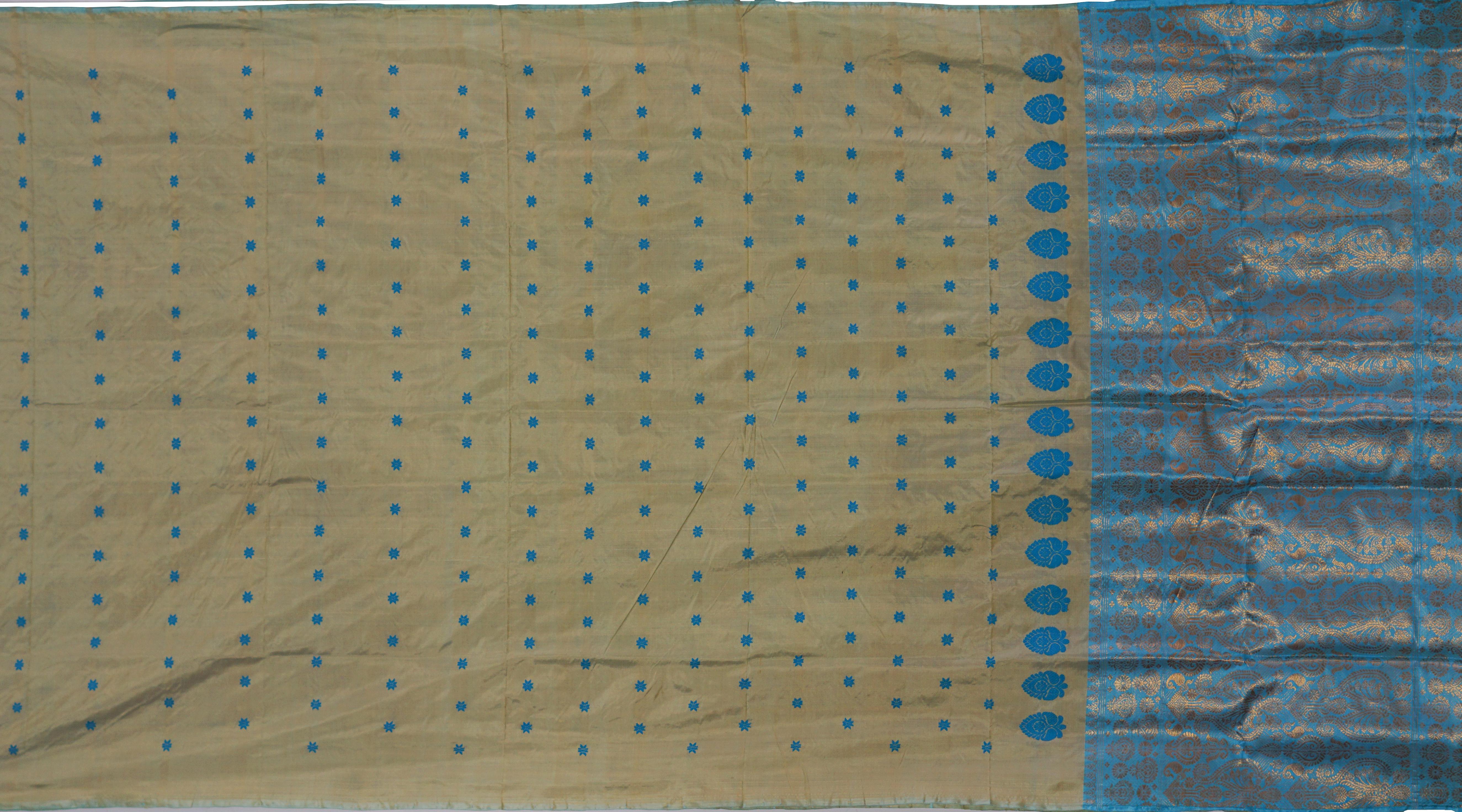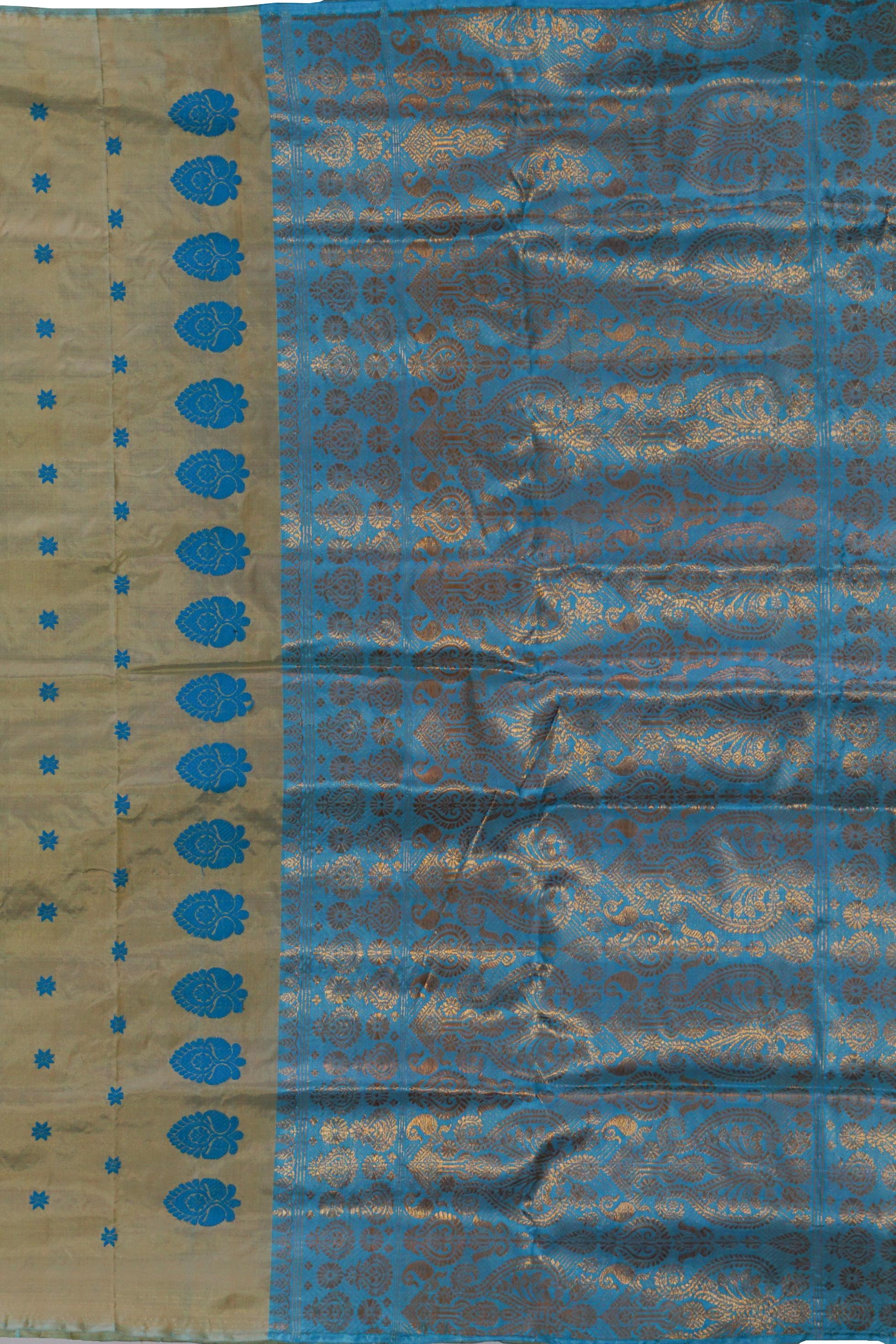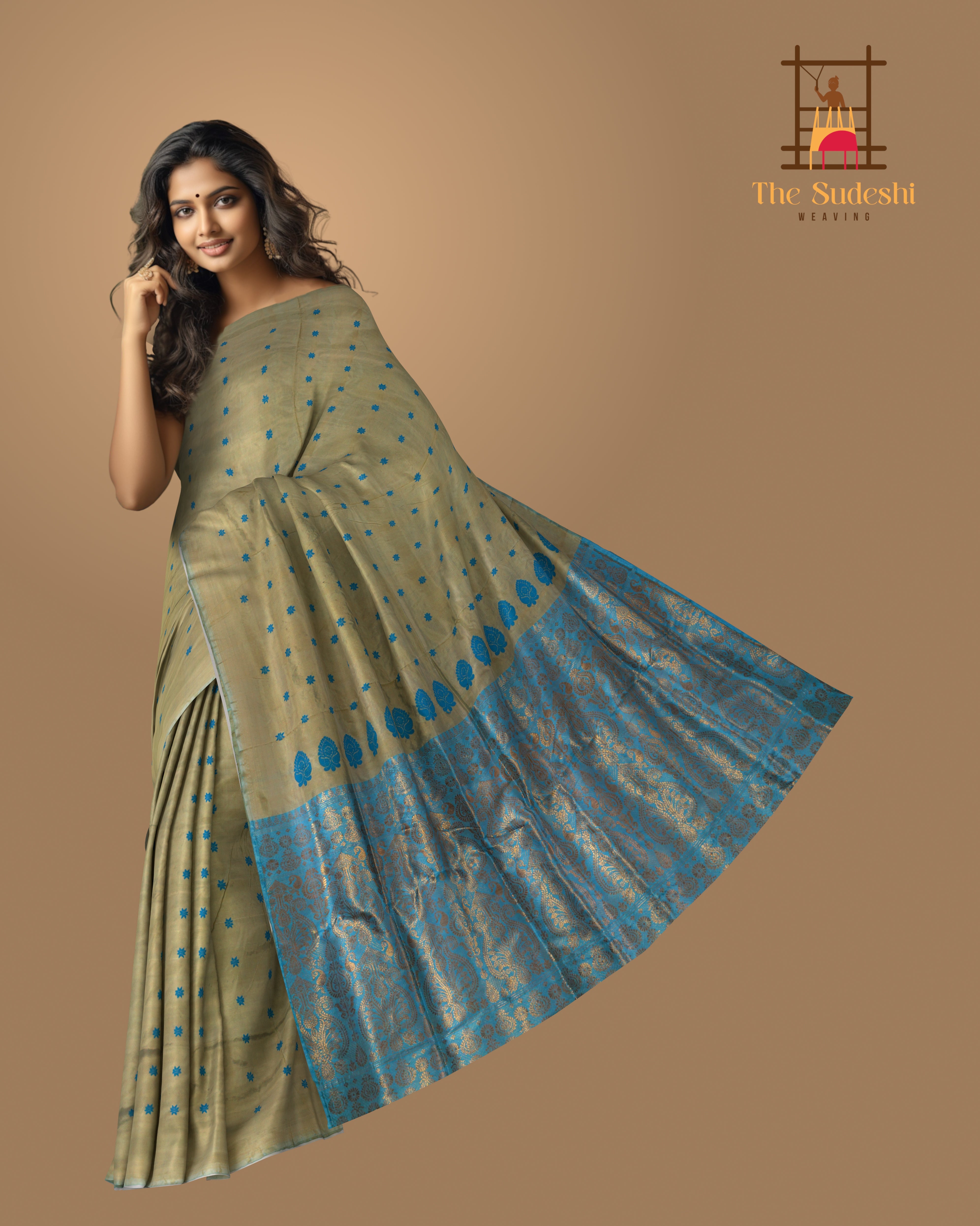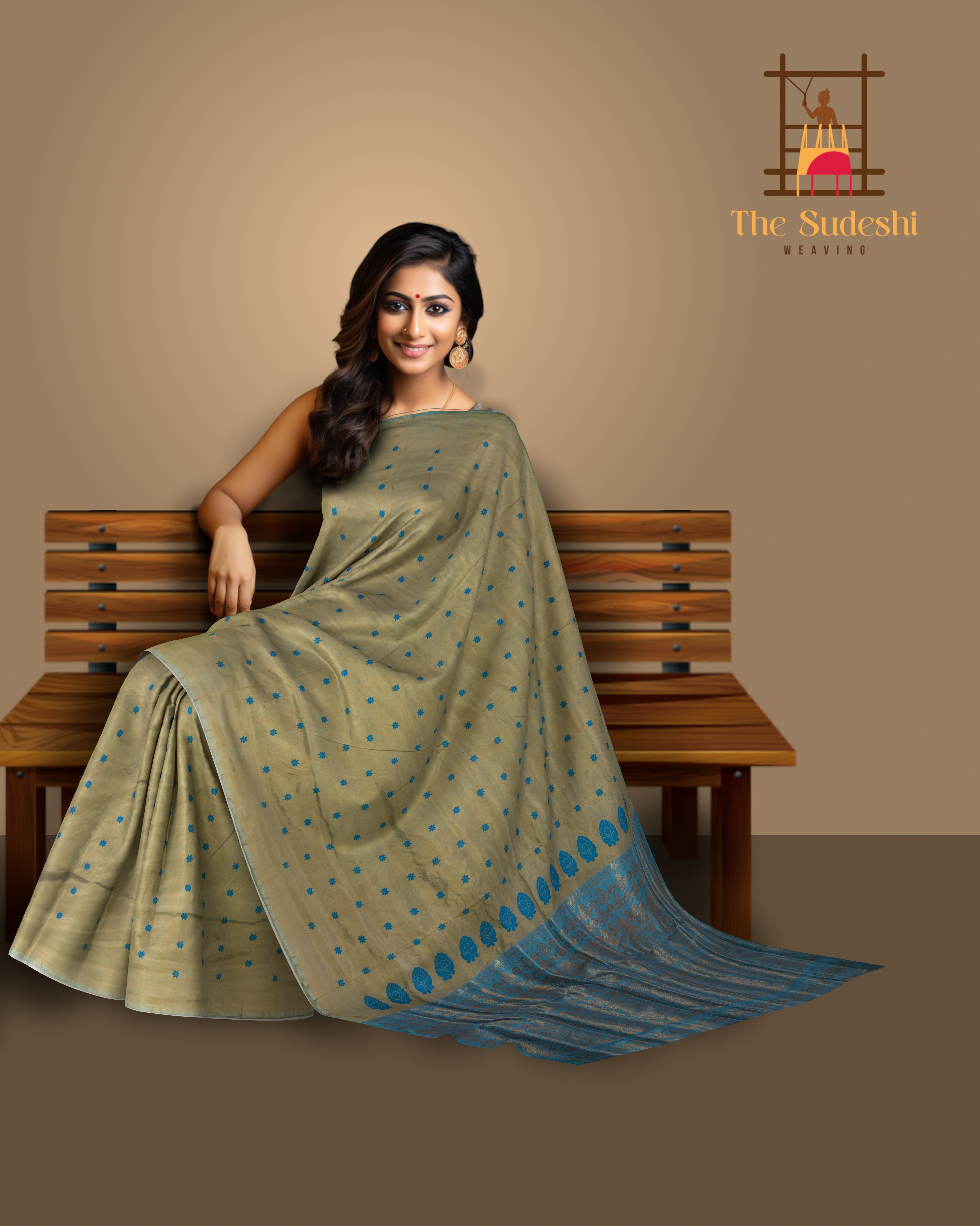 The motifs on this saree are inspired by Assamese culture and nature, featuring geometric and stylized patterns that symbolize flowers, plants, and traditional artifacts. These motifs, woven using the extra-weft technique and local zari, add a raised, embossed effect that enhances the saree's texture and depth. The combination of green and blue is both classic and contemporary, appealing to women of all ages.